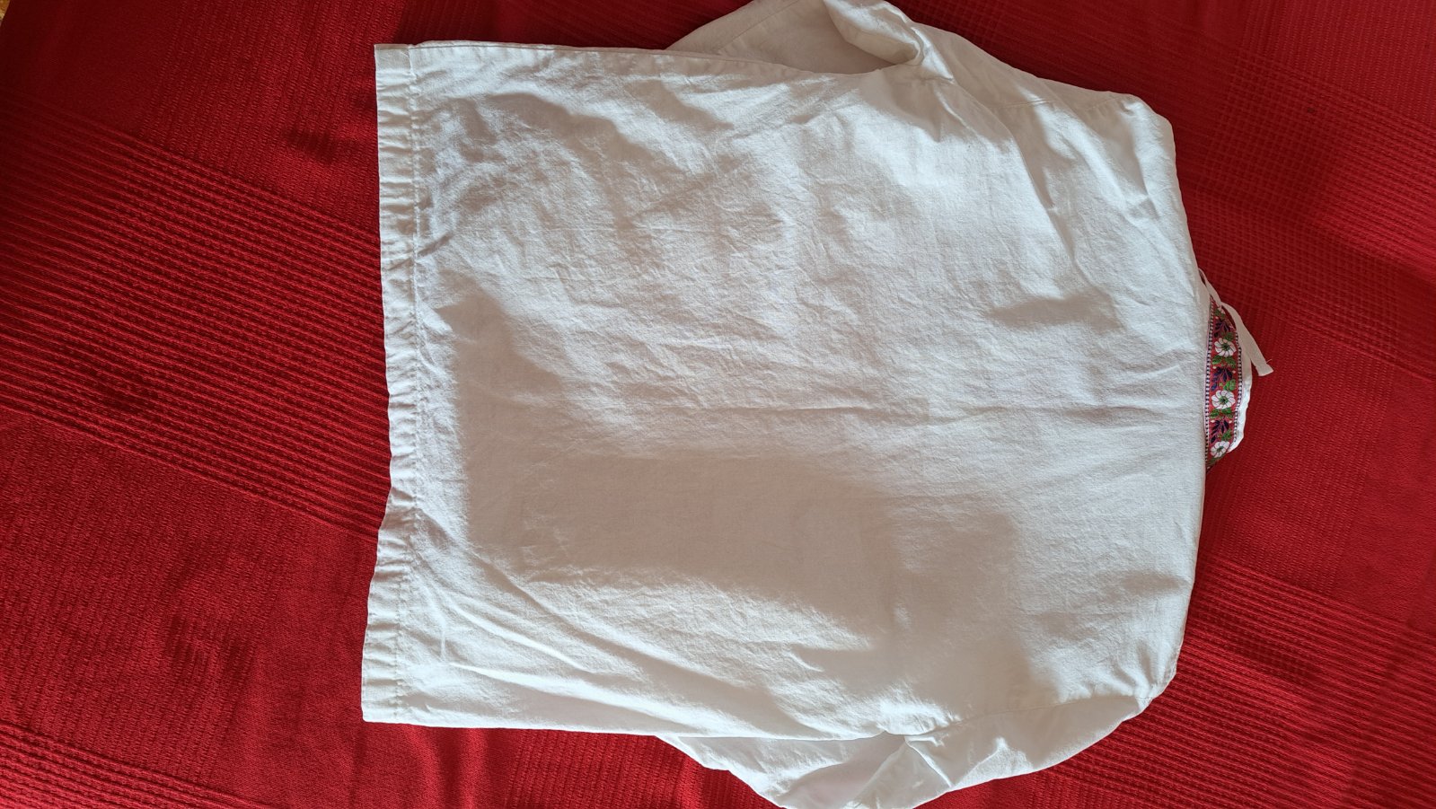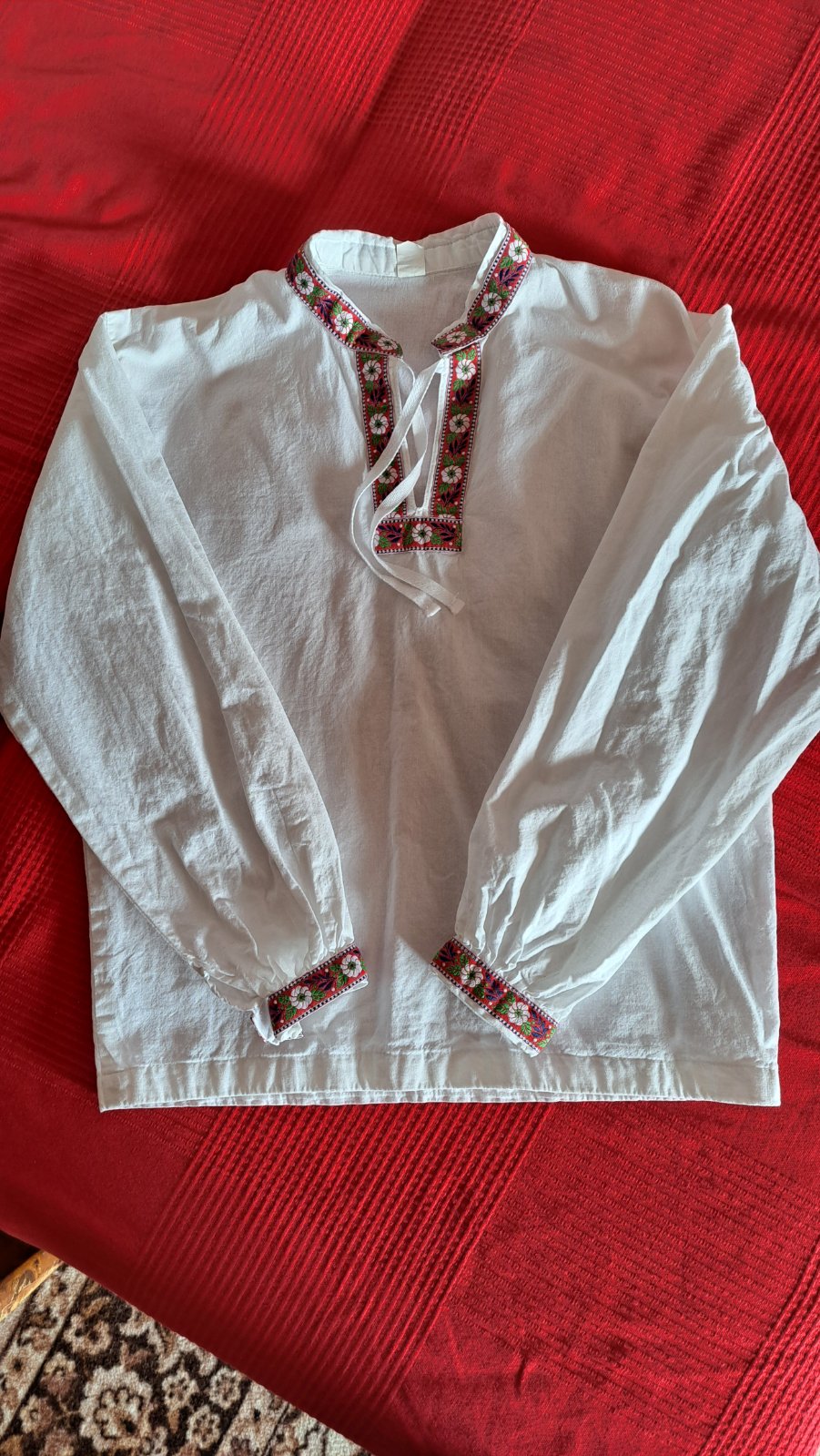 Predám veĺmi zachovalú,peknú, folklórny košelu,málo nosená,100 % bavlna, celková dĺžka 61 cm,od ramena rukáv 51,od pazuchy rukáv 44 cm. Veĺkosť asi 158-164.