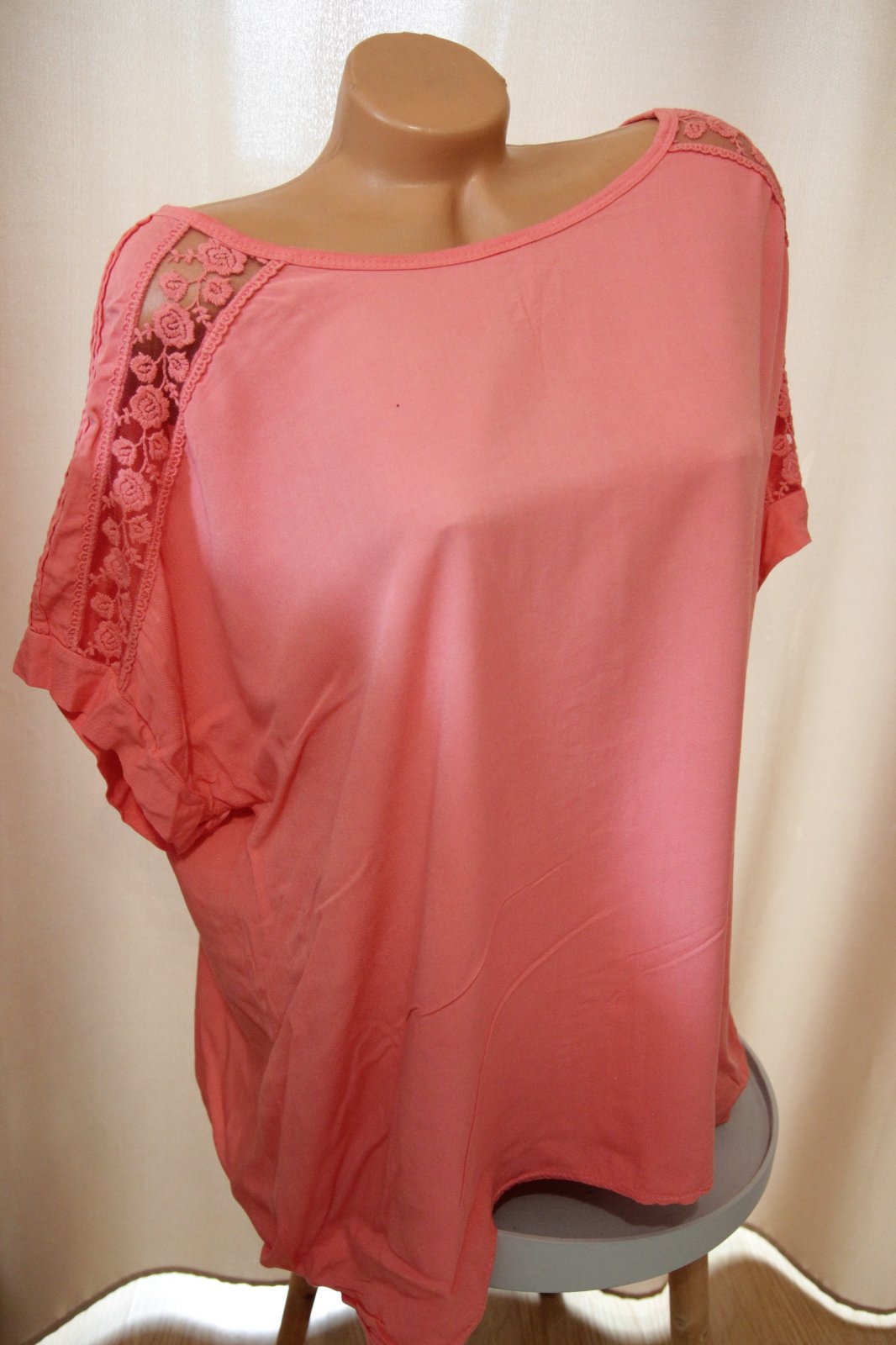 Korálový top s čipkou na rukávoch, veľkosť XXXXL. Materiál je 95% viskóza.
