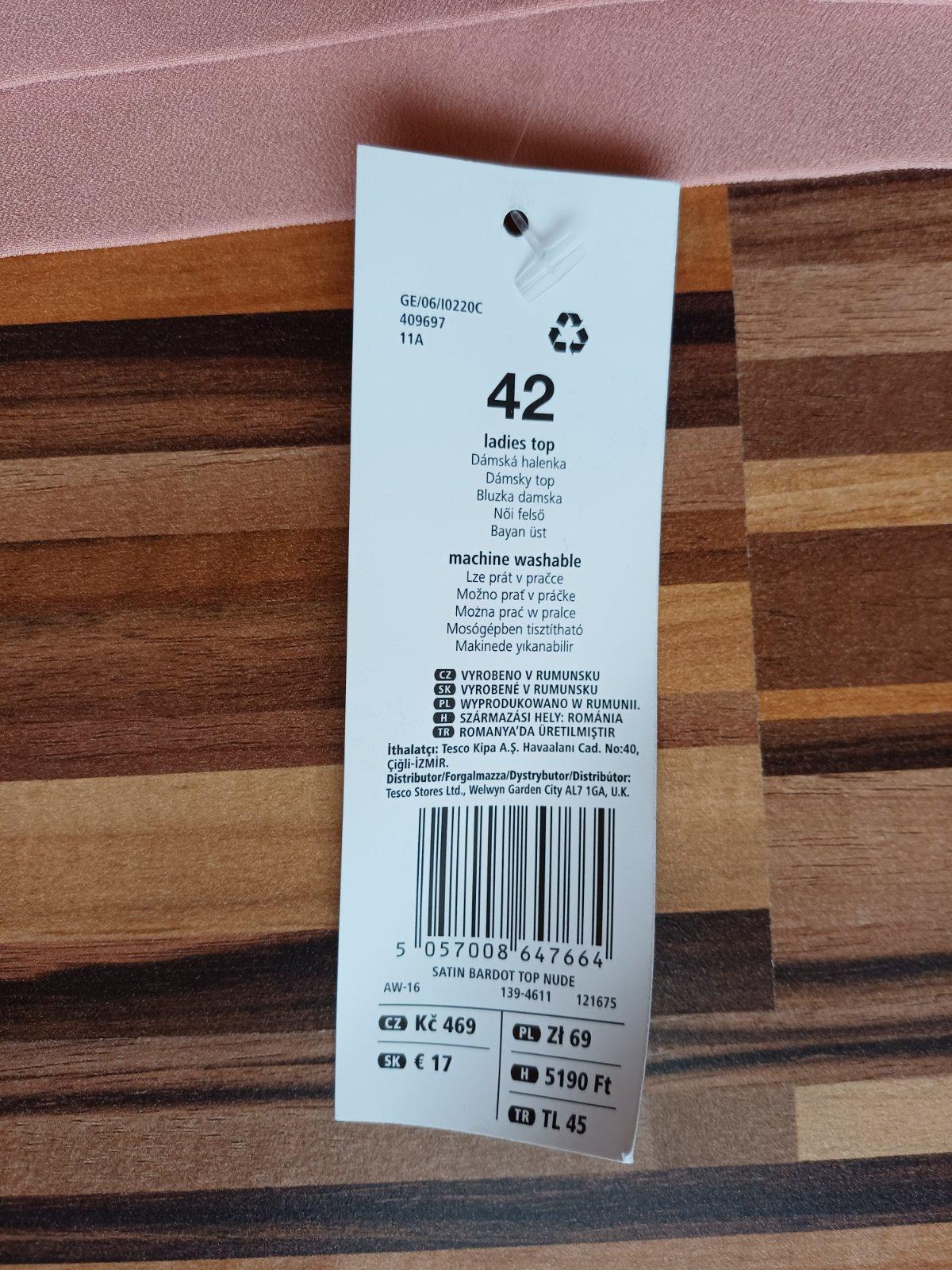 Nenosená ľahká padavá blúzka zn. F&F, veľ. 42. S visačkou. Odhalené ramená. Materiál 100% polyester. Rozmery: dĺžka od ramena po spodný okraj 61 cm, šírka cez prsia 53 cm (strih mierne do A).