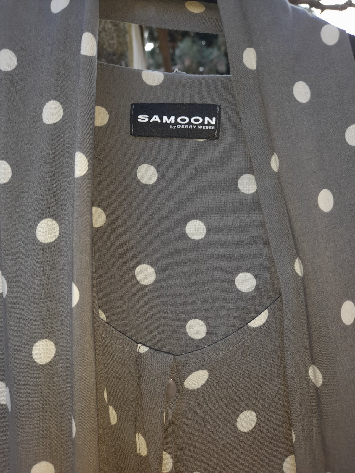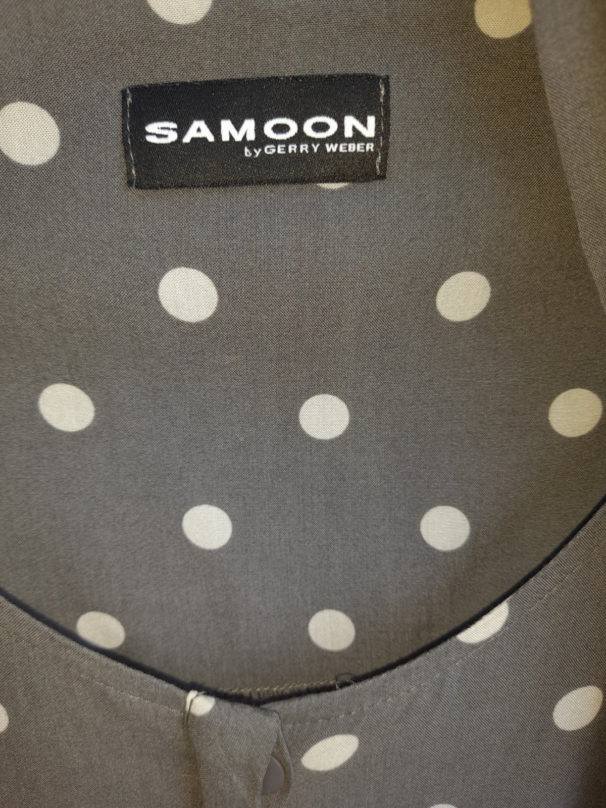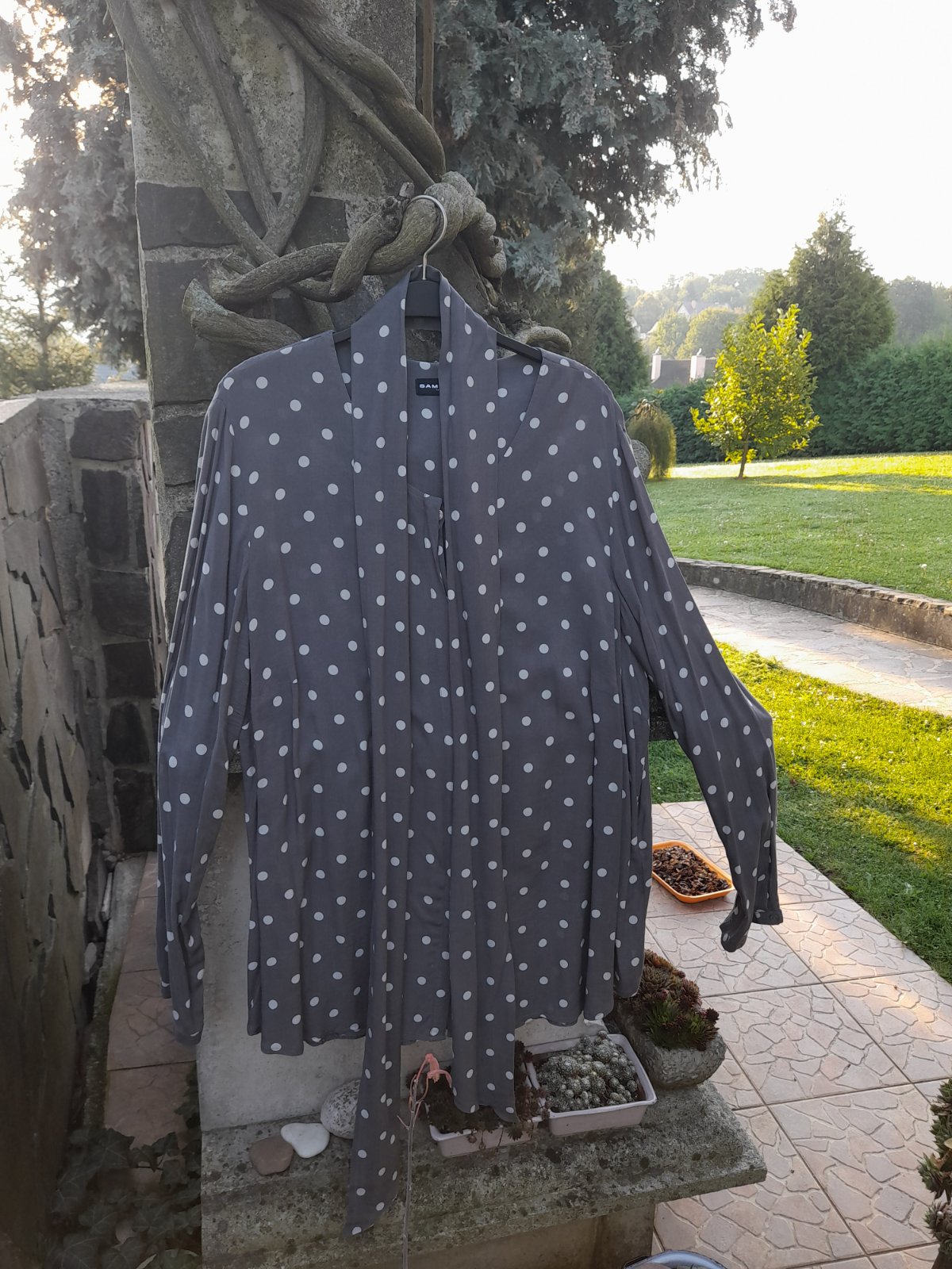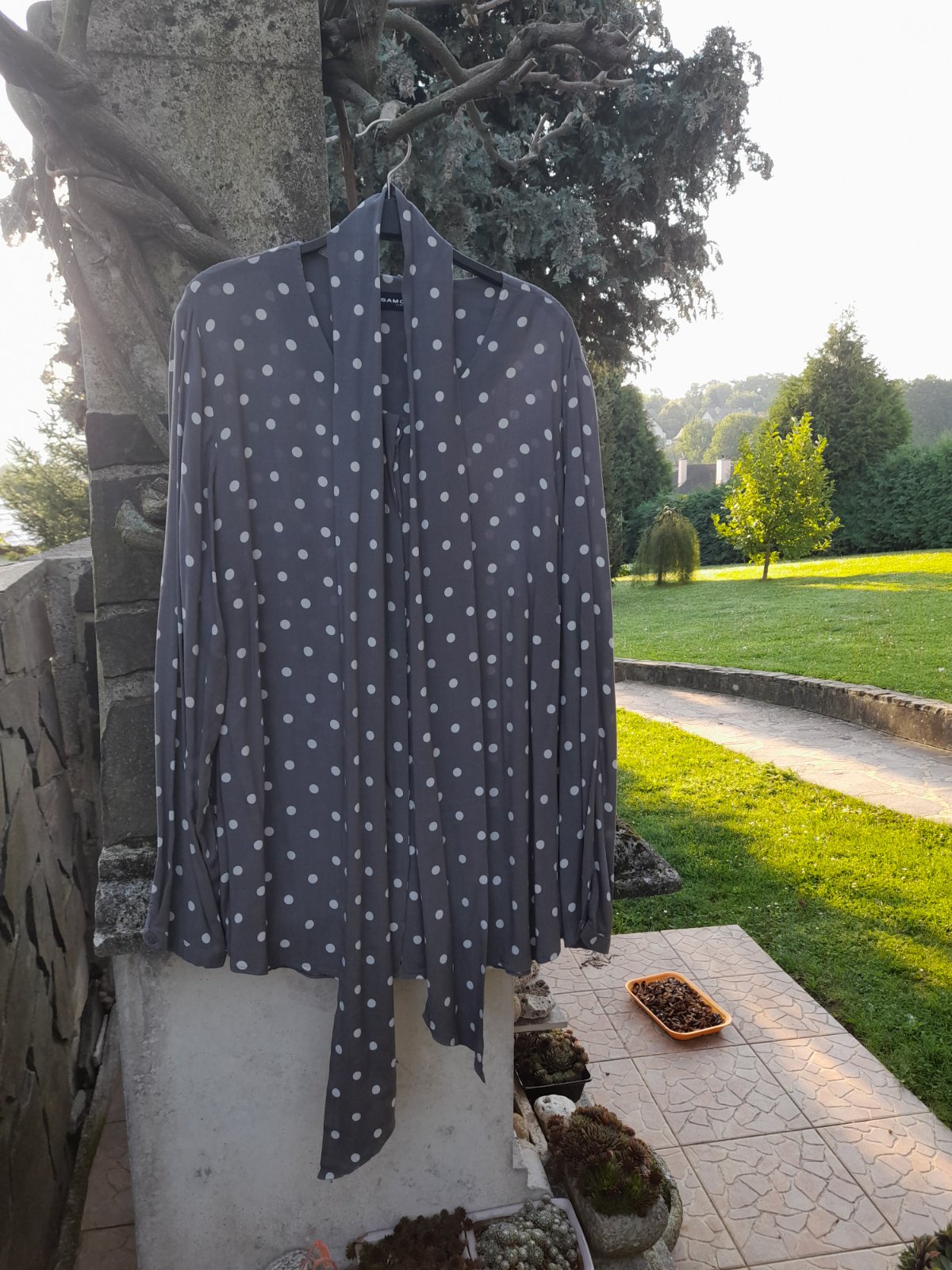 Tmavo šedá blúzka s bielymi vzormi. Materiál je mierne priesvitný. Blúzka ma niekoľko zatiahnutých nitiek - pozri si foto. Miery hrudník: 2x64cm dĺžka vpredu: 66cm dĺžka vzadu: 82cm