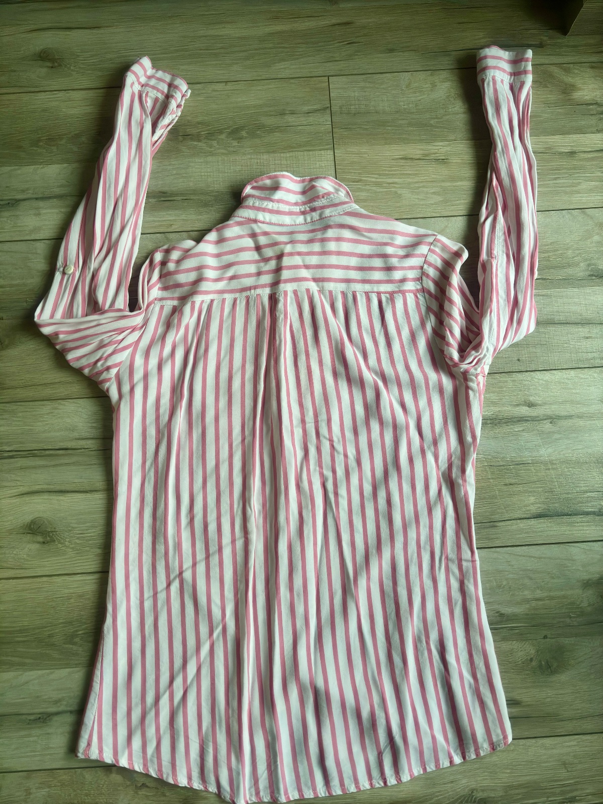 Pruhovaná košeľa - ružovo biela. Veľmi málo nosená, na fotke trochu dokrcena, no keď sa ozehli vyzerá veľmi pekne.