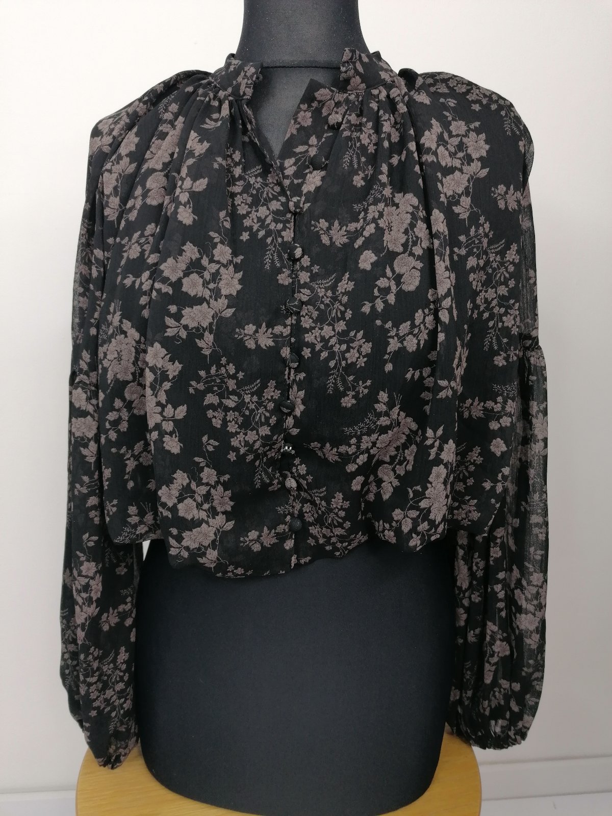 Veľmi pekná blúzka do pása, dole je na gumičku. Široké rukávy, materiál je padavý, ľahký. Je podšitá akoby tielkom. Veľkosť S. Nenosená, iba opratá.
