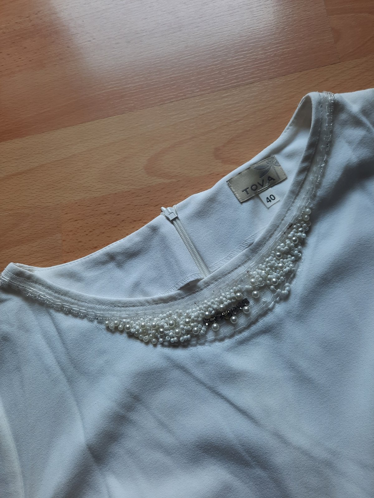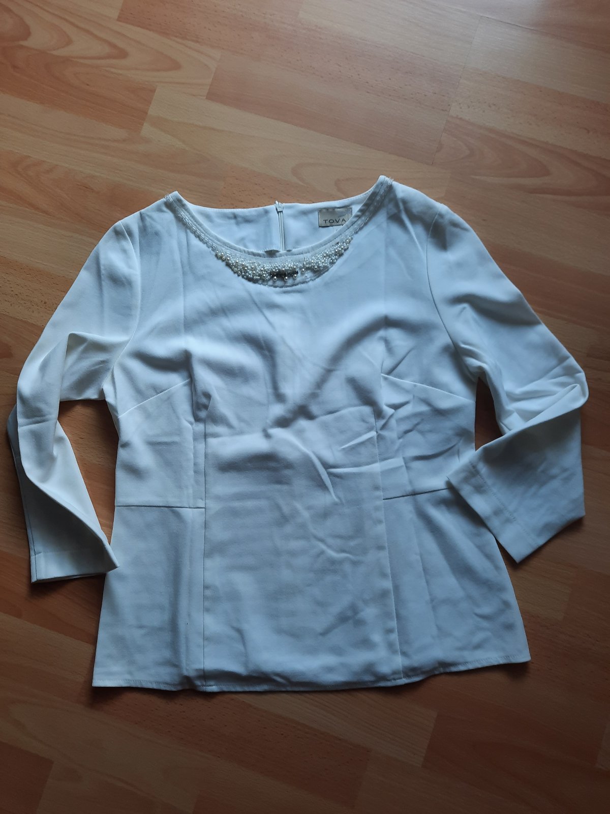 Pekná elegantná dámska biela blúzka so zapínaním na zips vzadu. Pri krku sú ozdobné kamienky, pár kusov je už vypadnutých. Ináč je v bezchybnom stave.