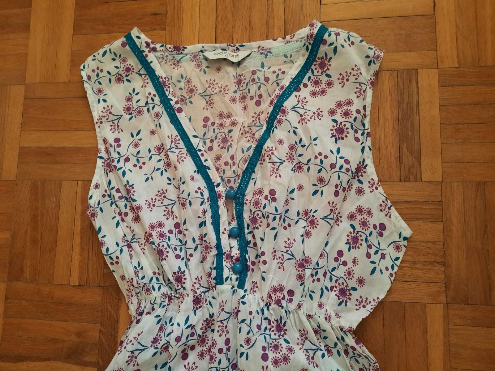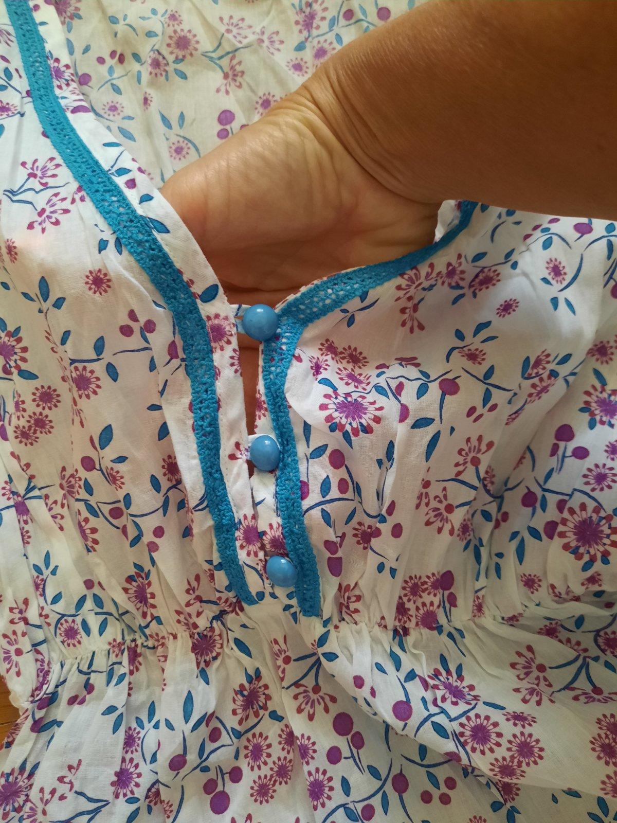 Super vzdušná, ľahučká blúzka- dlhší top. V páse je gumou stiahnutá. Vpredu sú gombíky. Výborný stav. Dajú sa nosiť aj na pláž na plavky, príp.k legínam, aj samostatne. Krásne sýte farby. Veľkostne sedí už od M podľa mňa. Top stav.