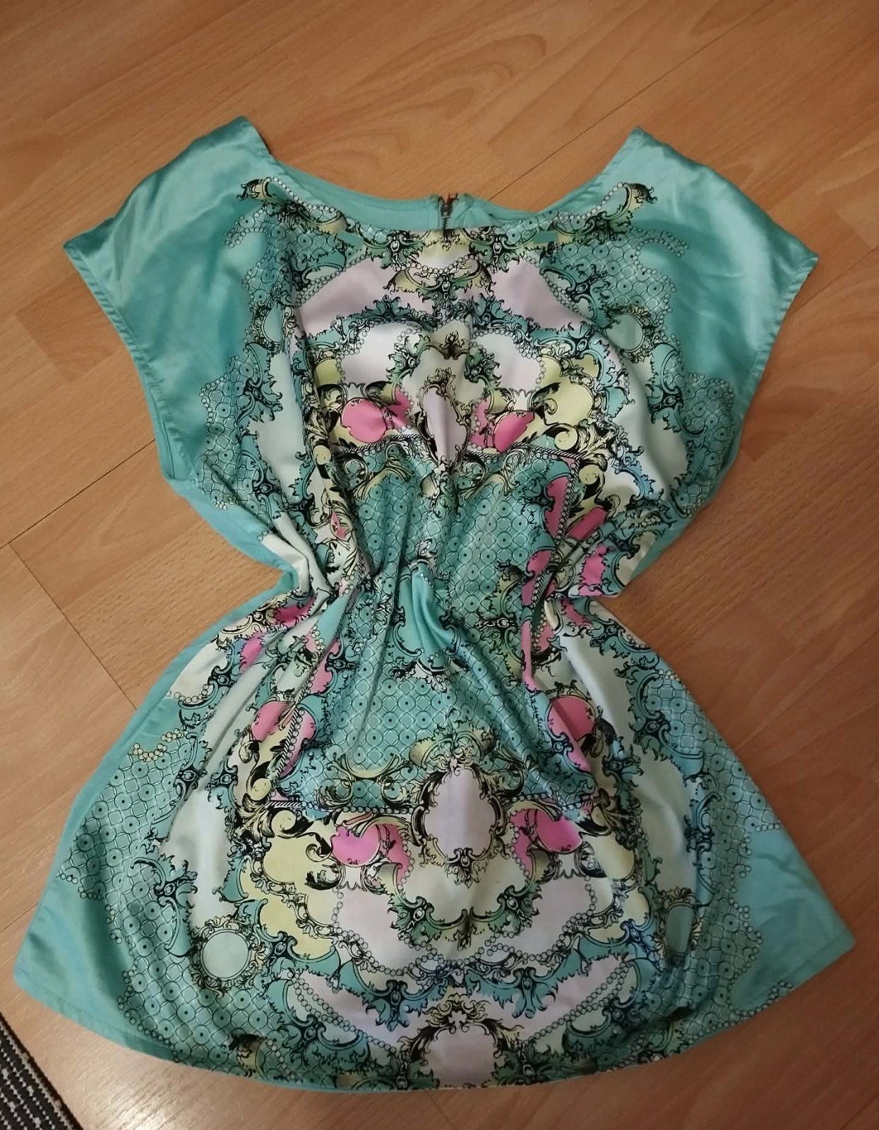 Štýlová dámska blúzka v krásnej mentolovo-tyrkysovej farbe. Predná časť má jemne lesklý saténový efekt, ktorý pôsobí elegantne a luxusne. Výrazný barokový vzor v pastelových tónoch dodáva blúzke originálny a ženský vzhľad.