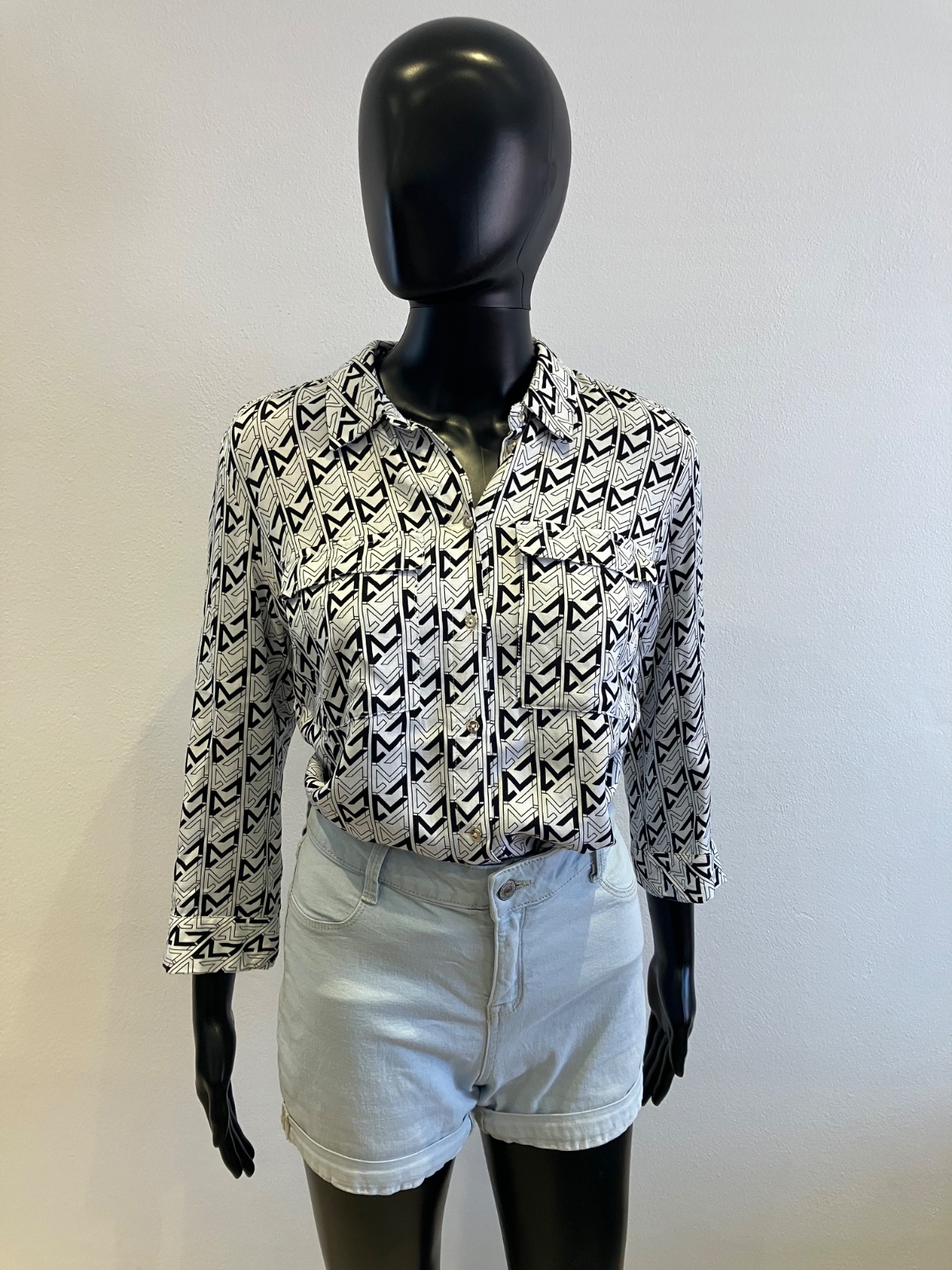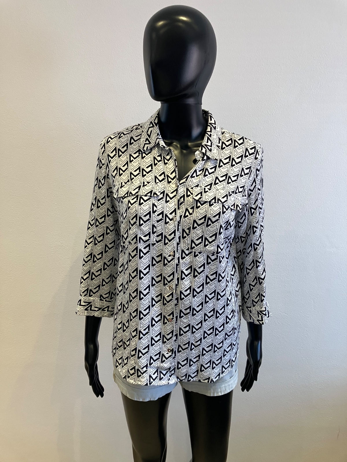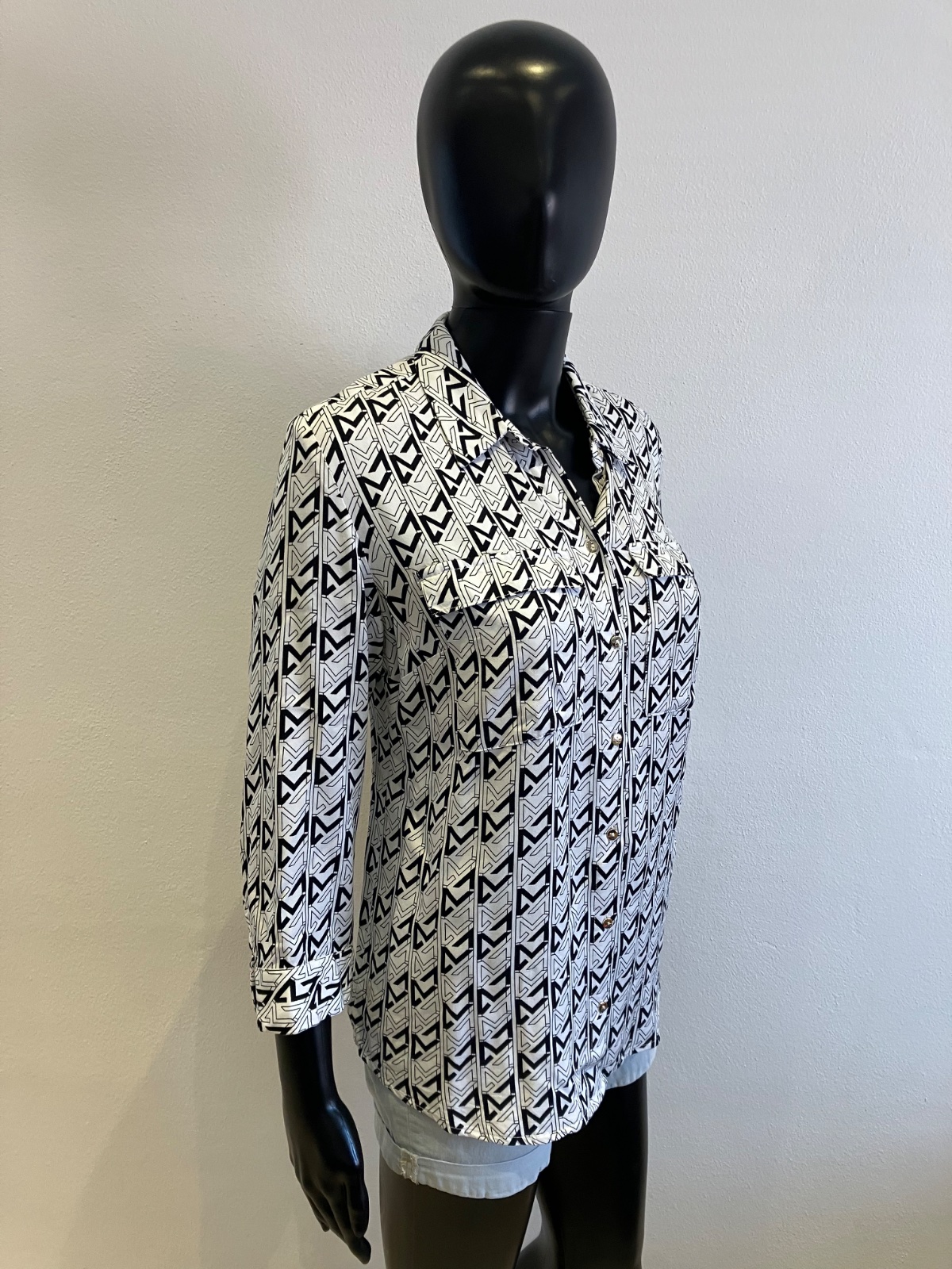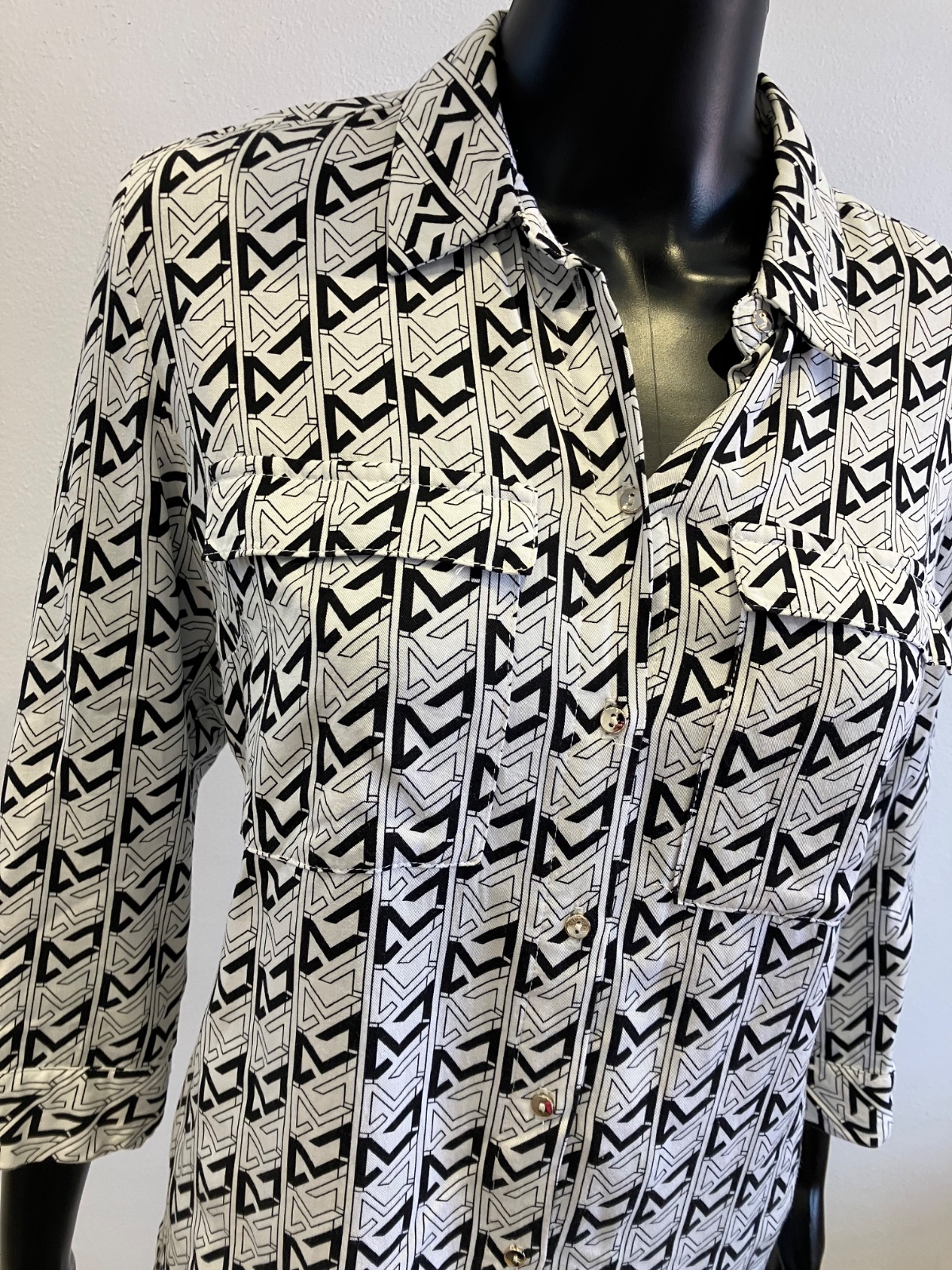 Dámska vzorovaná košeľa s trojštvrťovými rukávmi, zapínanie a strieborné gombíky, tenká, jemne elastická.