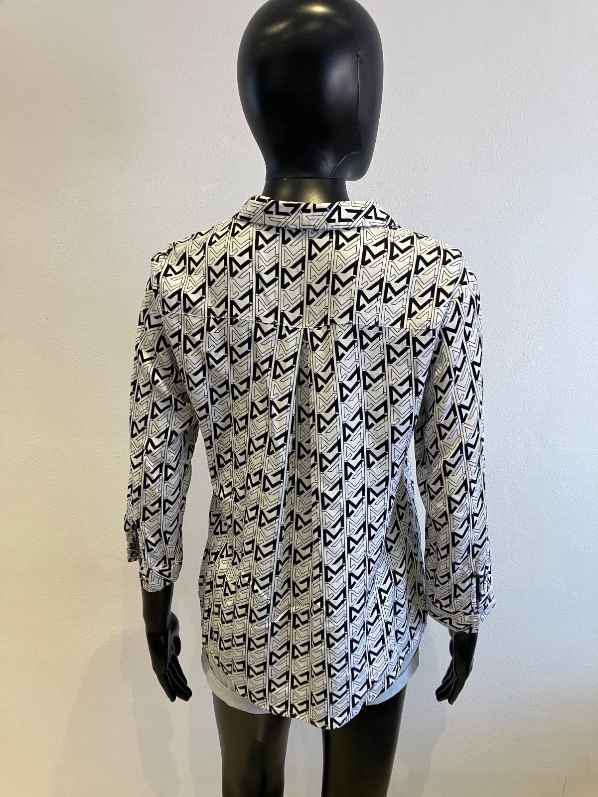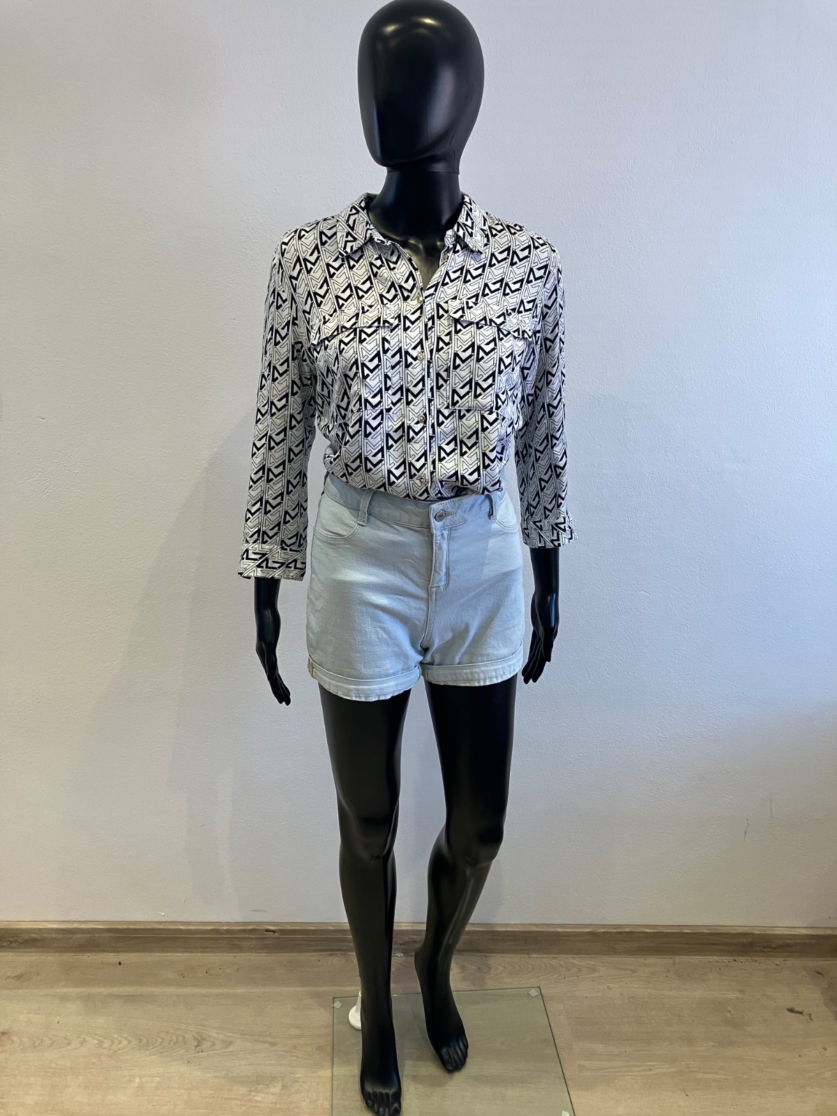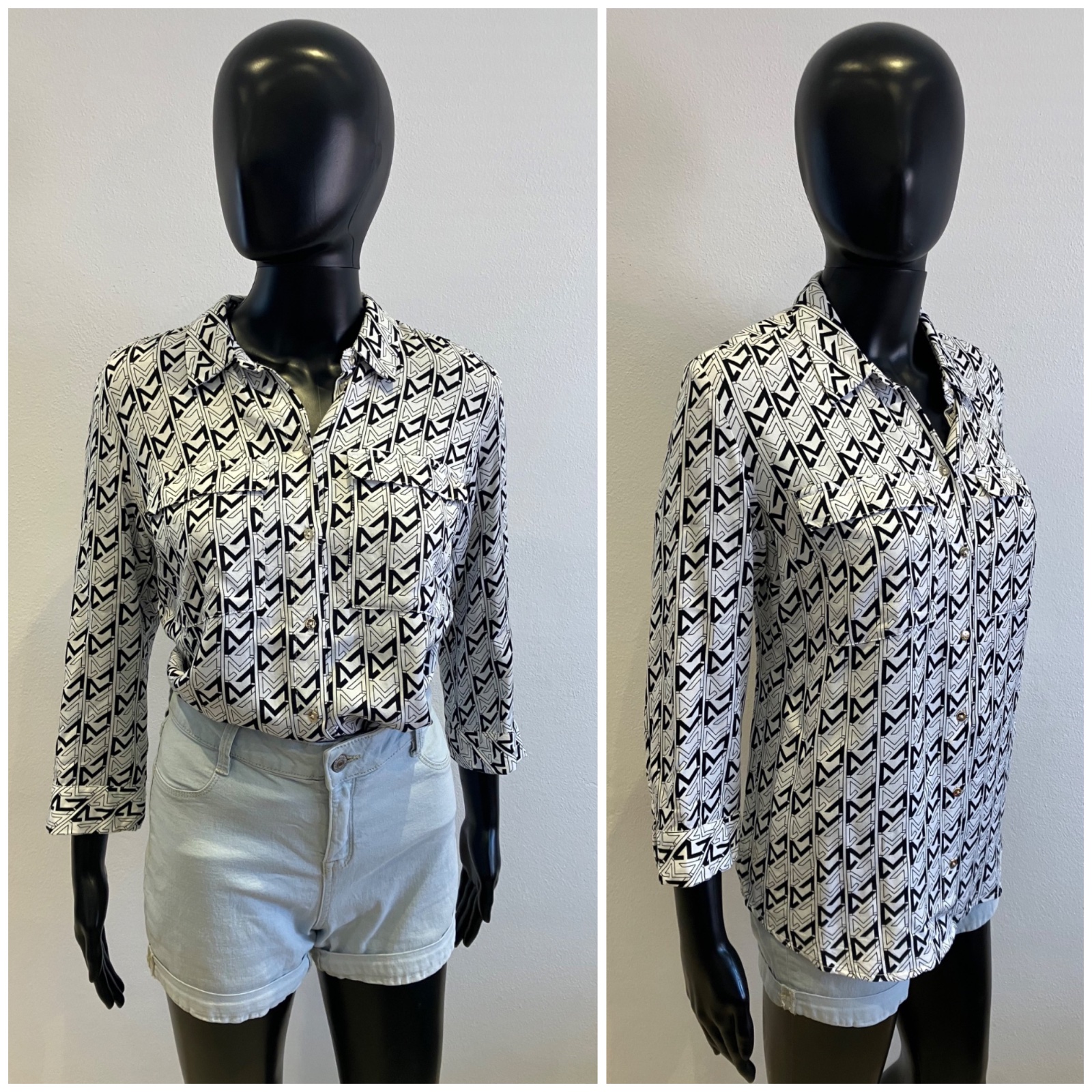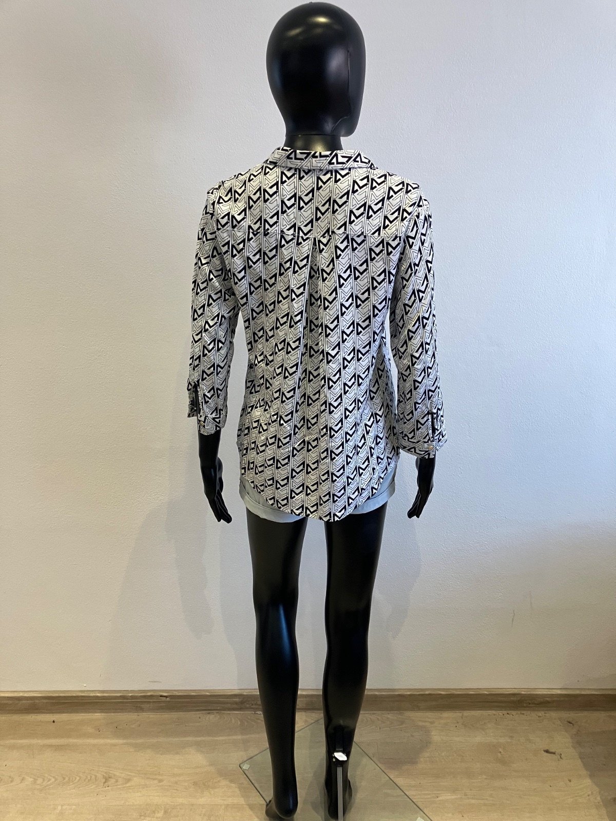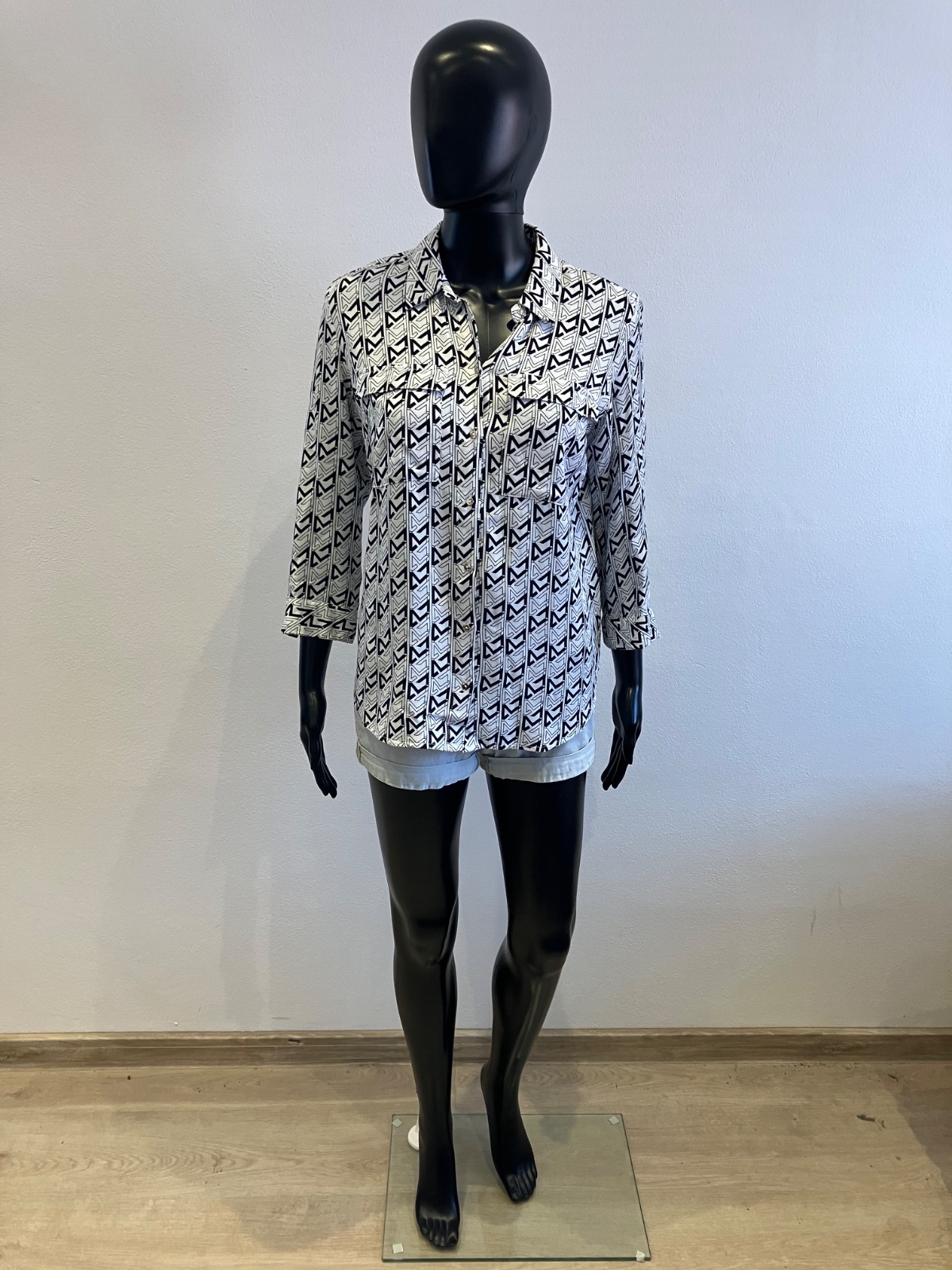Dámska vzorovaná košeľa s trojštvrťovými rukávmi, zapínanie a strieborné gombíky, tenká, jemne elastická.