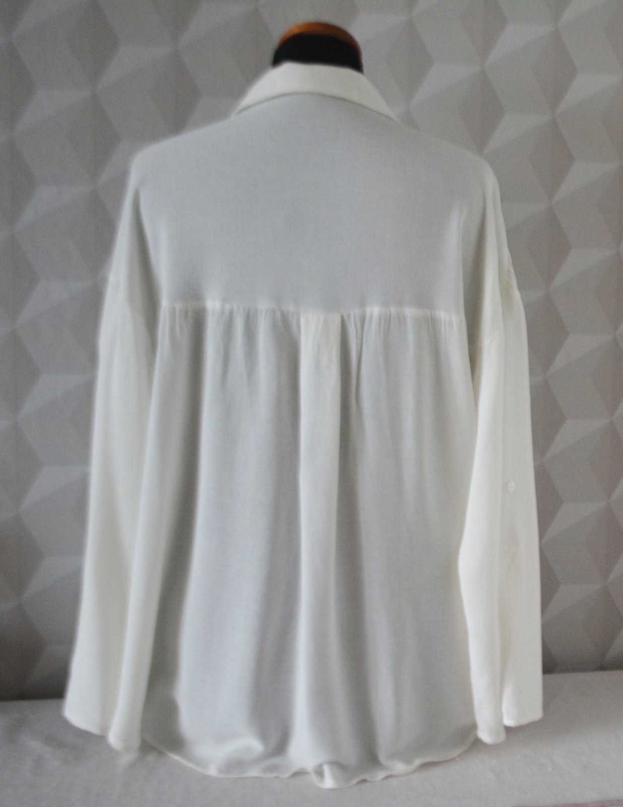 Dámska blúzka s roll - up rukávmi. Veľkosť označená M, sedí aj na L aj na XL - voľný, oversize strih. Rozmery: dlžka predného dielu 68cm, zadný má 76cm, pod pazuchami 2x60cm, rukávy sa dajú roll-up vypnúť - od krku 68, od pleca 46 a od pazuchy 36cm.