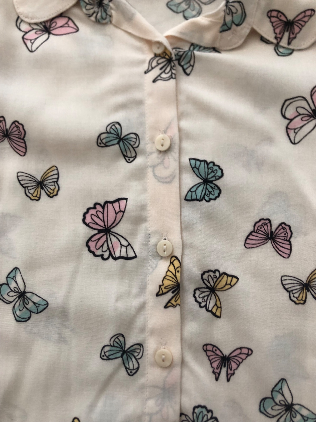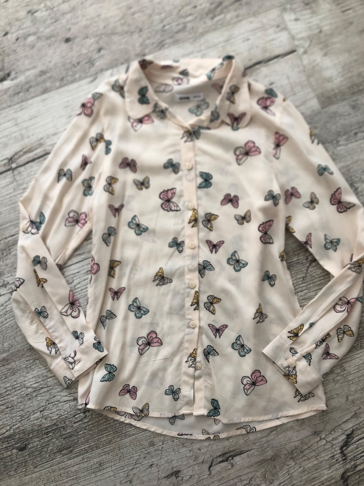 Oblečená 1x, vzadu zapínanie na 1 gombík, spodok aj rukávy ukončené gumičkou. Dĺžka 49cm, šírka 2x37cm, rukáv od pleca 51cm