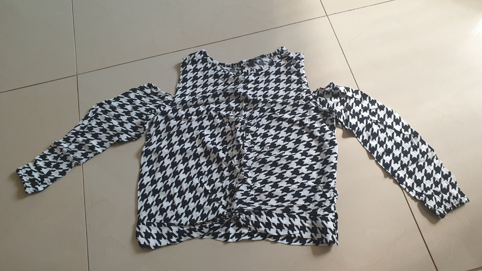 Ponukam krásnu modernú blúzku pre dievča,moderný strih holé plecia, velkosť 146,materiál viskóza,,vzadu okol krku gombik,dlhy rukav dole gumička