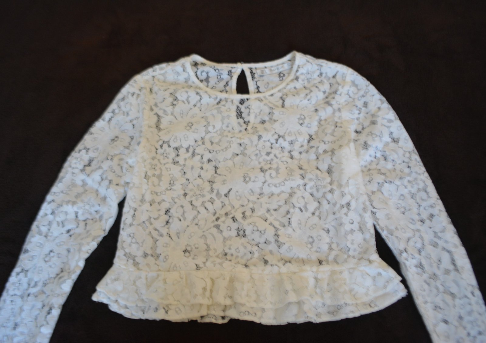 Priehľadný čipkovaný top s volánom na spodku. Zapínanie vzadu - malá slzička s gombíkom.