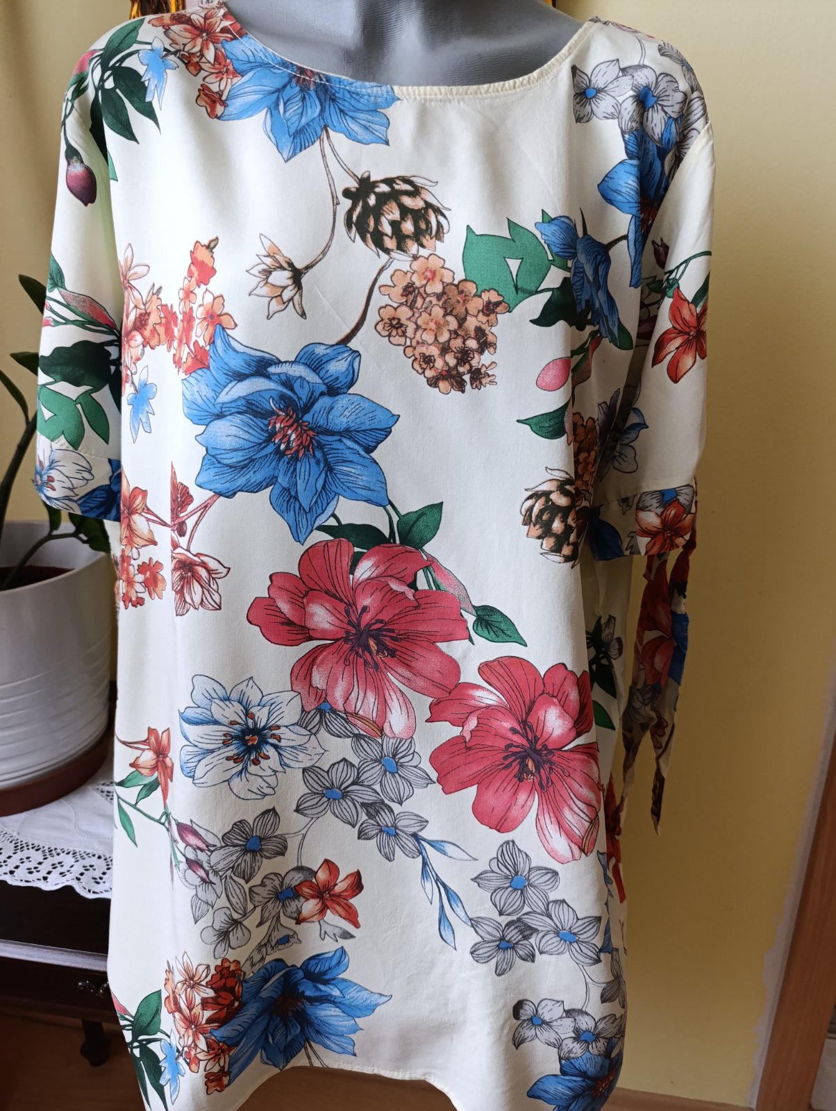 Veľmi príjemný materiál na leto, blúzka z Talianska, v skutočnosti nie je tá žltá taká výrazná, prsia 58 x2, dĺžka vpredu 74, vzadu 78cm