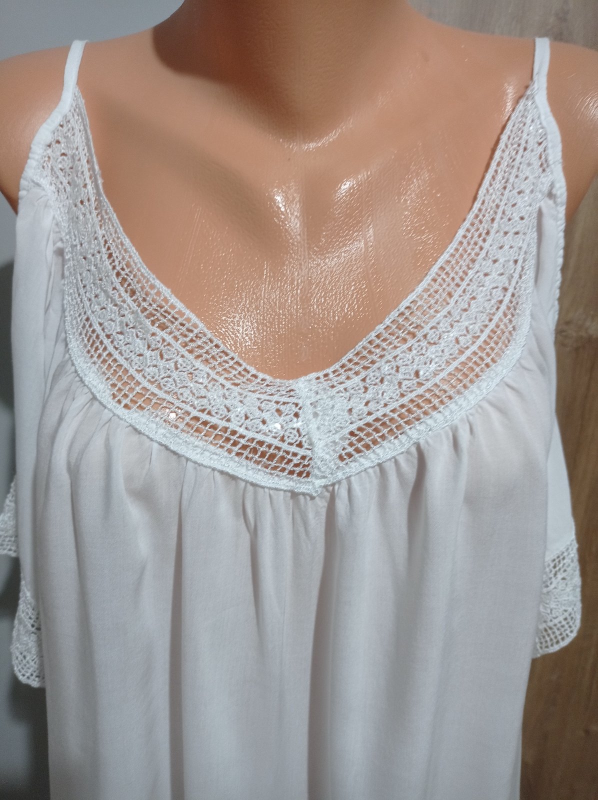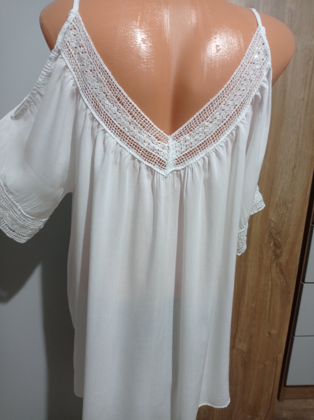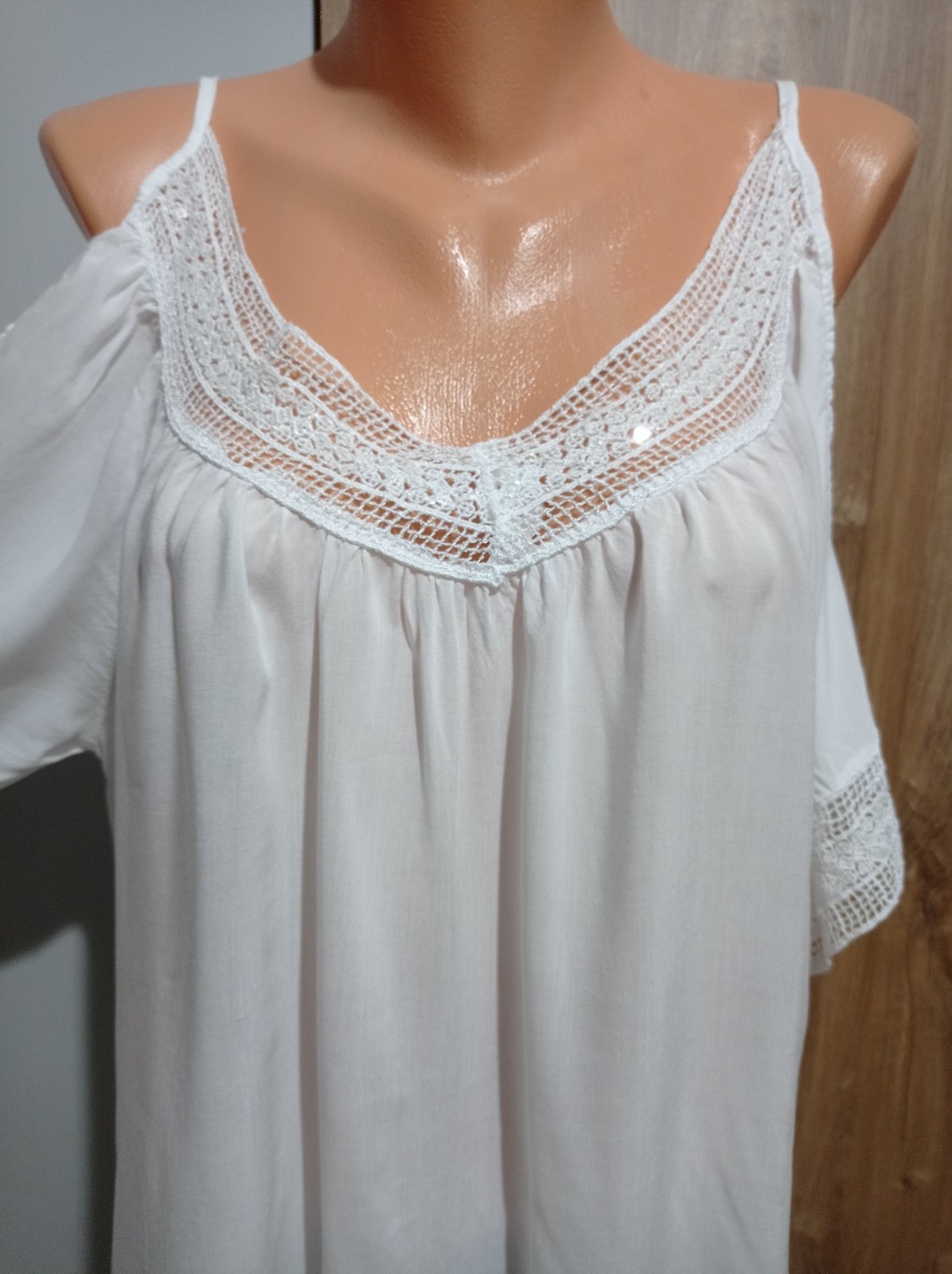 Tunika je vo výbornom stave, z ľahučkého materiálu, má odhalené ramená, je ozdobená krásnou čipkou s flitrami. Vhodná aj na plavky. Veľkosť UNI, šírka pod pazuchami max. 62 cm x 2, dĺžka 71 cm.