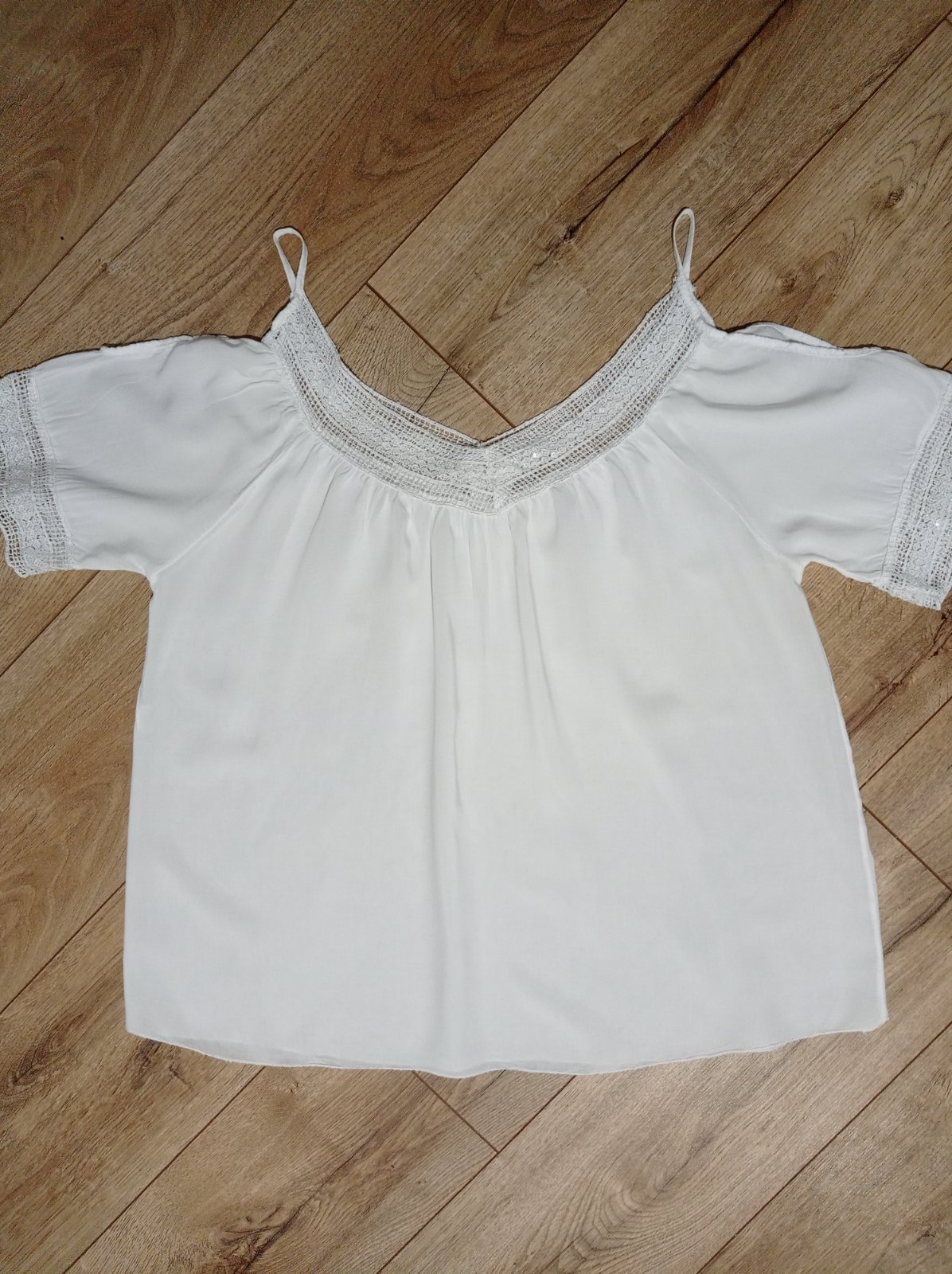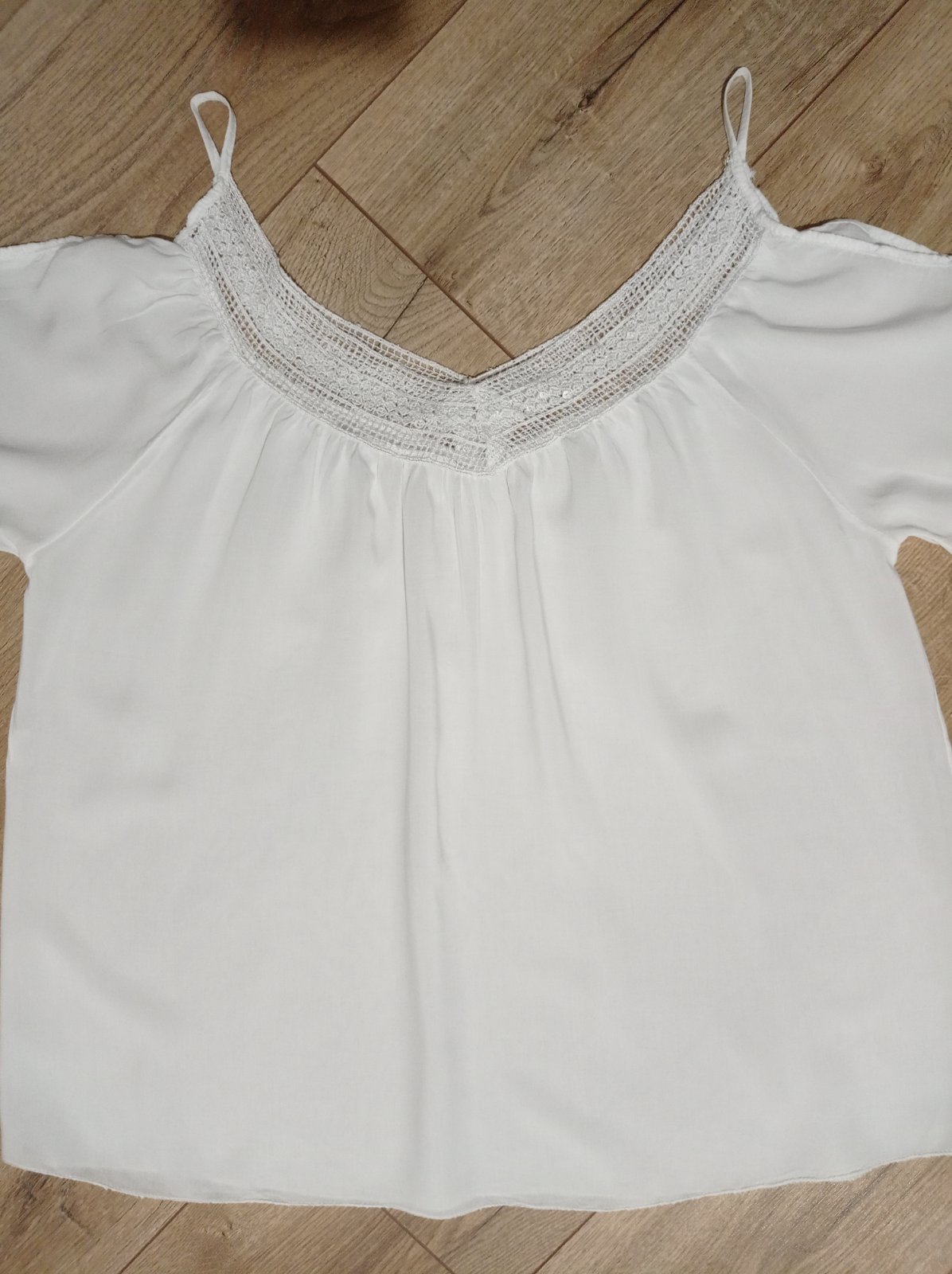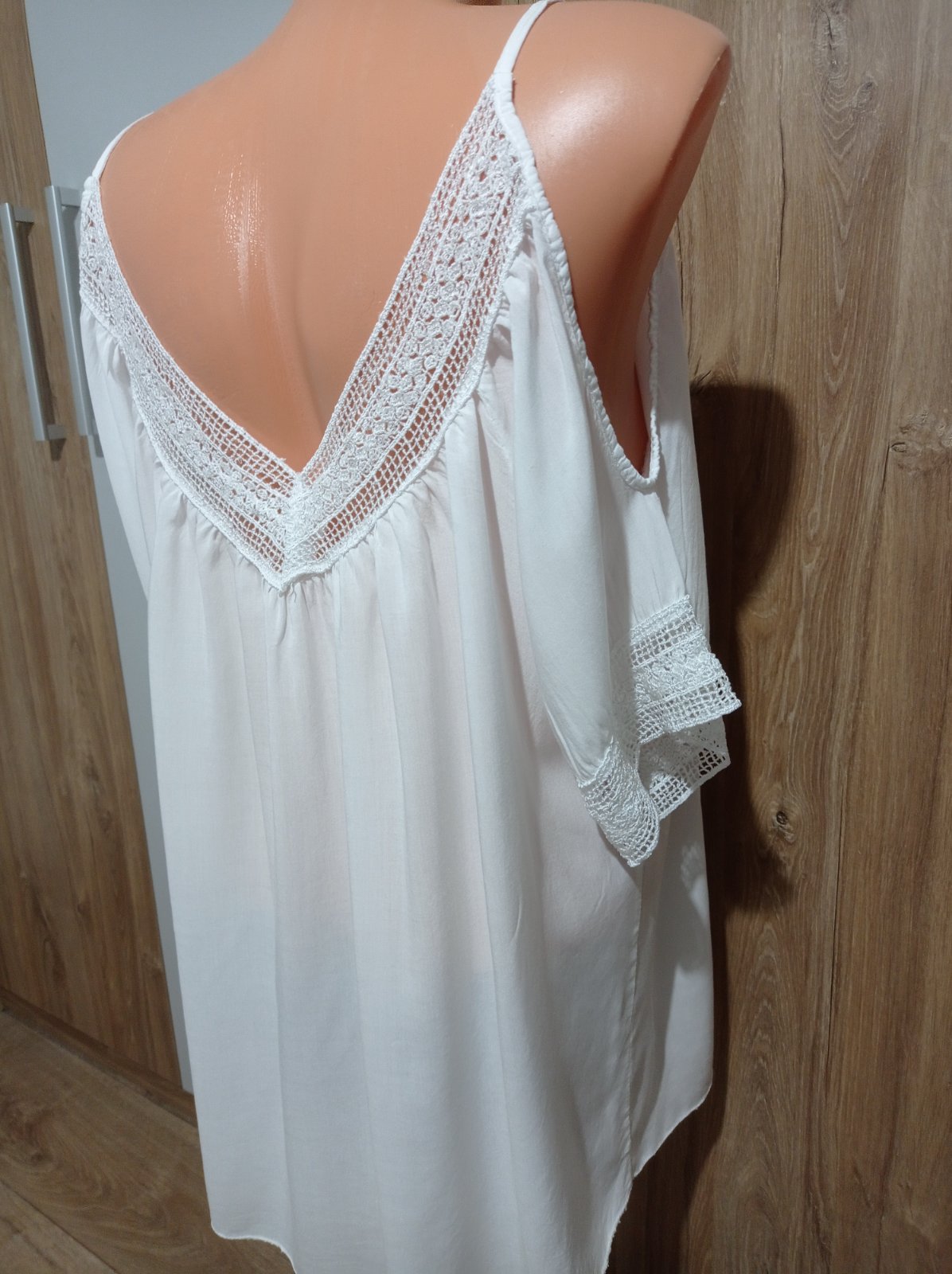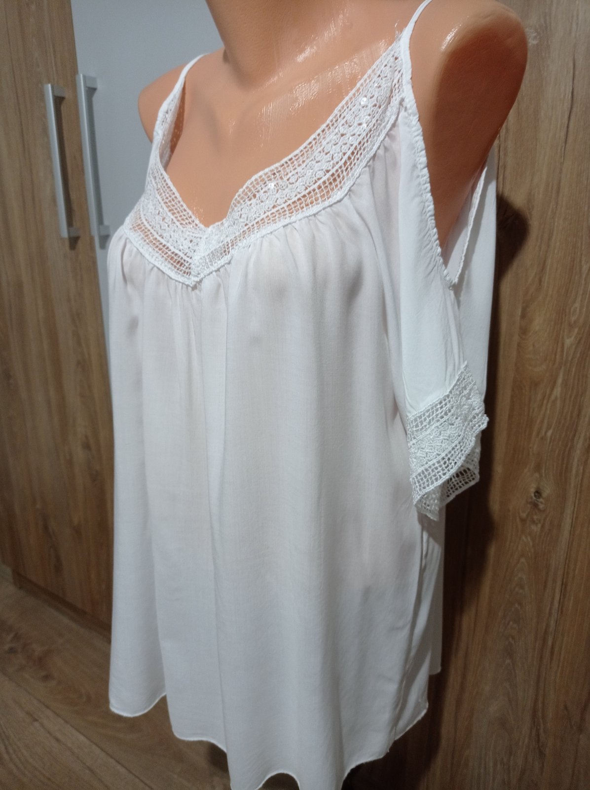 Tunika je vo výbornom stave, z ľahučkého materiálu, má odhalené ramená, je ozdobená krásnou čipkou s flitrami. Vhodná aj na plavky. Veľkosť UNI, šírka pod pazuchami max. 62 cm x 2, dĺžka 71 cm.