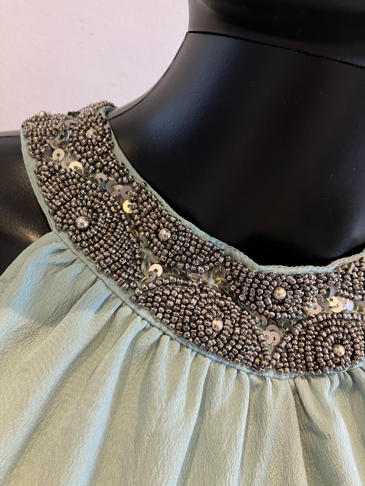 Dámska tyrkysová blúzka s kamienkami a so zaväzovaním okolo krku, nie je elastická, nie je priesvitná, tenká, materiál 100%polyester.