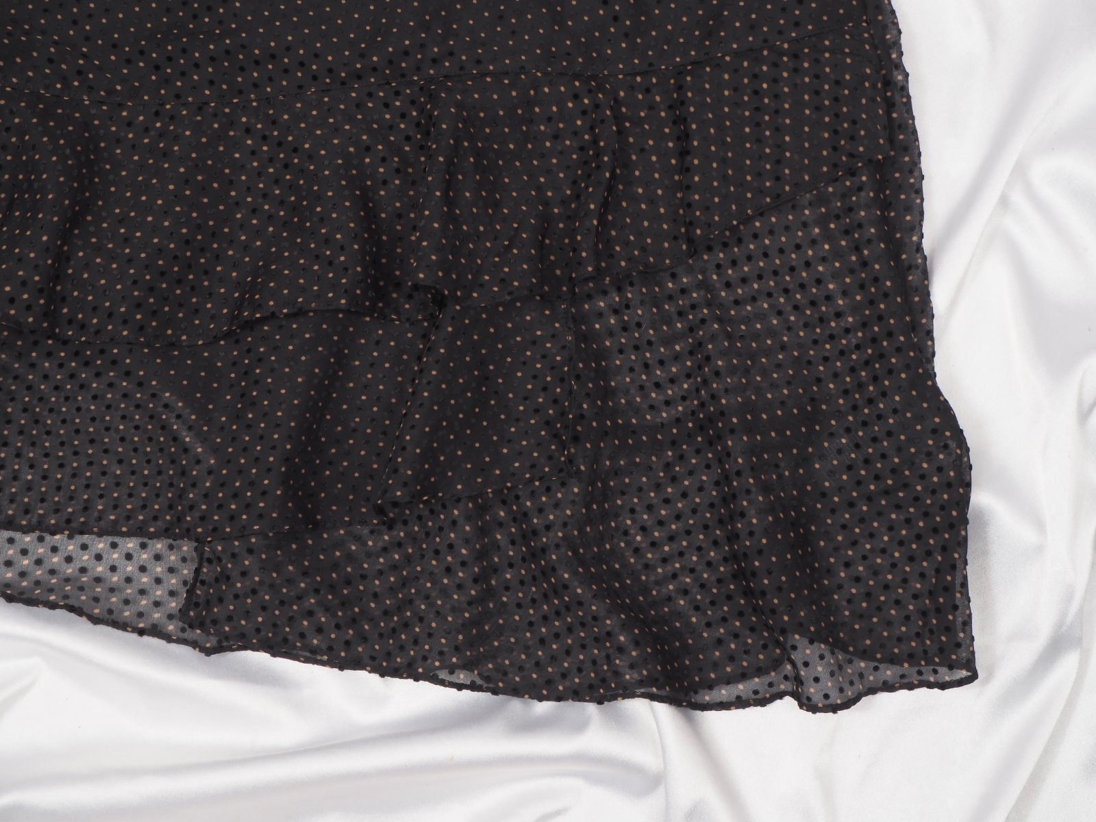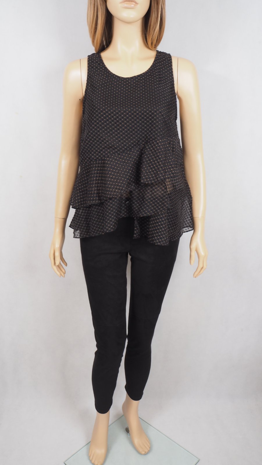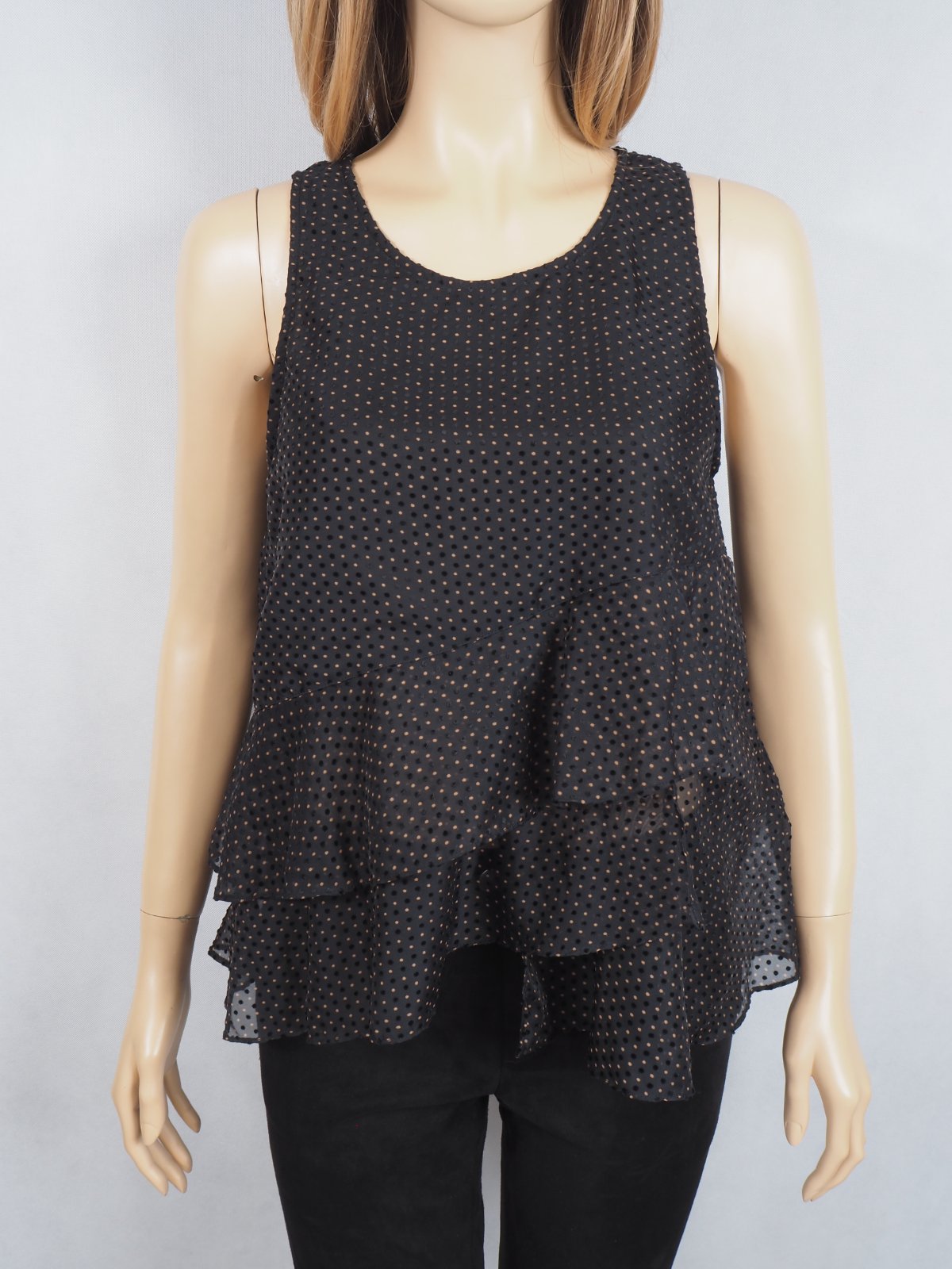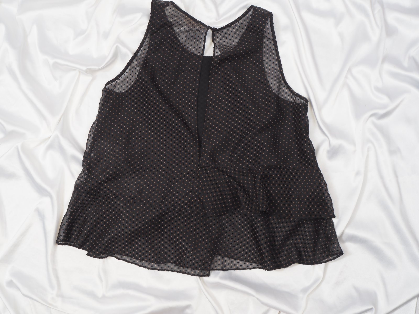 Kvalitný letný top, vzdušný, transparentný, volánový, čiernej farby so zamatovými a hnedými guličkami, nový s visačkou.