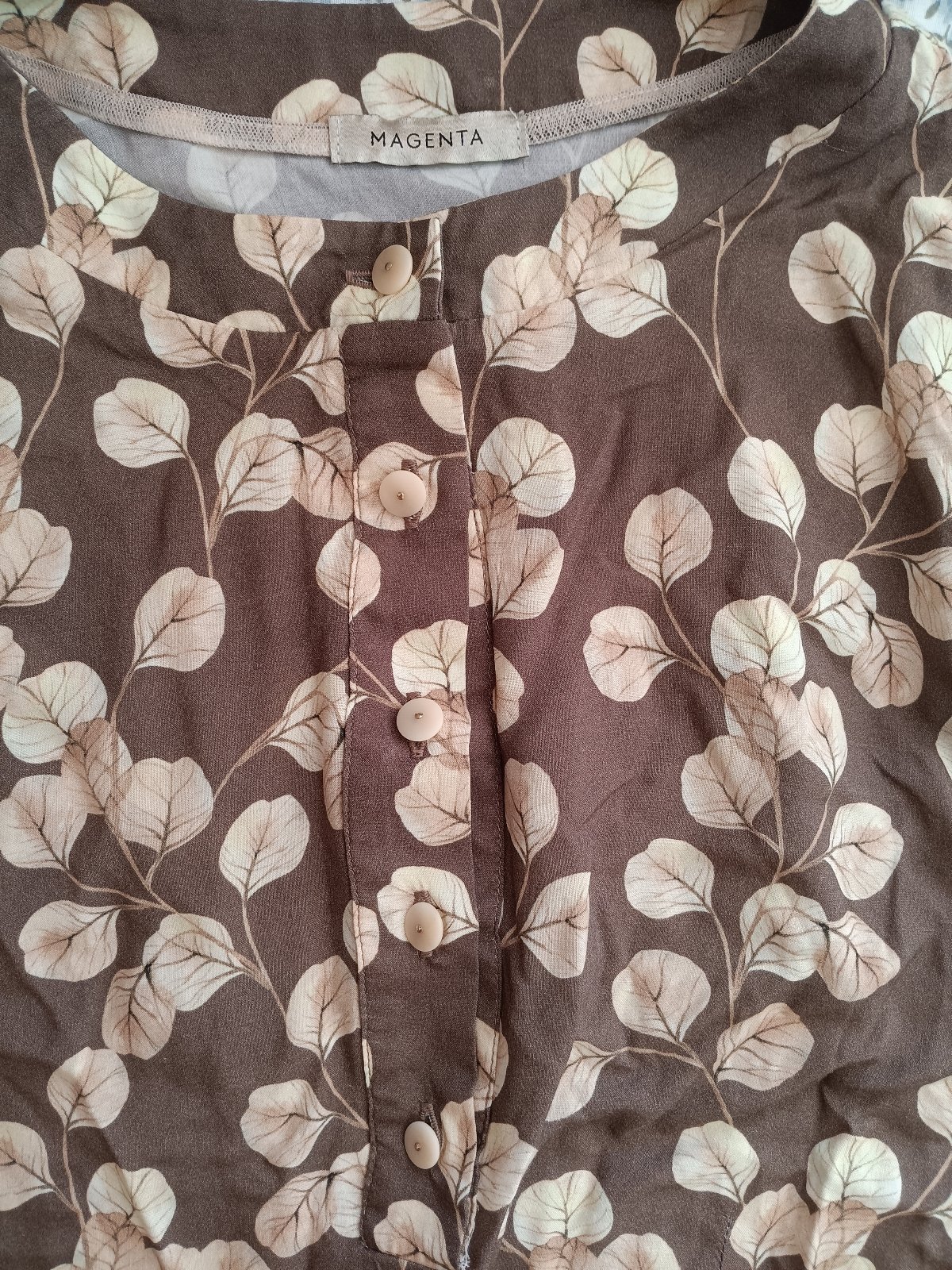 Blúzka značky Magenta, farba najviac podobná poslednej fotke (lístky sú do bledožltej na hnedom podklade). Bez označenia veľkosti a zloženia, sadne skôr na S/36, zloženie asi viskóza.