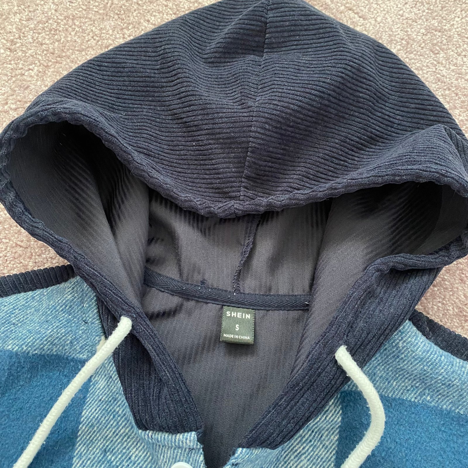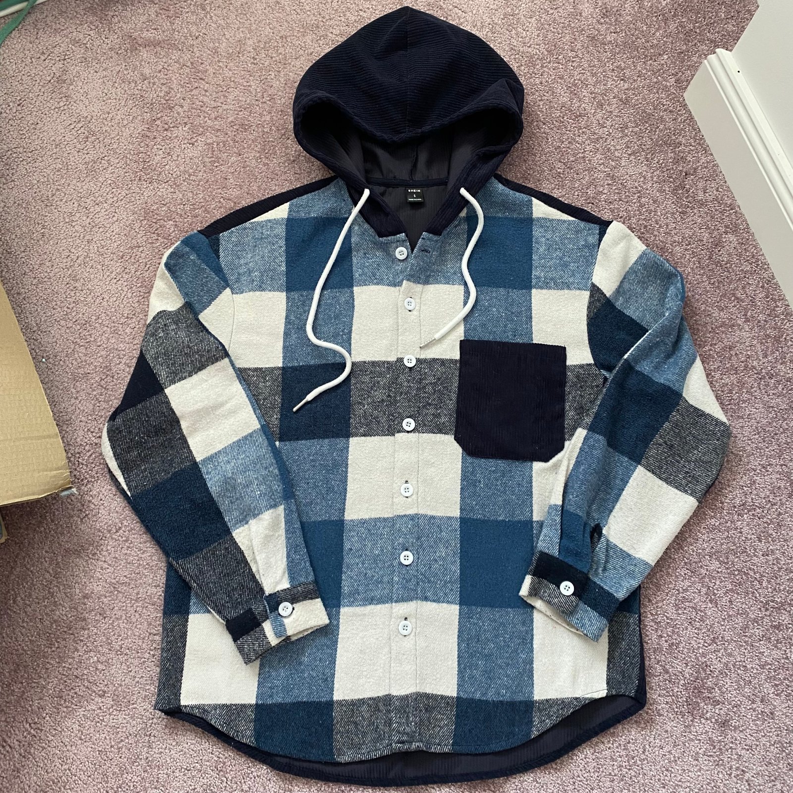Prechodná flanelová košeľa, predná strana bielo-modro-sivá kocka. Zadná strana a kapucňa - tmavomodrý menčester. V zachovalom stave. Dĺžka je 70cm, šírka je 55cm, dĺžka rukáva 56cm.