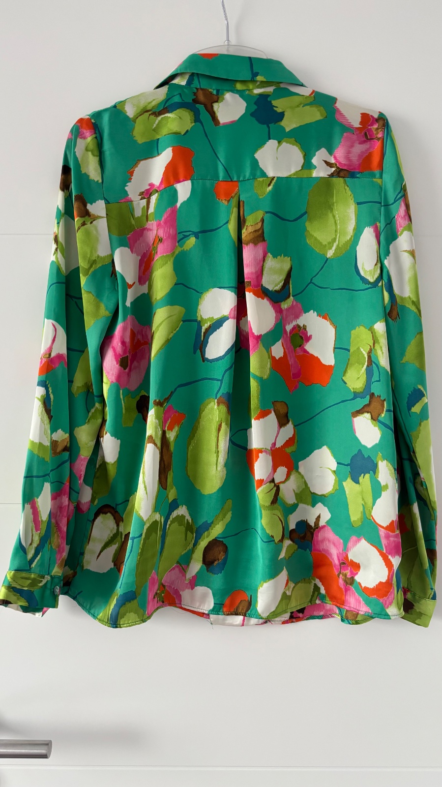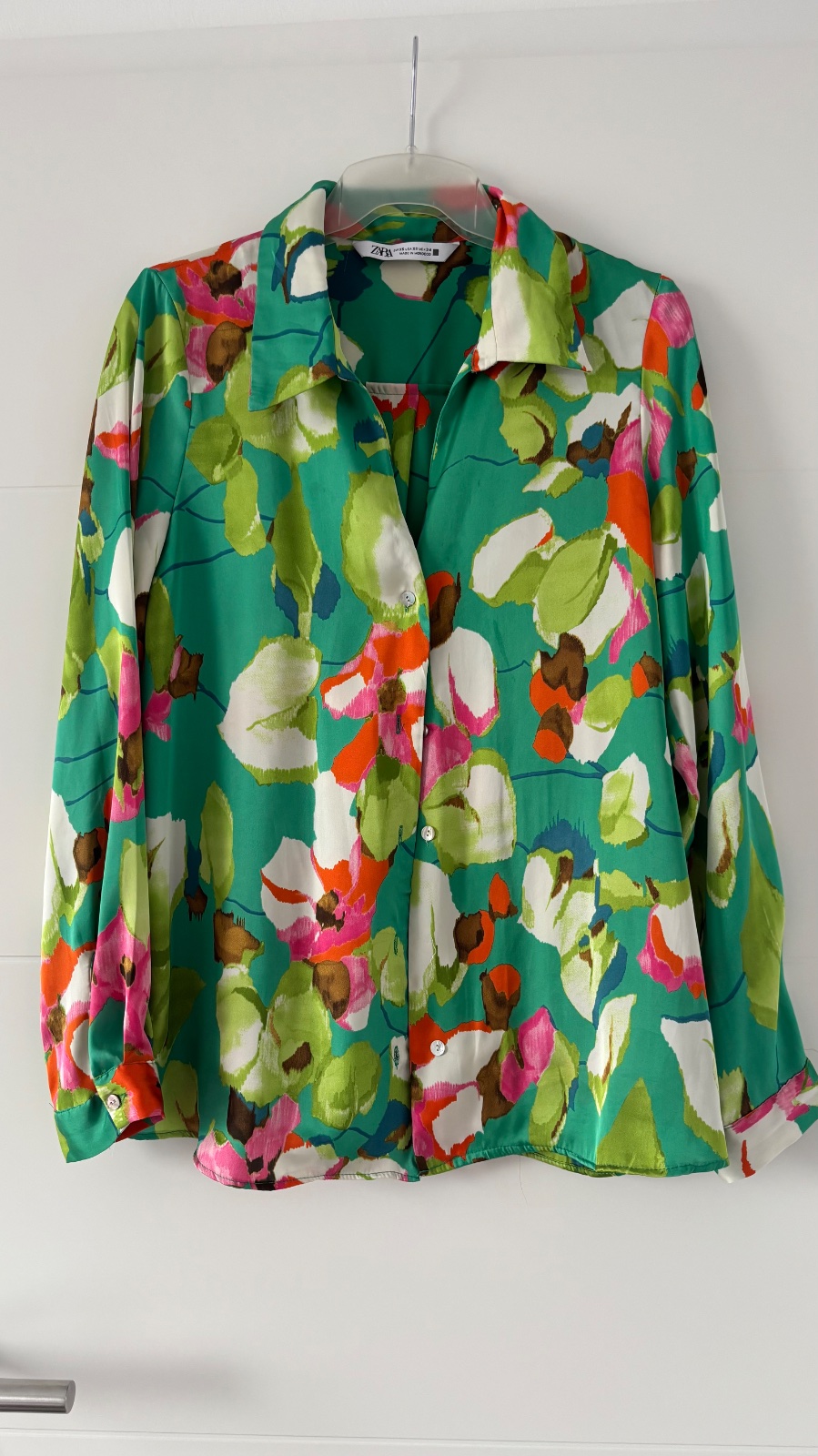 Elegantná saténová blúzka značky Zara v krásnej tmavozelenej farbe. Blúzka má jemný lesk, klasický košeľový strih a dlhý rukáv. Materiál je ľahký, splývavý a veľmi príjemný na nosenie – ideálna do ...