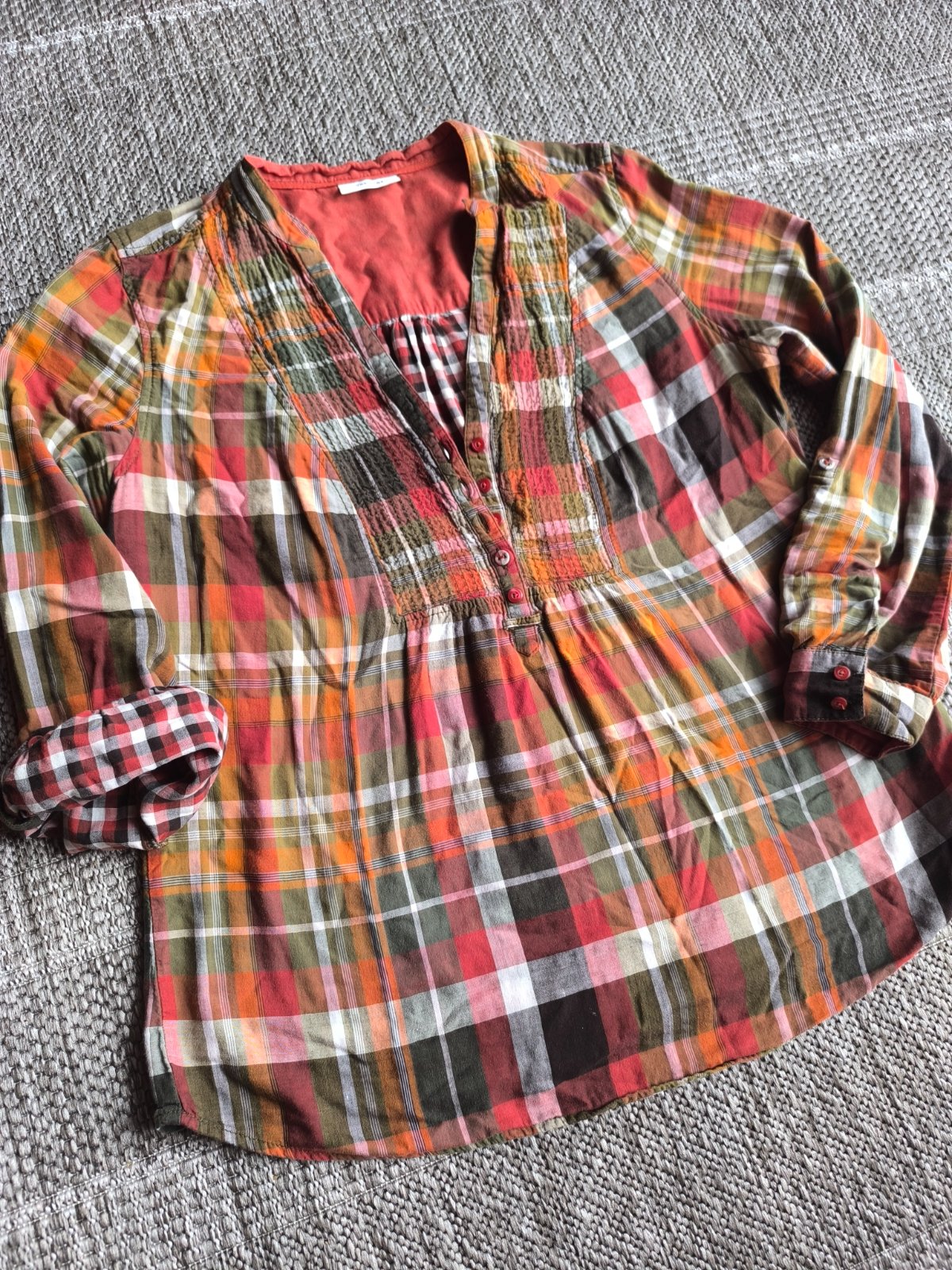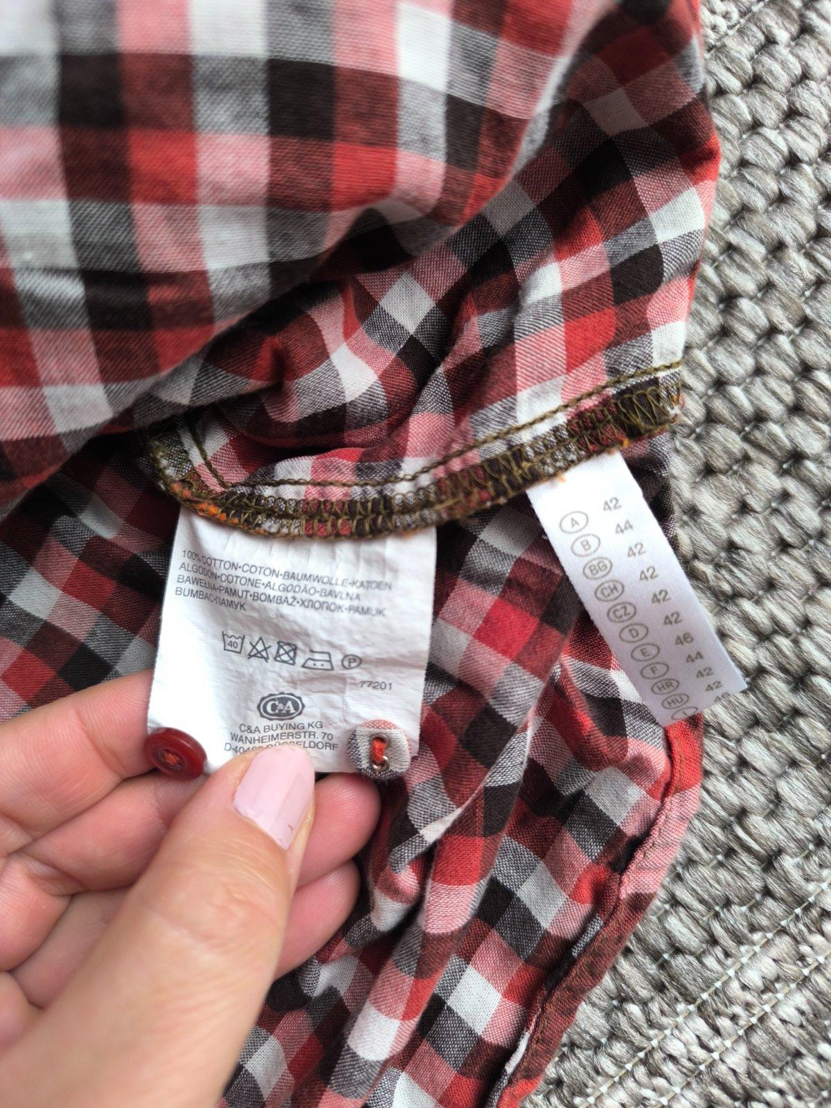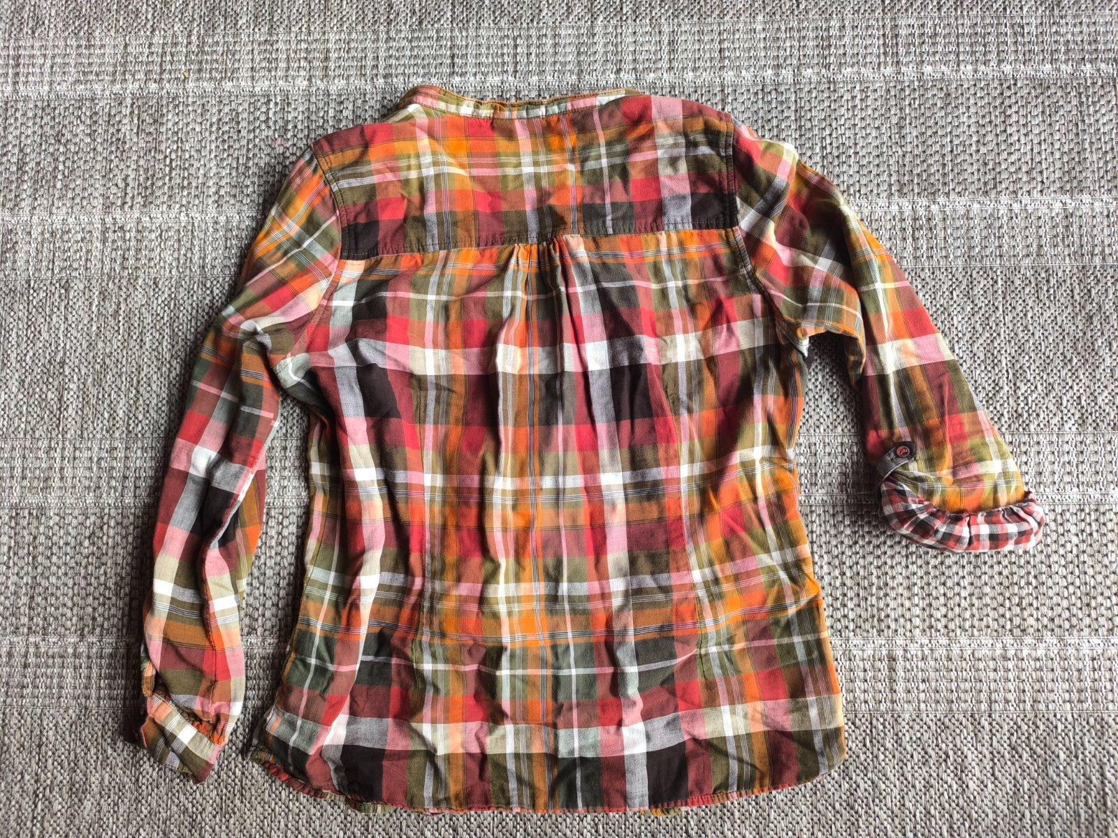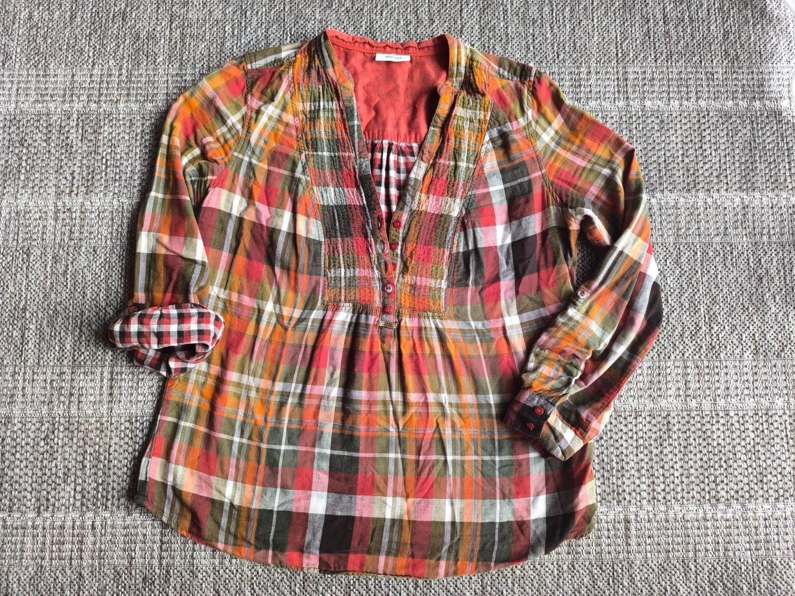 Károvaná jemná vzdušná bavlnená košeľová blúzka. Dlhé rukávy sa dajú skrátiť pomocou gombíkov. Dvojitá látka, ale veľmi ľahká mäkká príjemná bavlnená tkanina, super sa nosí, pohodlná. Krásne farby. V super stave. Veľkosť 42, dĺžka 70cm, šírka cez prsia 56cm, rukáv od ramena 61cm.