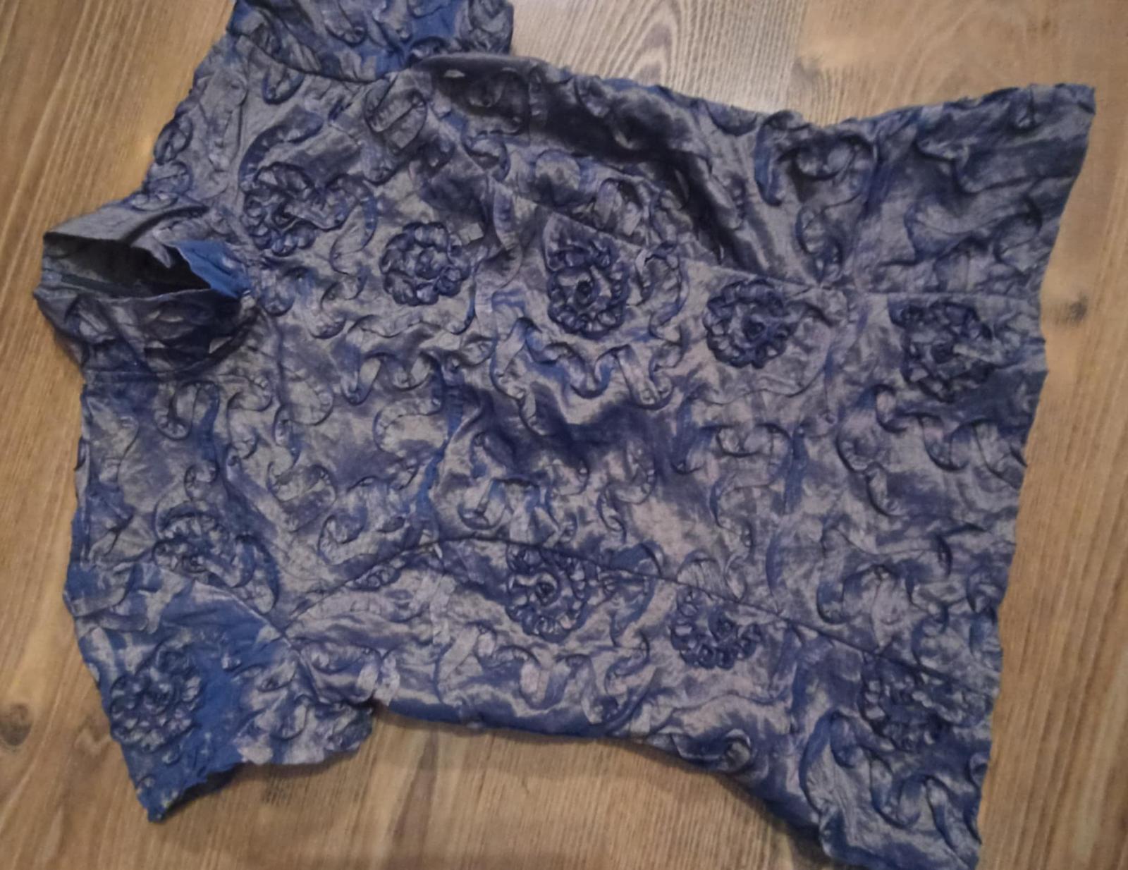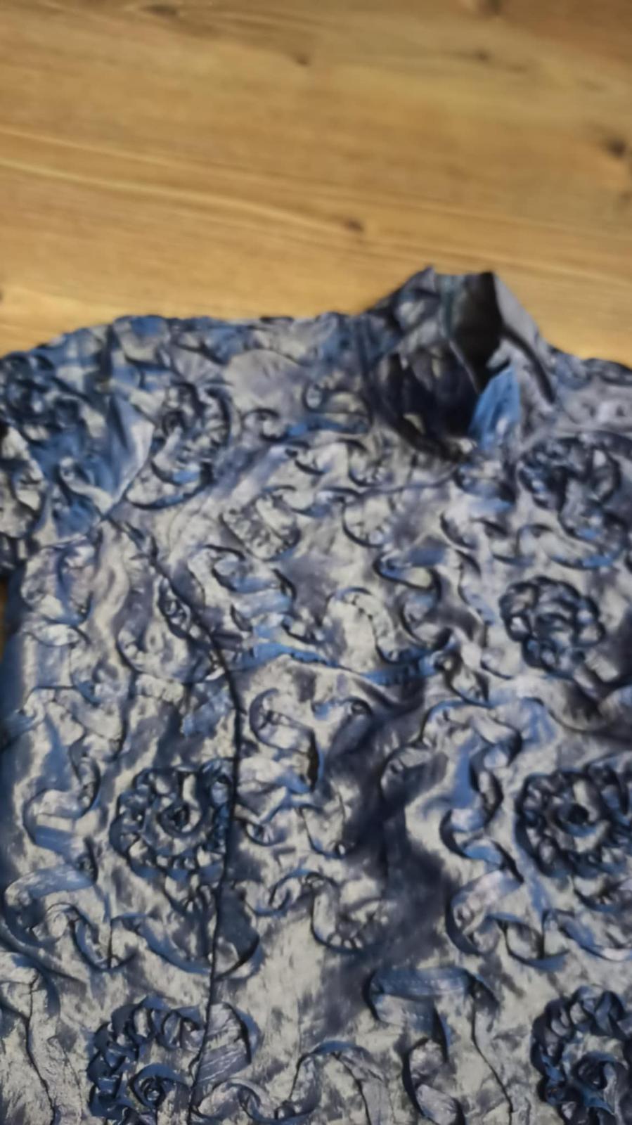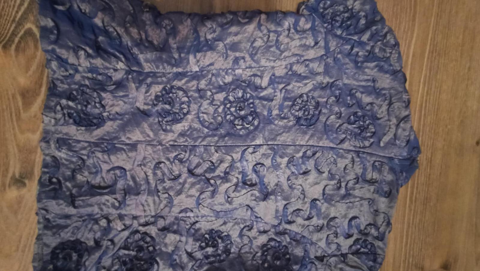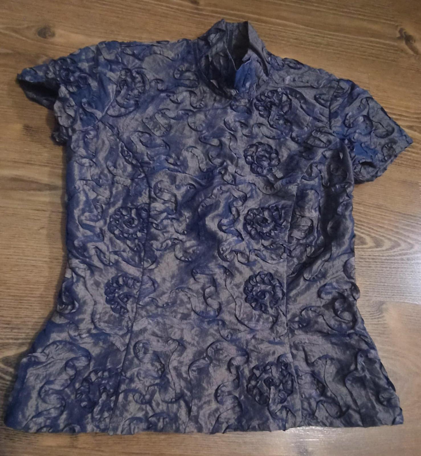 Blúzka je v krásnej kombinácii zlatej s modrou , zle sa však fotí, farba na svetle skresľuje. Inak je nádherná. Bola príležitostne raz oblečená.