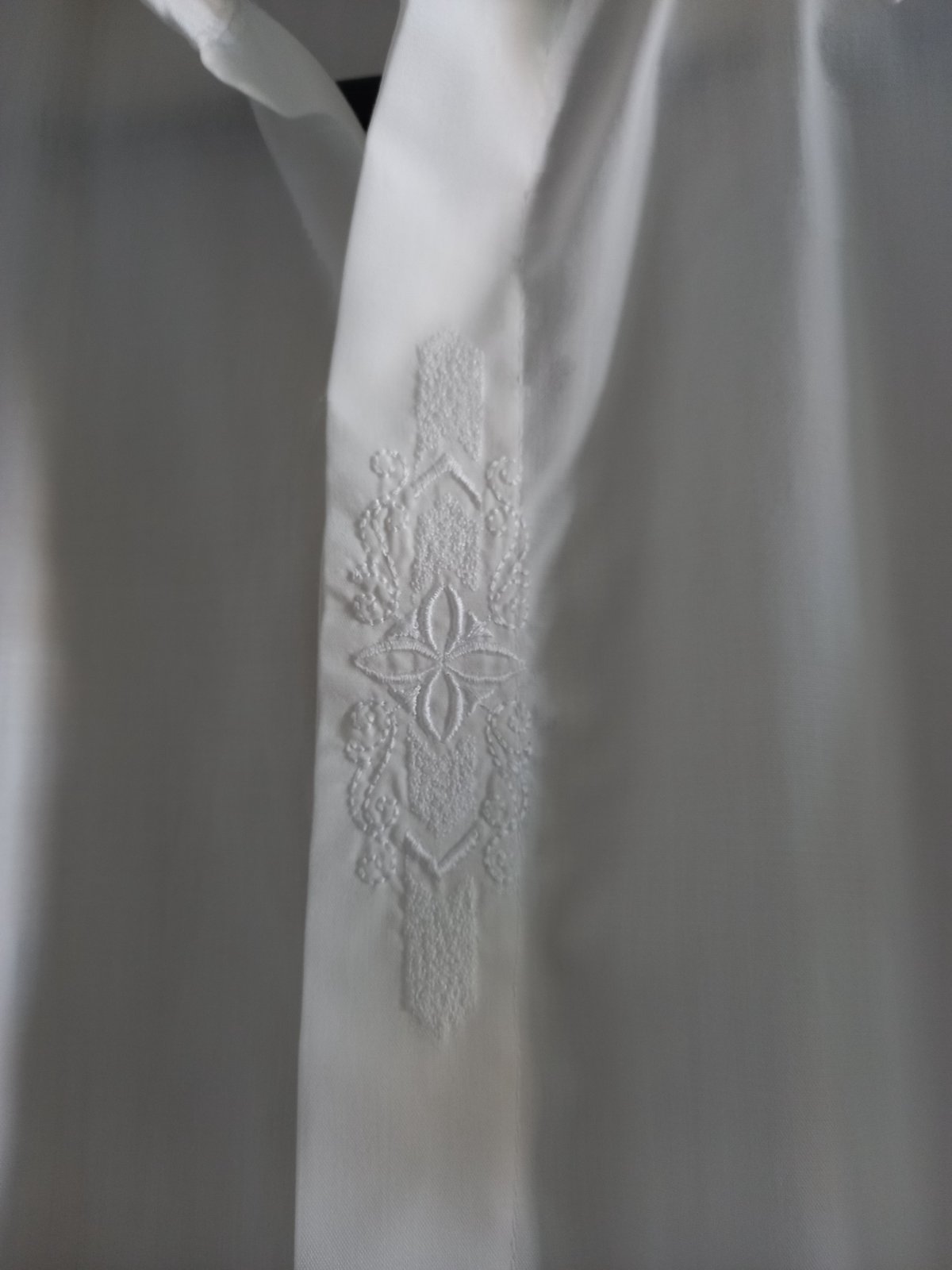 Košeľa, odhadom veľ. 140, na donosenie, je volnejsia, biela nie je žiarivá biela, do bezova