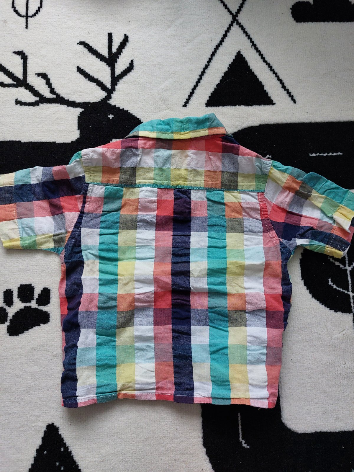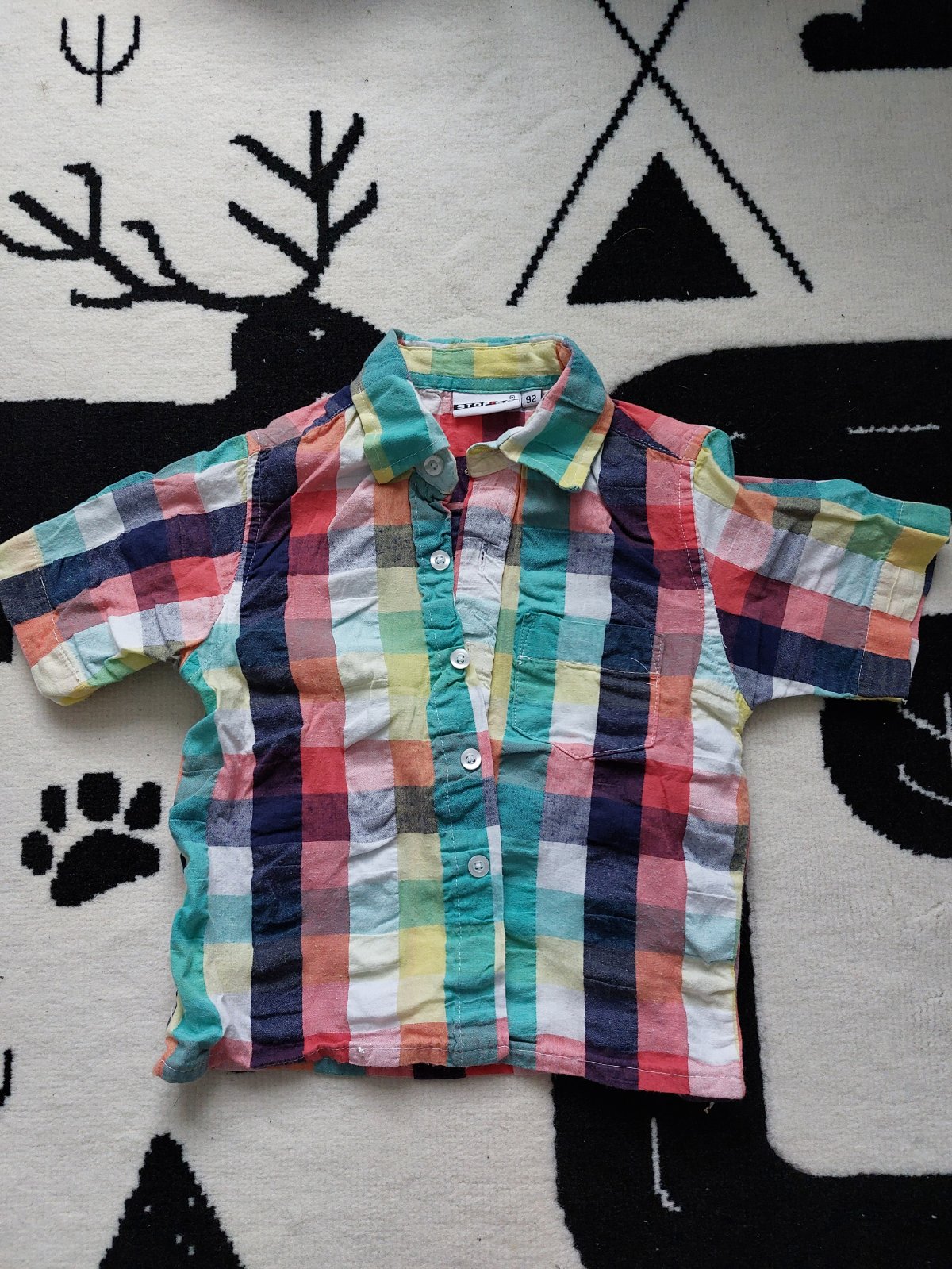 Pekna farebná kosela. Velkost písaná 92, ale je väčšia. 98 alebo až 104, vid rozmery. Sirka 33,5cm dlzka od krku cca 38. Je to taky jemne zvlneny material,takže si netreba robiť starosti s dokonalym zehlenim.