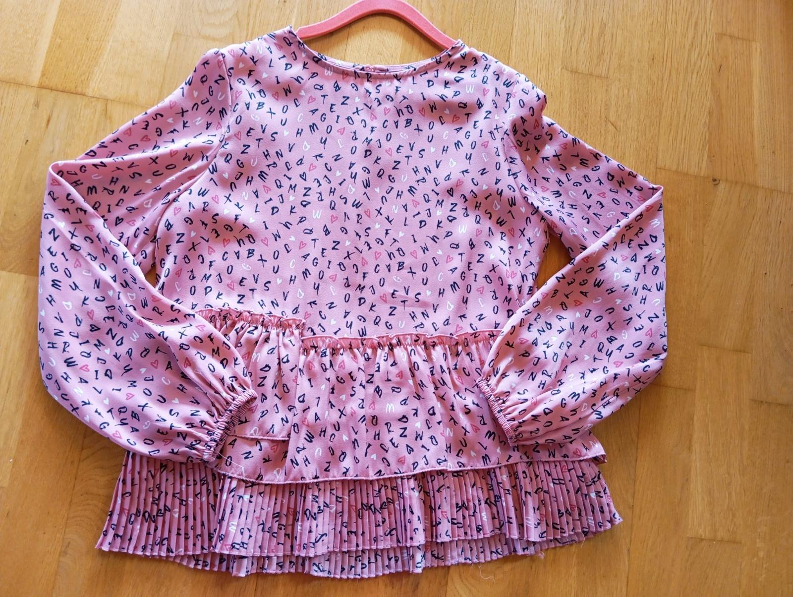 Nádherná blúzka, veľ. 152, kvalitnej značky Mayoral. Blúzka je ľahučká, padavá, nekrčivý materiál. Bez poškodení, super stav! Máme k nej aj vestičku, ktorá sa hodí práve k nej. Hoci je vesta veľ. 140, sedí priamo veľkosťou na túto blúzku. Vesta je rovnako hebká ako blúzka. Vestička s blúzkou sú odfotené na poslednej fotke. Cena za blúzku je 13,50 €, cena za vestu je 14,50 €, ale ak by ste zobrali obe, predám za 27 € spolu.