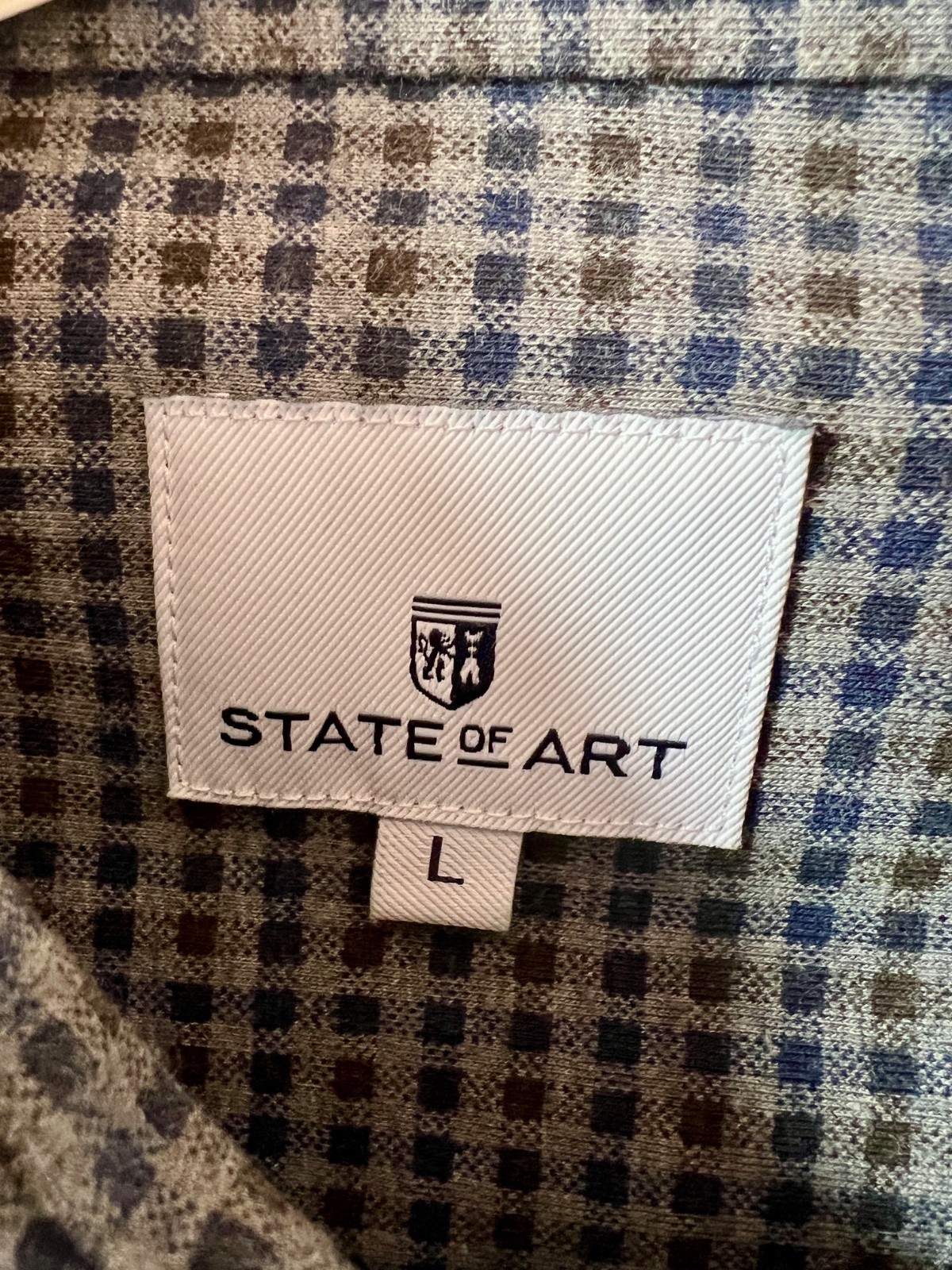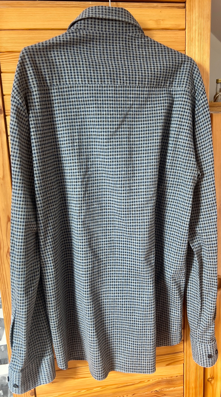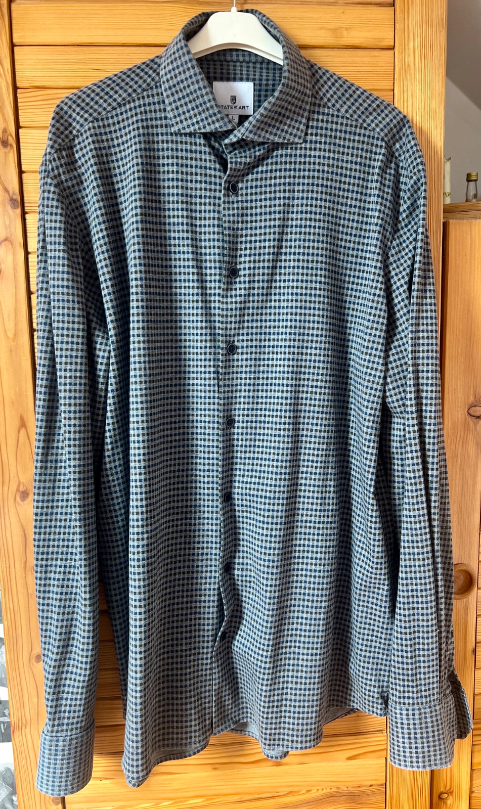 Kockovaná košeľa šedej farby. Mäkký, príjemný materiál. Klasický strih, vyzerá dobre aj k obyčajným rifliam. Značka State of Art. Veľkosť L.