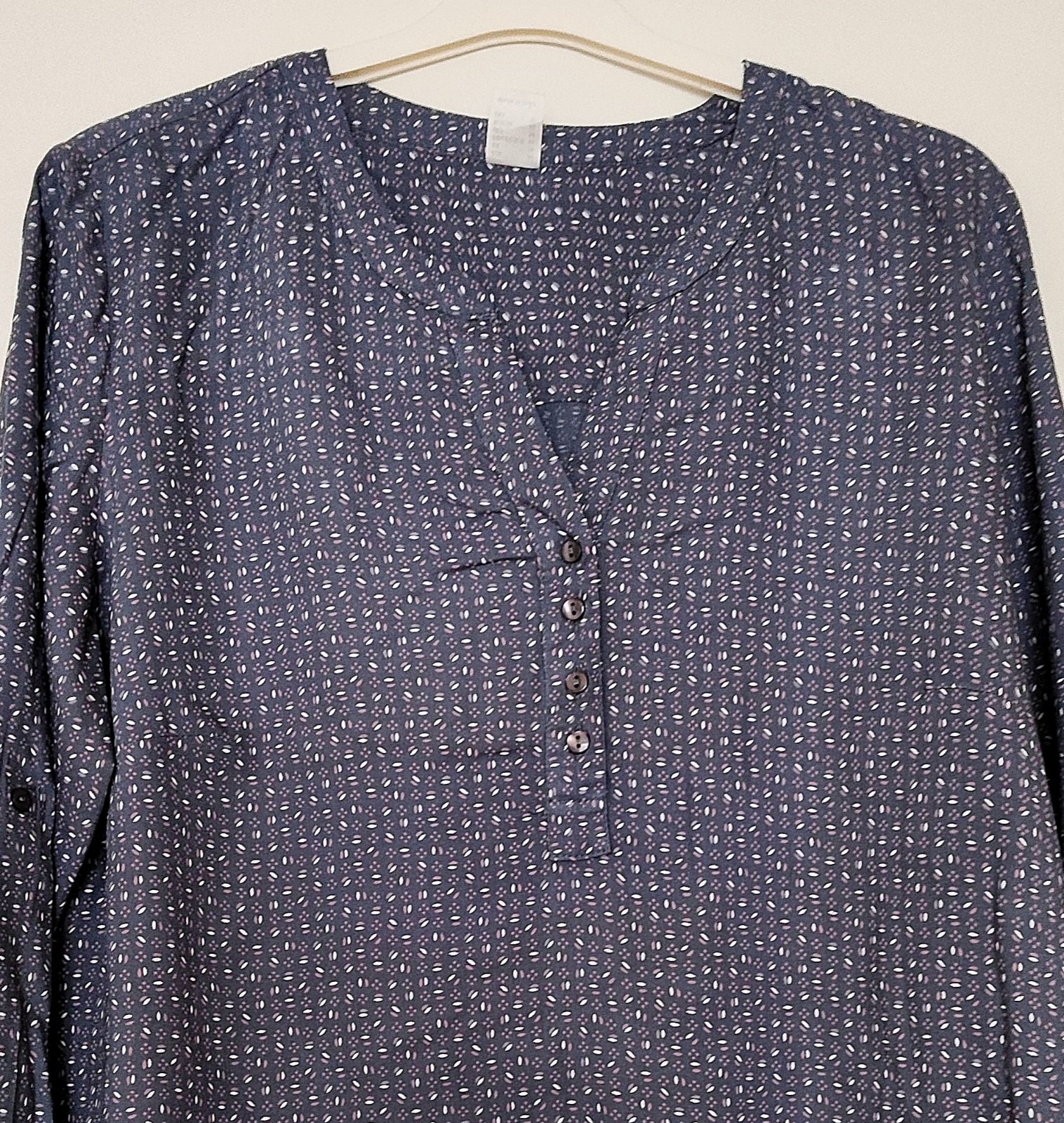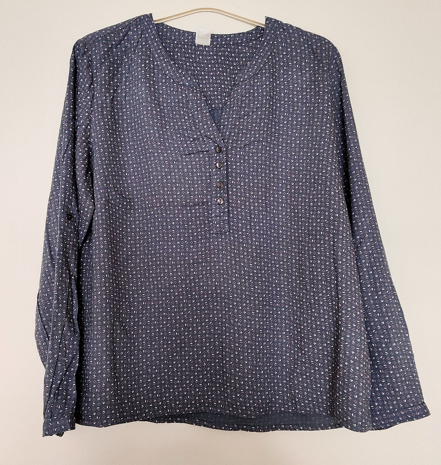 Tmavo šedá blúzka s bielymi vzormi. Materiál je mierne priesvitný. Blúzka ma niekoľko zatiahnutých nitiek - pozri si foto. Miery hrudník: 2x64cm dĺžka vpredu: 66cm dĺžka vzadu: 82cm