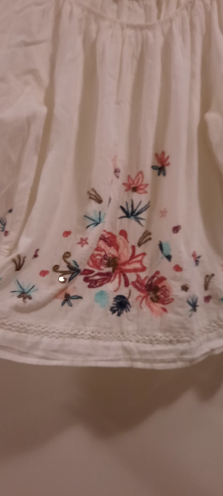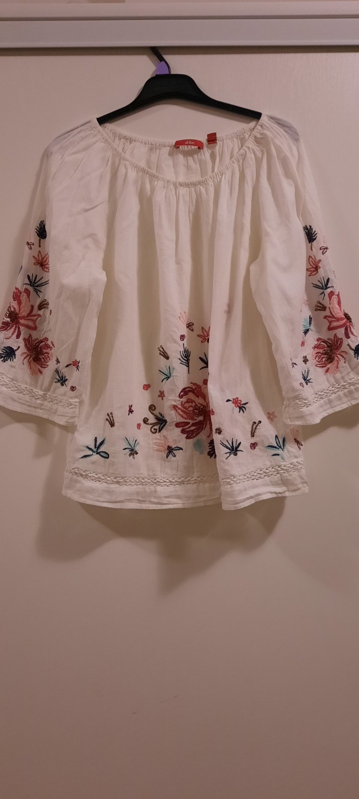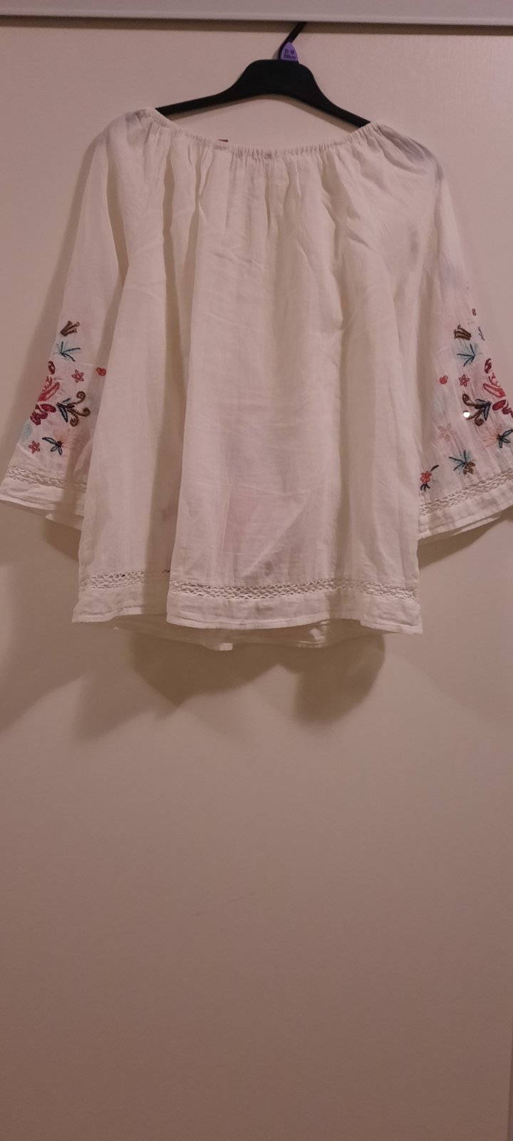 Voľná bluzka, guľatý vystrih na gumicku, dole volna. Rukávy 3/4, volne. Obvod cez prsia 55x2cm, dlzka chrbta 57 cm. Dlzka rukava 49cm od ramena.