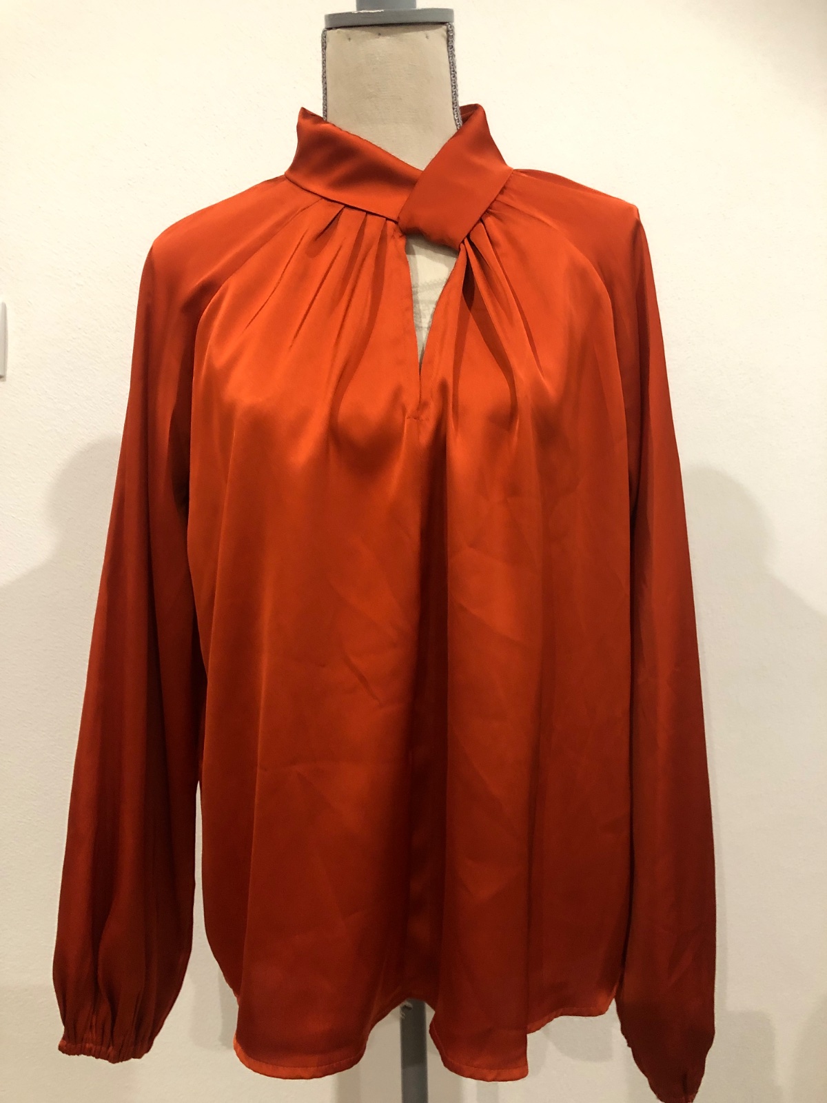 Saténová príležitostná bluzka voľného padaveho strihu bez poškodenia, zapinanie 2 gombíky ZD stojacika, rukáv ukončený gumičkou, celková dĺžka 65cm, šírka v podpazuší max. 57cm, dĺžka rukáva od krku 75cm