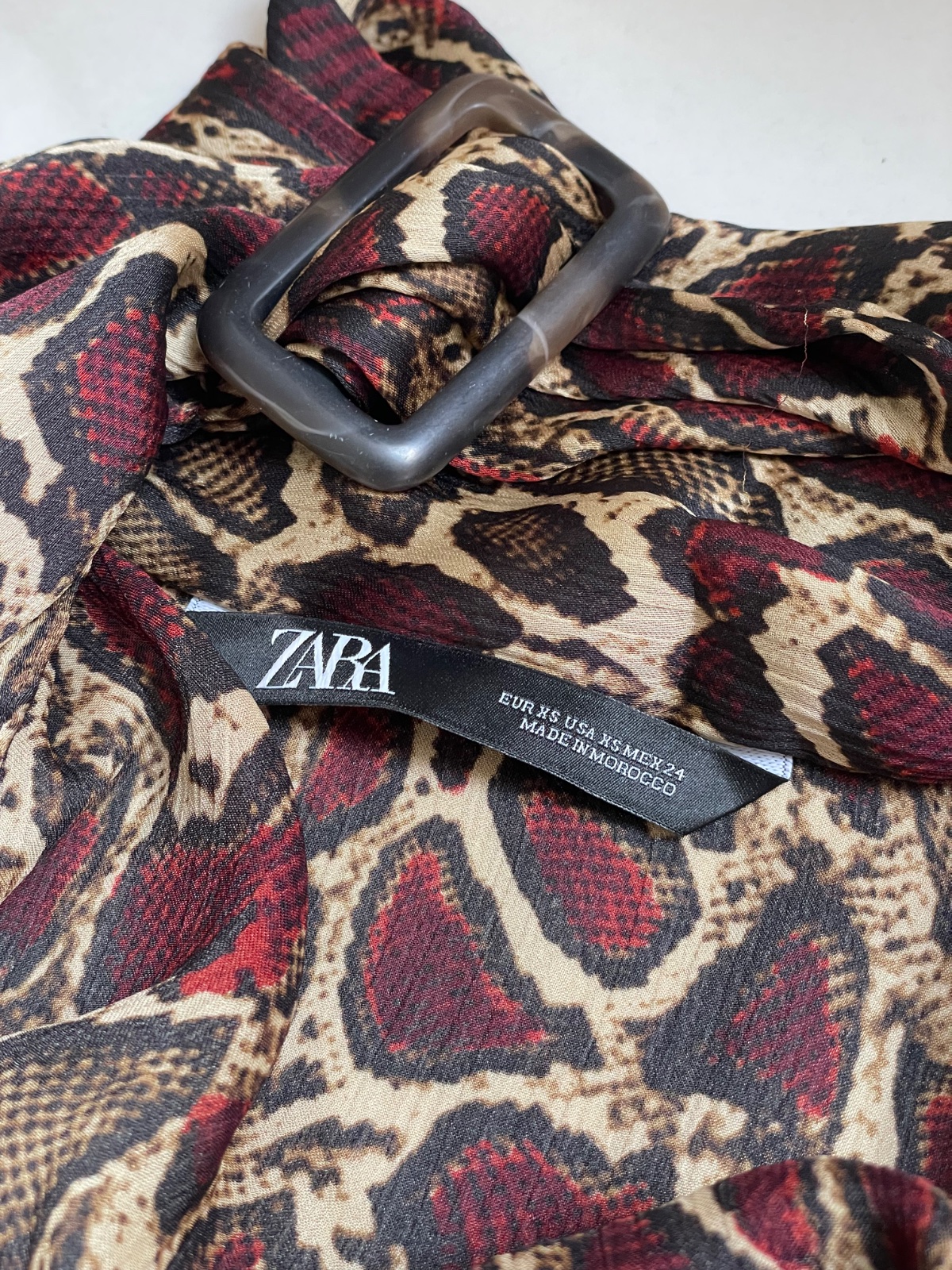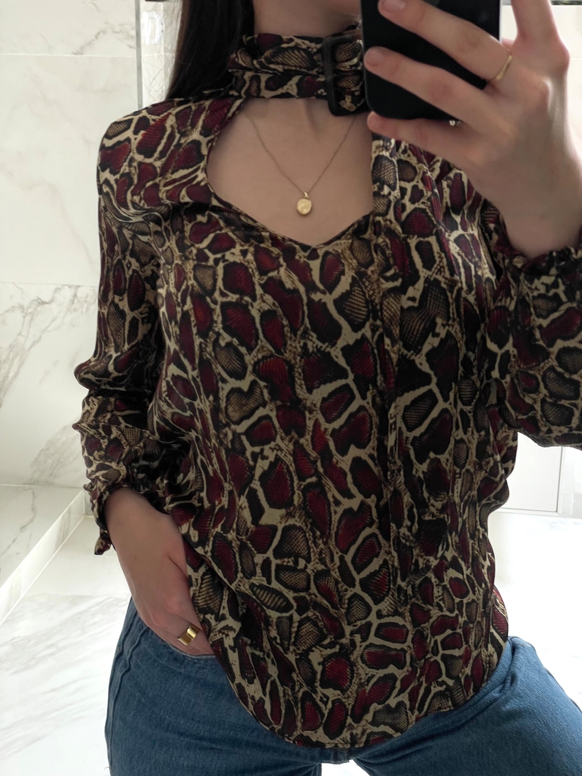 Predám výraznú saténovú blúzku so zvieracím vzorom zo Zary, veľkosť XS. Má zaujímavo riešený výstrih so stojatým golierom a prackou okolo krku. Materiál je jemný, padavý. Vychytávka tohto kúsku je rozhodne ten detail s golierom – buď klasicky alebo s odhaleným dekoltom, podľa nálady.