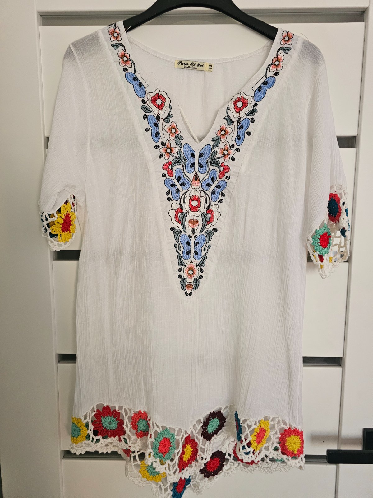 Univerzálna veľkosť Voľná blúzka, možné nosiť s opaskom alebo bez Šírka v prsiach: 55cm Dĺžka: 71cm (predná časť), 78cm(zadná časť) Rukáv: 43cm