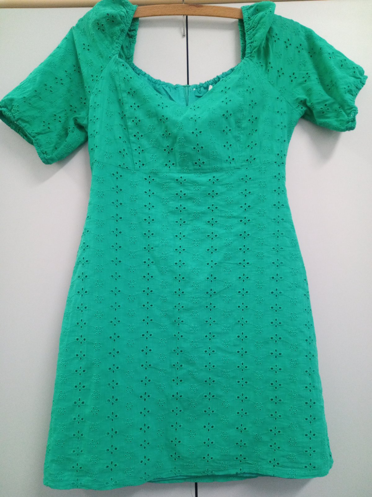 Veľmi dobrý stav, veľkosť 38. Pazuchy 52 cm, pás 48 cm a dĺžka 78 cm. S vreckom a ozdobným opaskom. Rukávy je možné vyhrhnúť. Cena 5 eur plus poštovné.