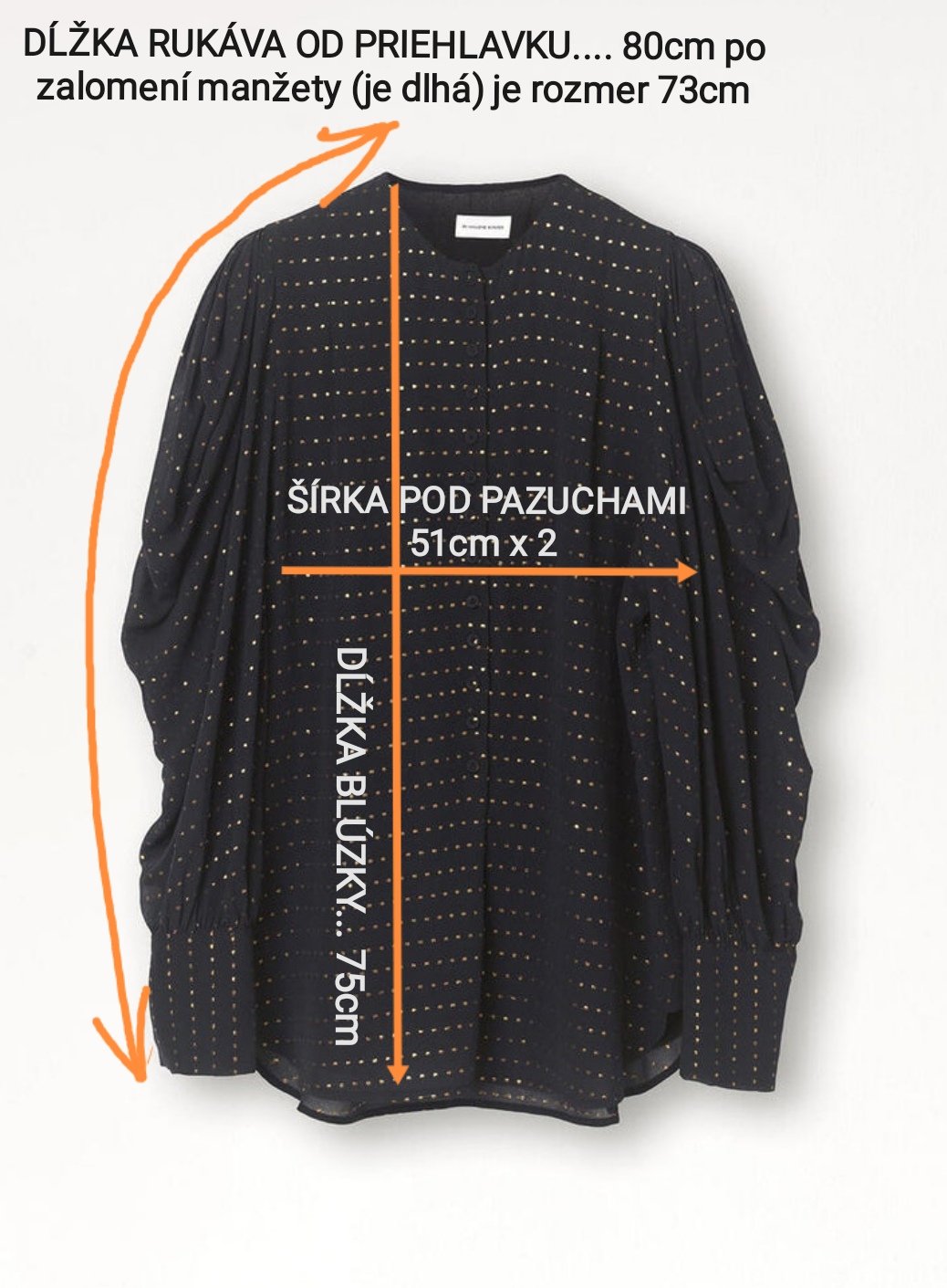 Ponúkam luxusnú blúzku od mojej obľúbenej značky By Malene Birger s cool naberými rukávmi z čierneho mušelínu so zlatými bodkami s menom Milaelle.