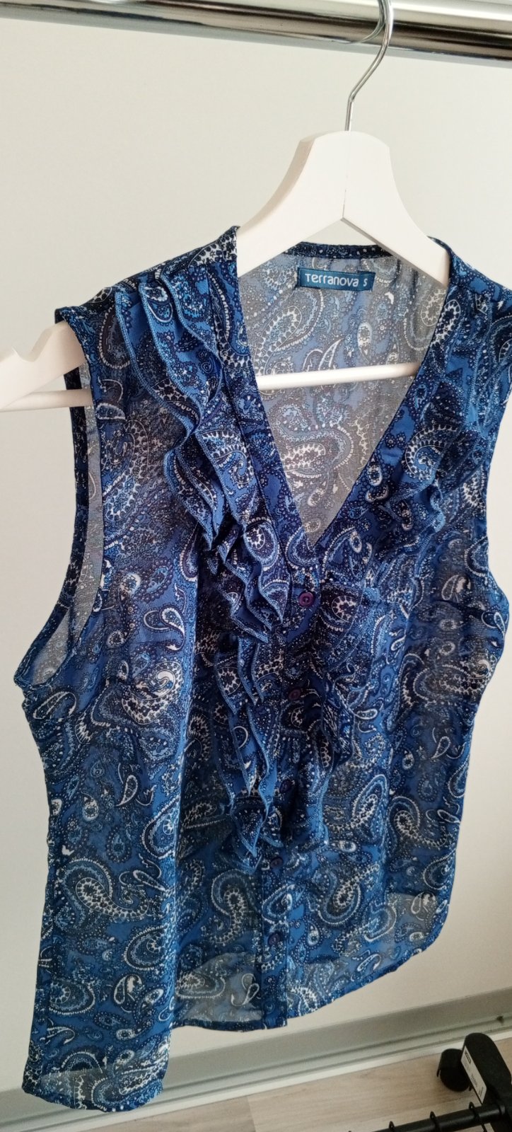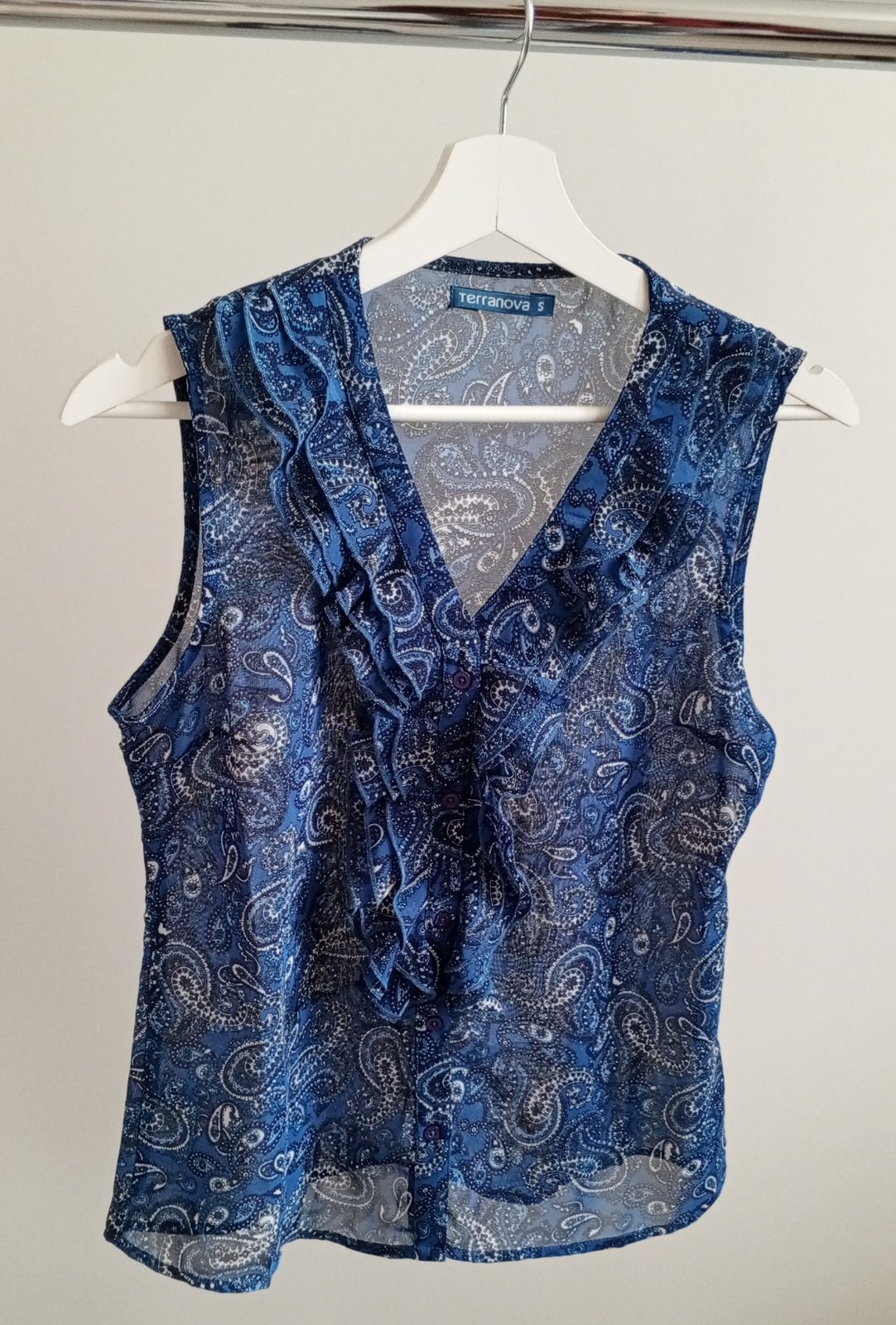 dámska tenká modrá riflová košeľa, zapínanie na gombíky, náprsné vrecká, príjemný kvalitný materiál, zloženie: 100 % bavlna, stav: výborný, málo nosený, značka: Terranova, uvádzaná veľkosť na štít...