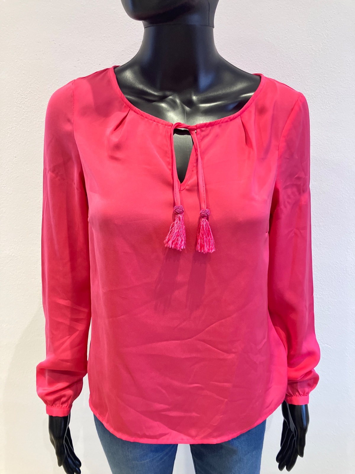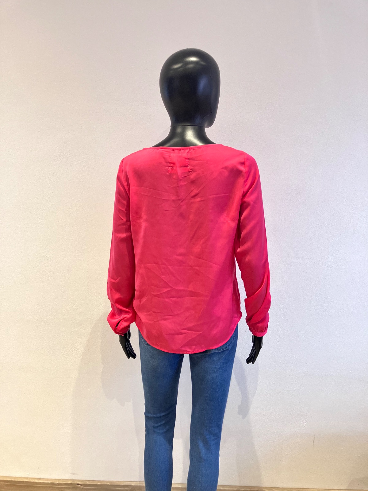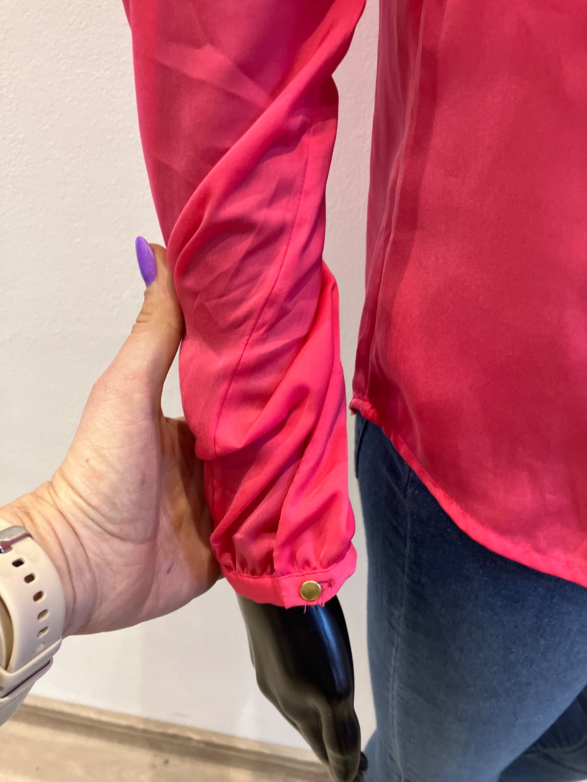 Blúzka s dlhým rukávom, výrazná ružová, tenká, nie je elastická, jemne priesvitná.