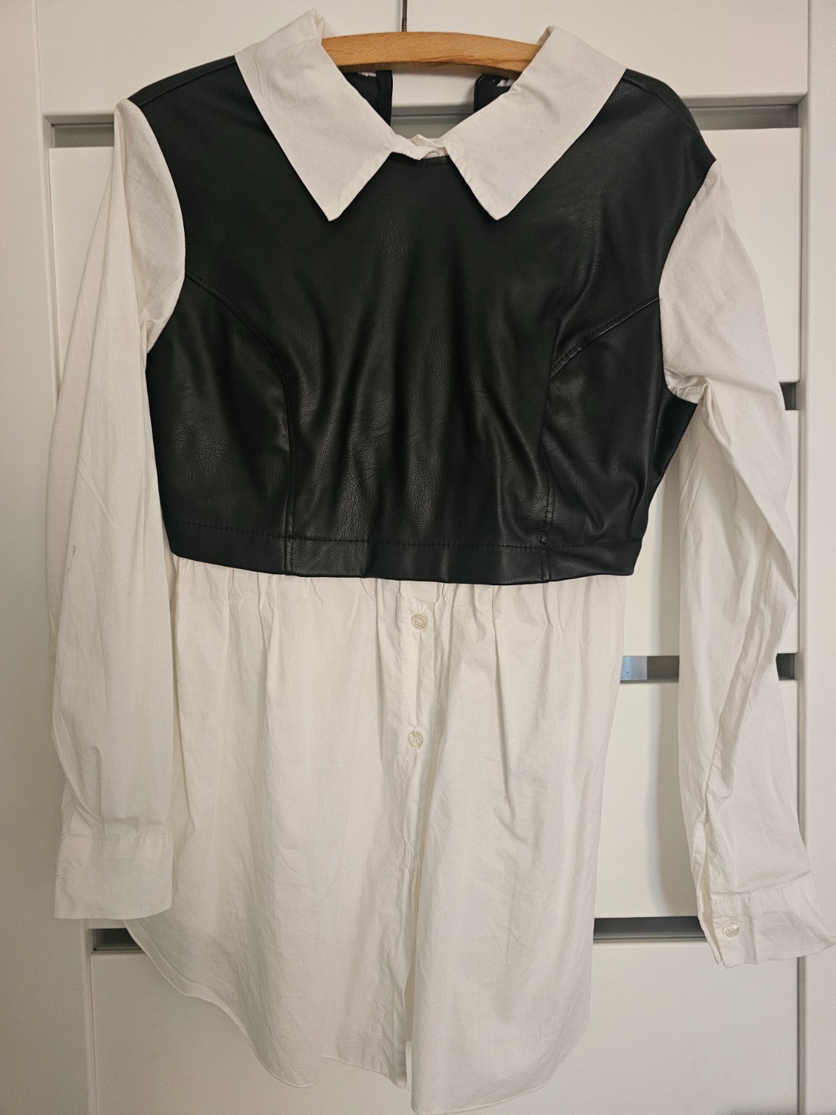 krásna biela štýlová košeľa s koženkovou aplikáciou. veľkosť UNI, košeľa sadne na veľkosti S-L vyrobená v Taliansku dlžka 77cm pod pazuchami 55cm x 2