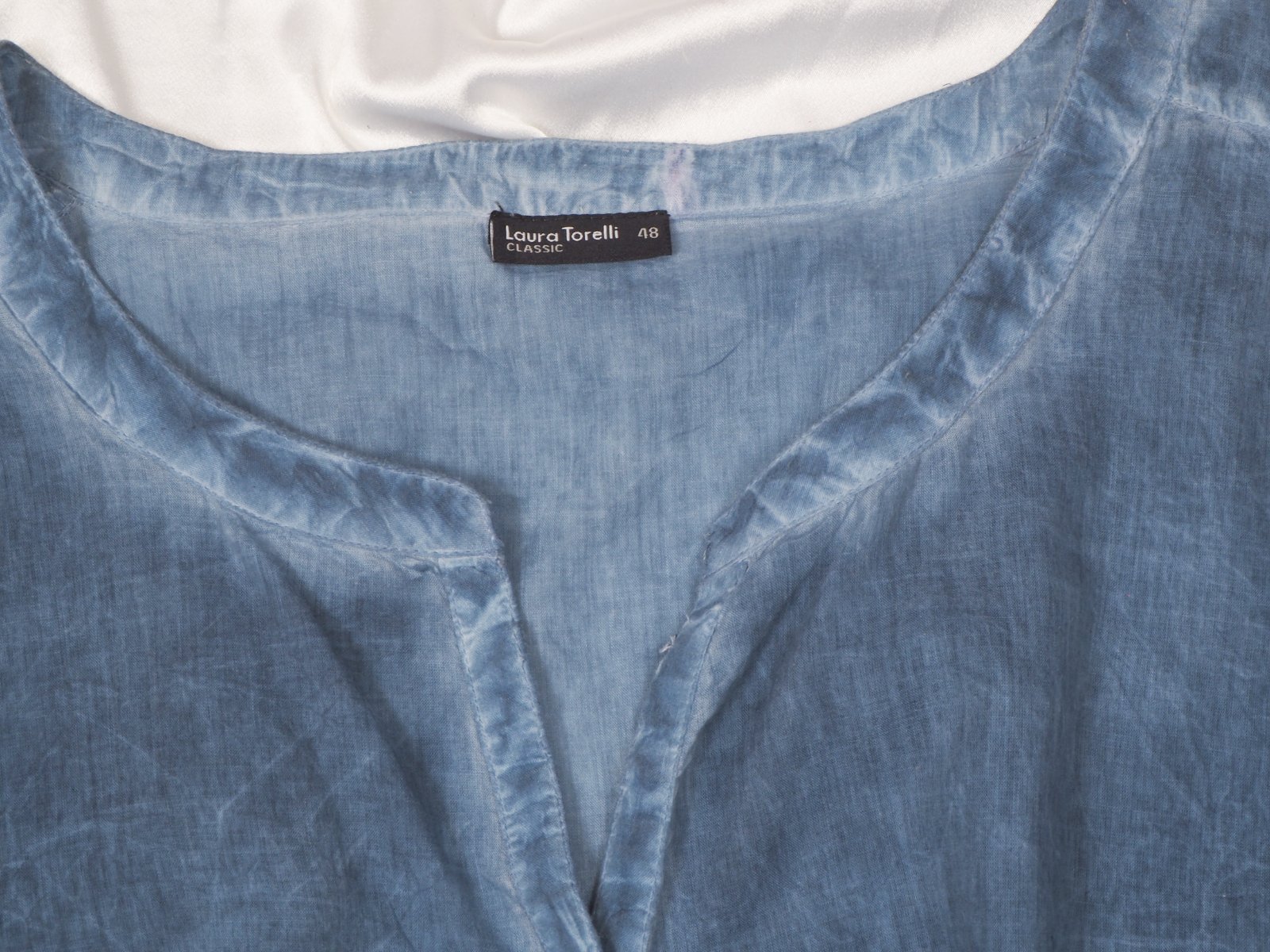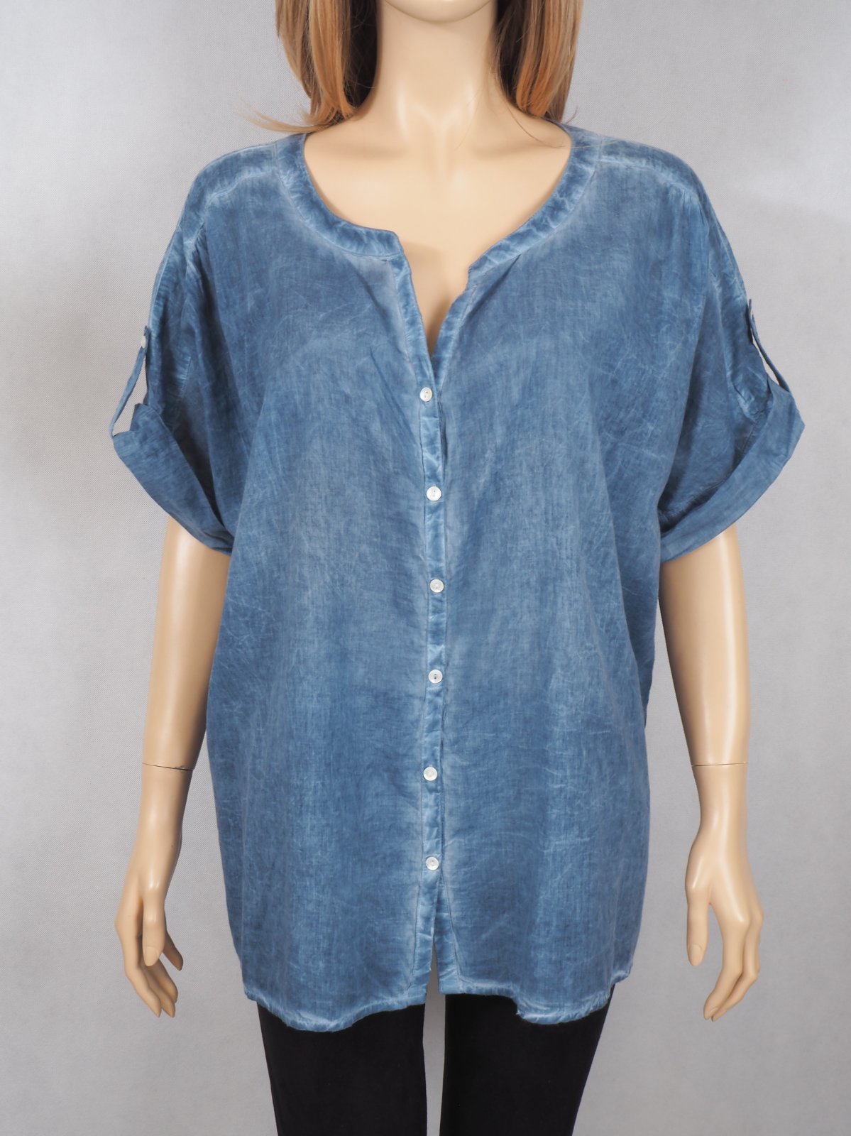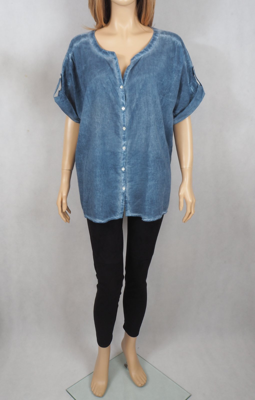 Kvalitná dámska blúzka modrej farby, jemne batikovaná, zapínanie na gombíky, materiál 100% bavlna, super stav.
