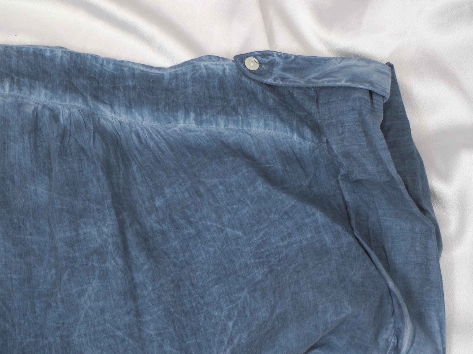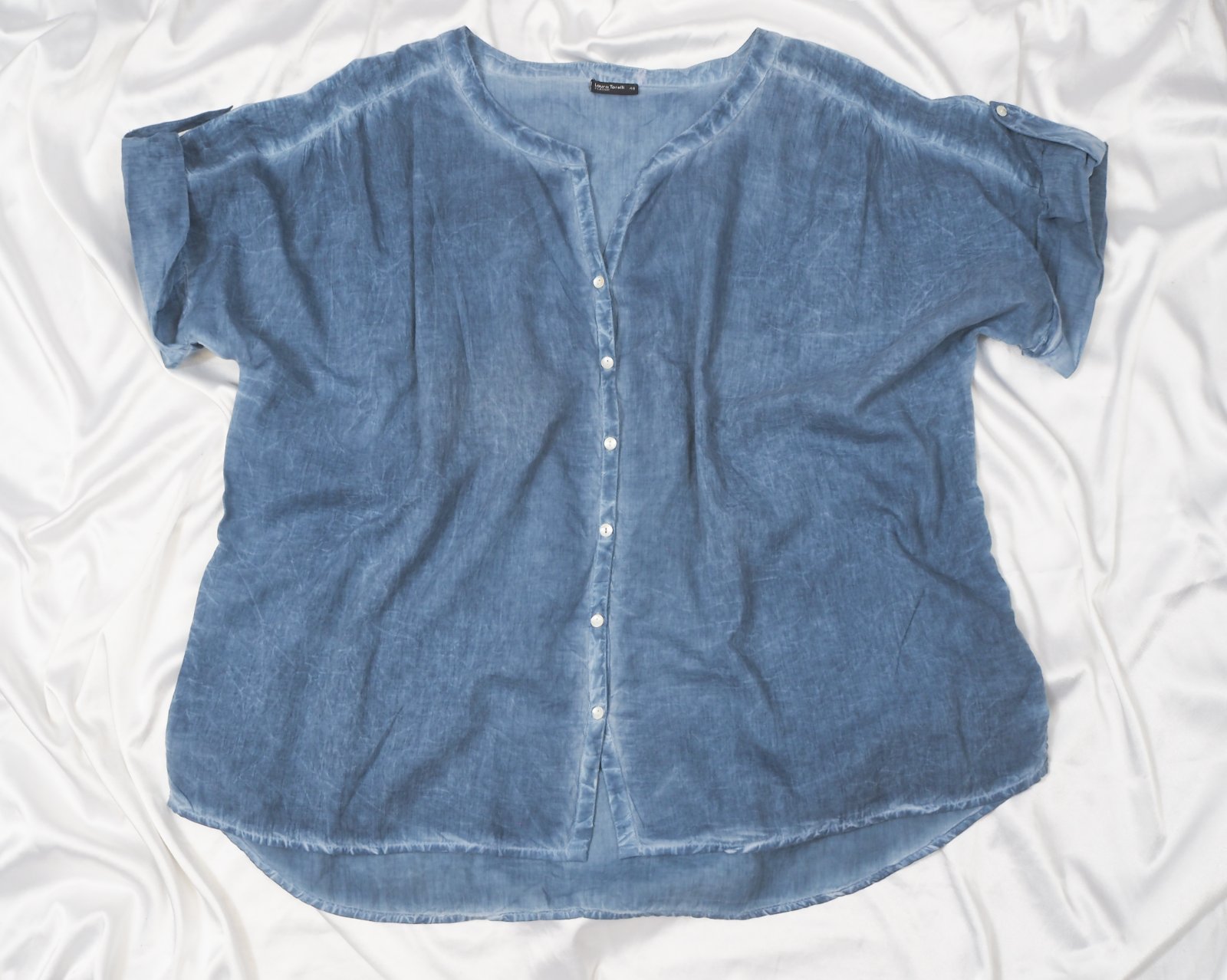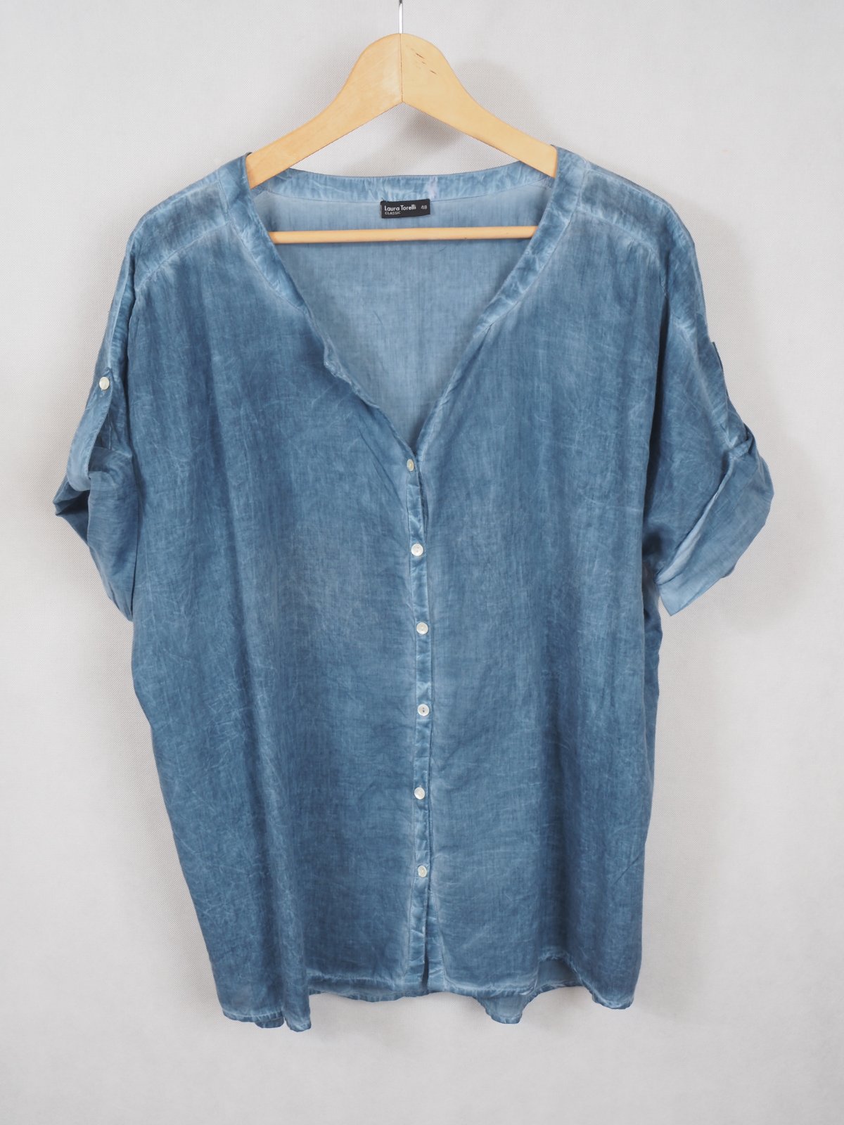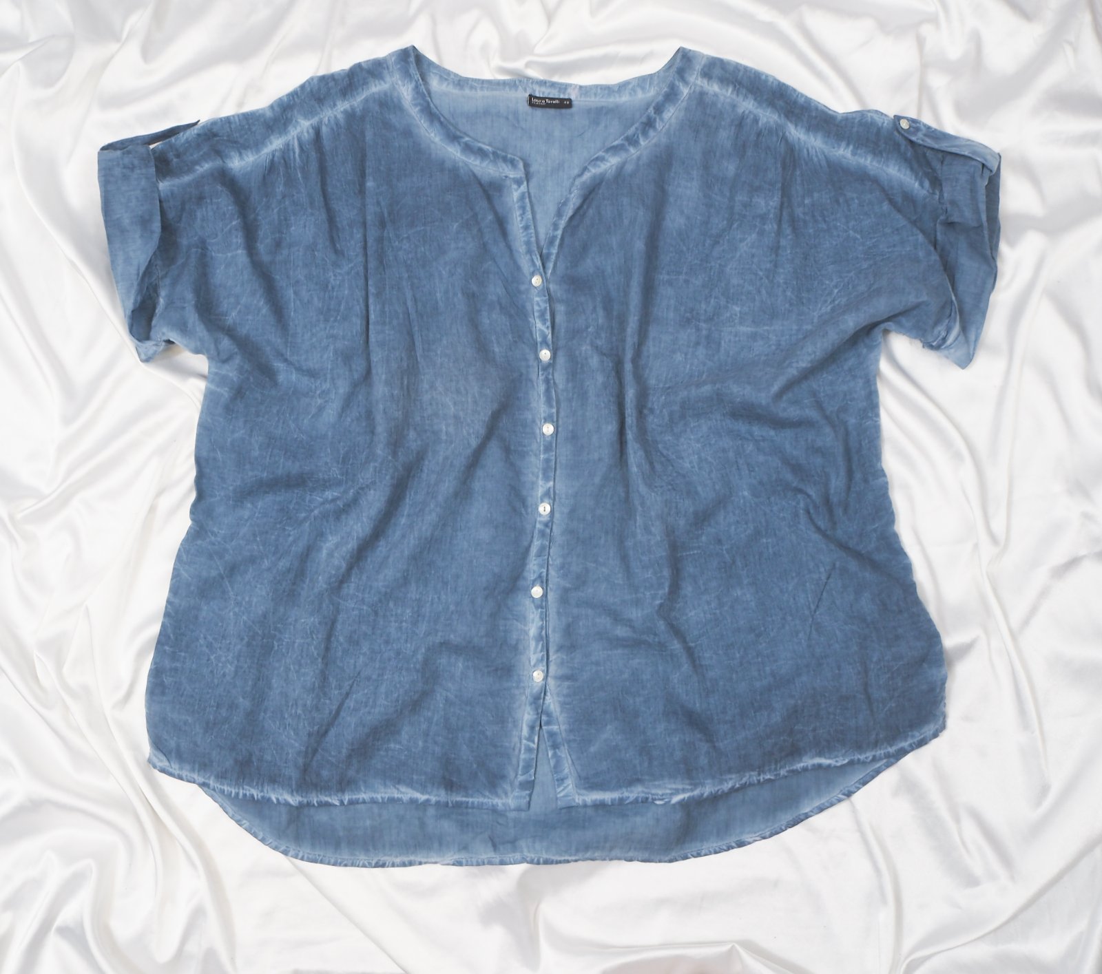 Kvalitná dámska blúzka modrej farby, jemne batikovaná, zapínanie na gombíky, materiál 100% bavlna, super stav.