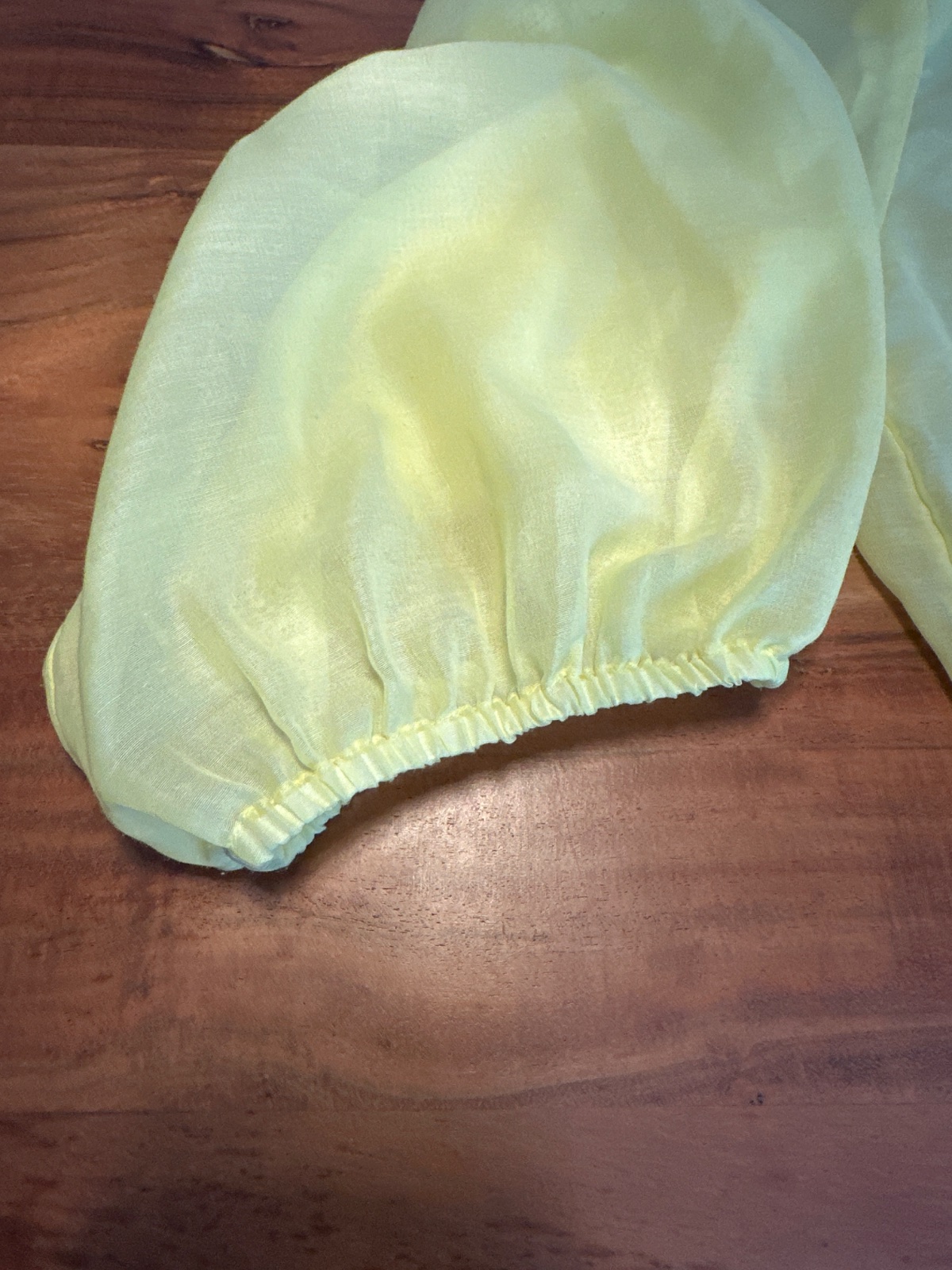 Ľahučká letná blúza. Farba citrónová žltá ako na prvej foto. POkrúhly výstrih okolo krku s prišitými mini gorálkami. Širší, voľnejší strih. Rukávy ukončené do gumičky, spodná časť rovnako s gumičkou na zaviazanie. Bez poškodení. Dĺžka 61 cm, šírka cez hrudník 2 x 61 cm, rukáv od krku 65 cm, dá sa podvihnúť ako chcete.