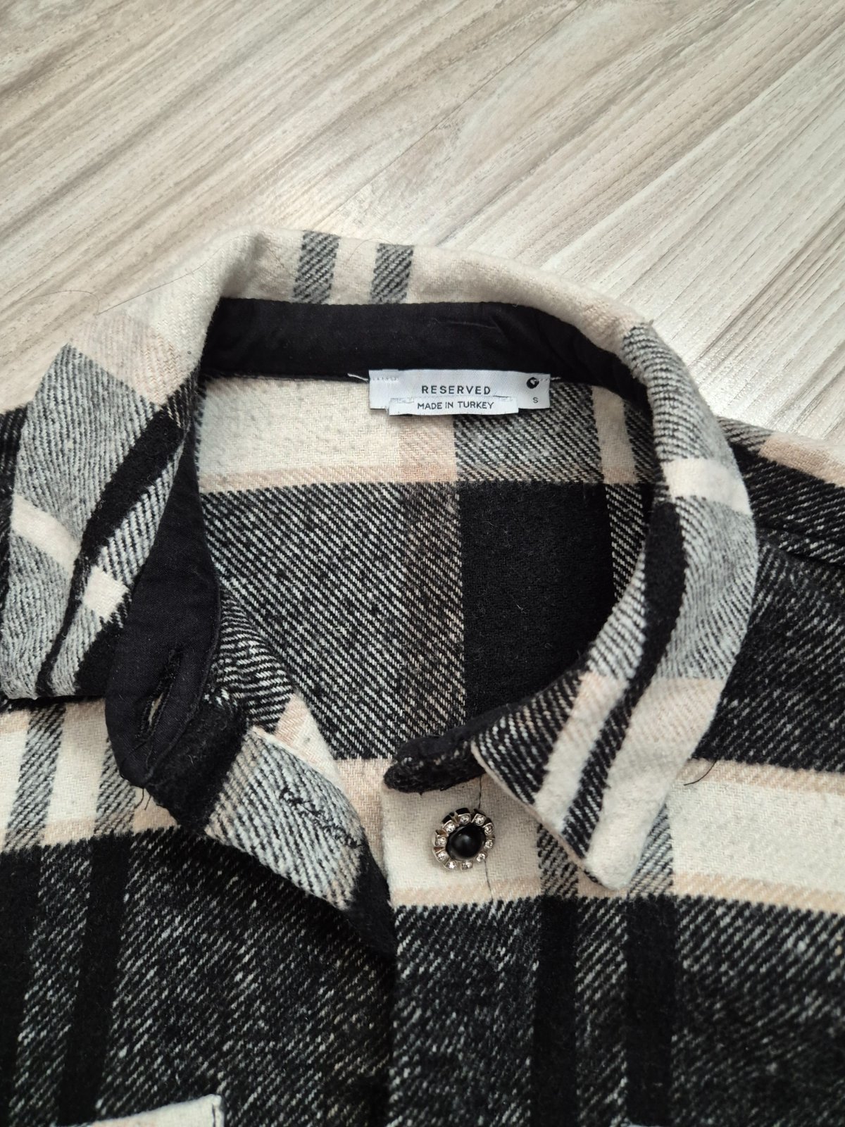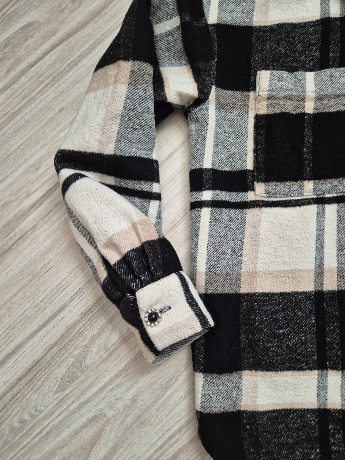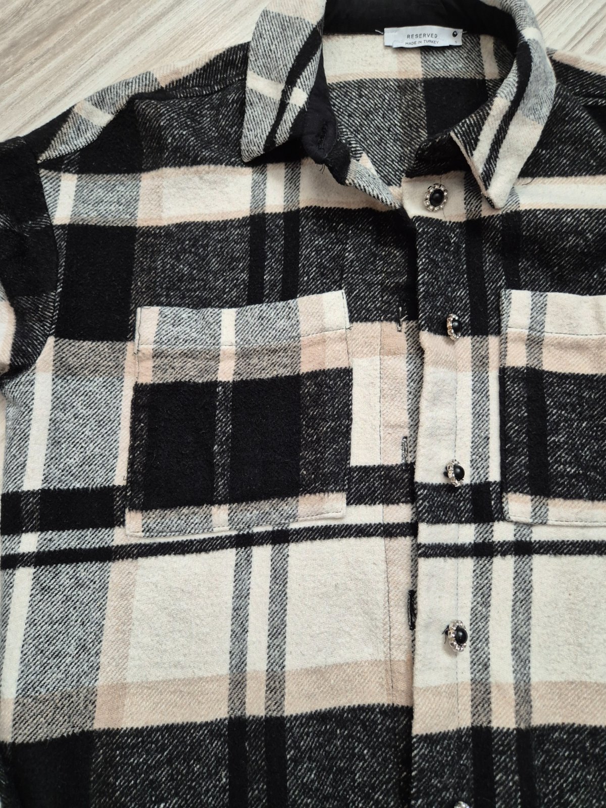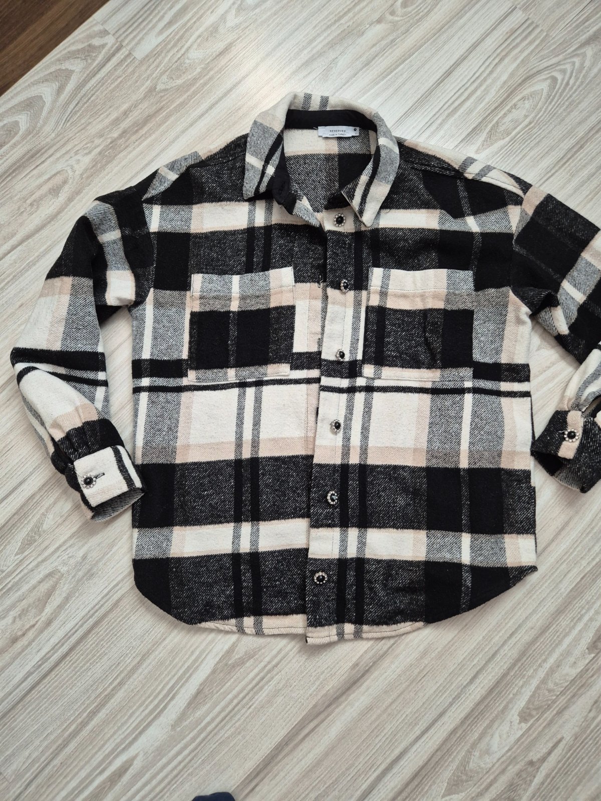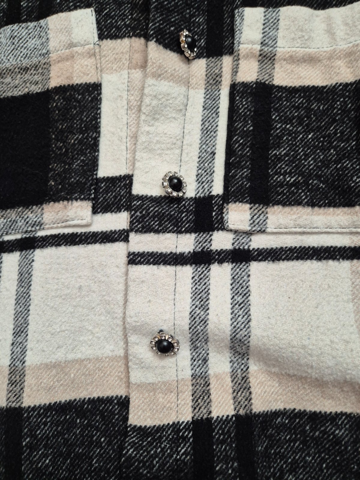 Minimálne nosená košeľa s ozdobnými gombíkmi.
