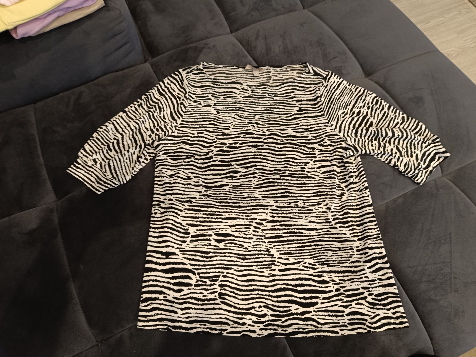 Blúzka, či kratšia vzorovaná tunika, voľná vzdušná, veľkosť uvádzaná XS, no myslím že ju oblečú aj veľkosti S, M, zaujímavý výstrih rovnaký vpredu aj vzadu, balónové rukávy po lakeť, vpadavá látka ...