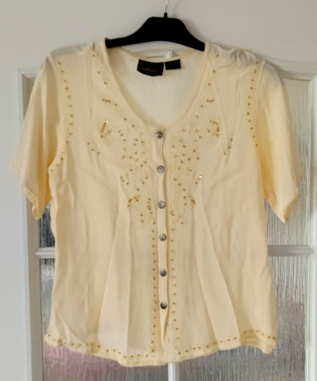 Blúzka z ľanu, je to taká halenka alebo košeľa. Zapína sa na 2 gombíky + viaže sa pod prisiami. Veľkosť L-XL, záleží od postavy. Na požiadanie premeriam
