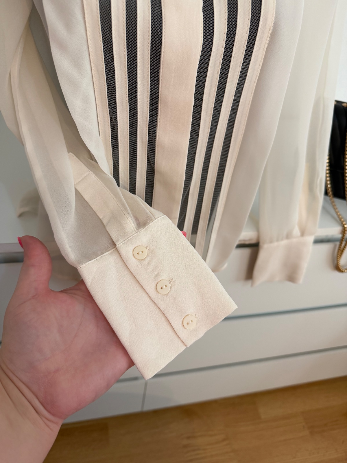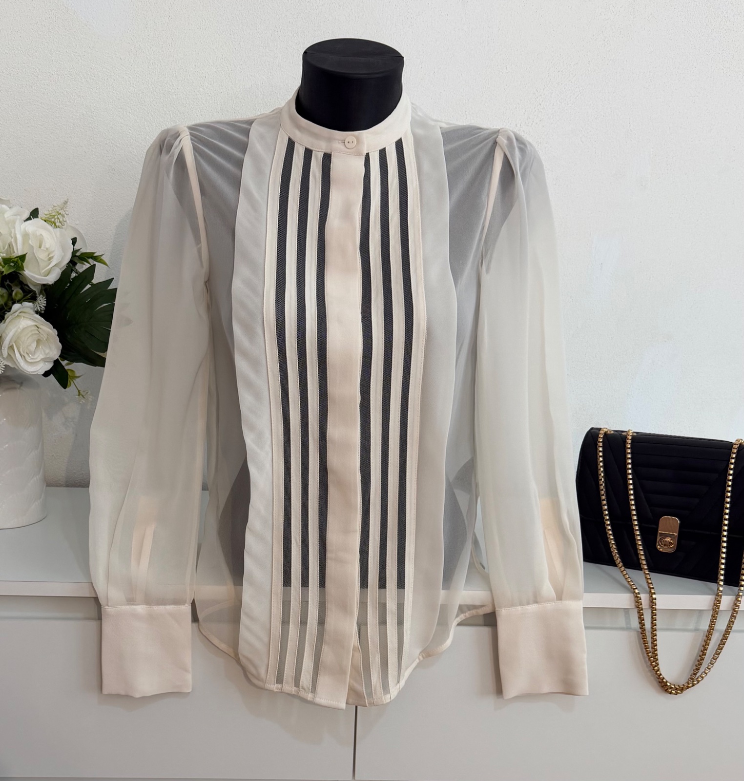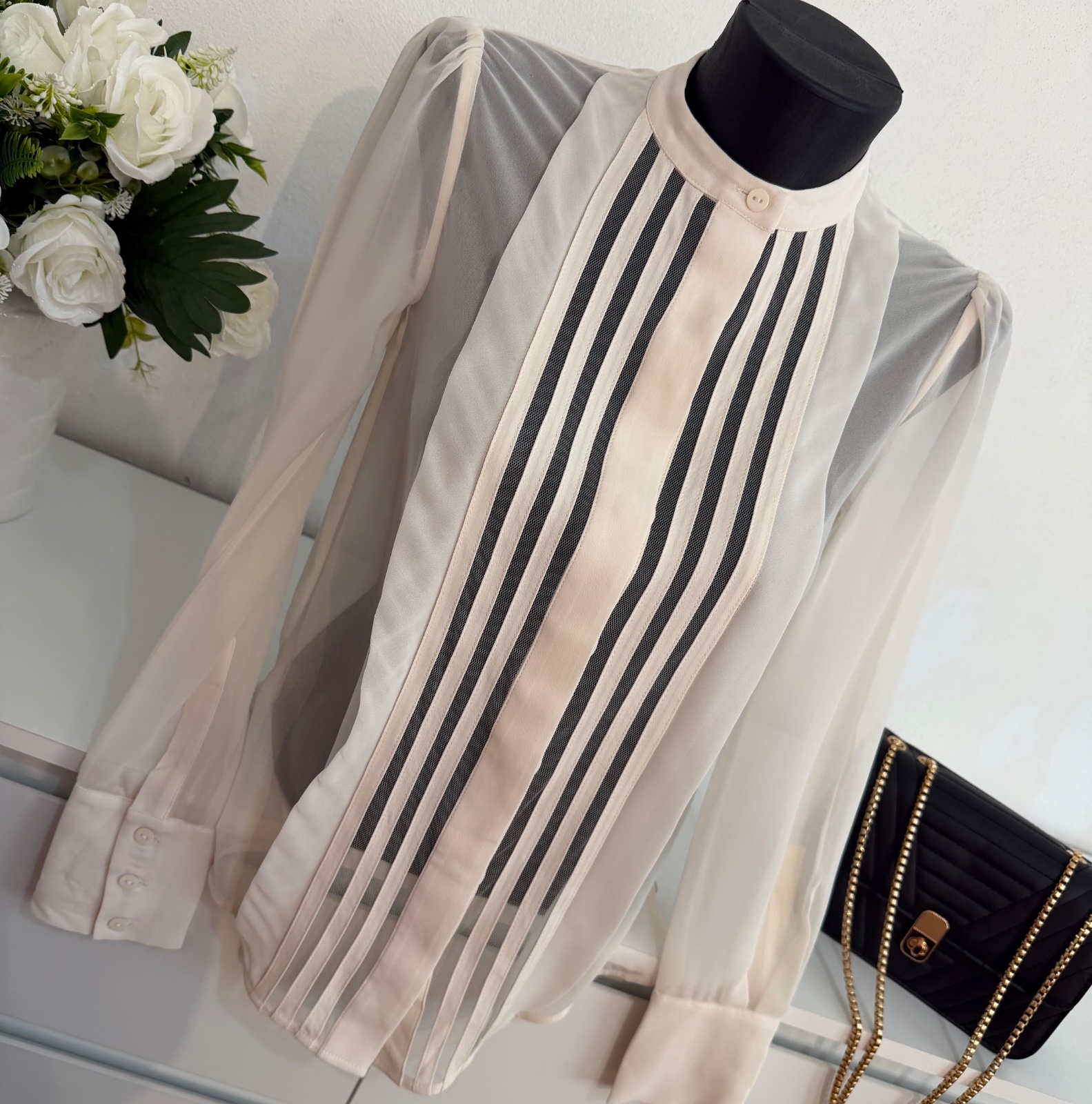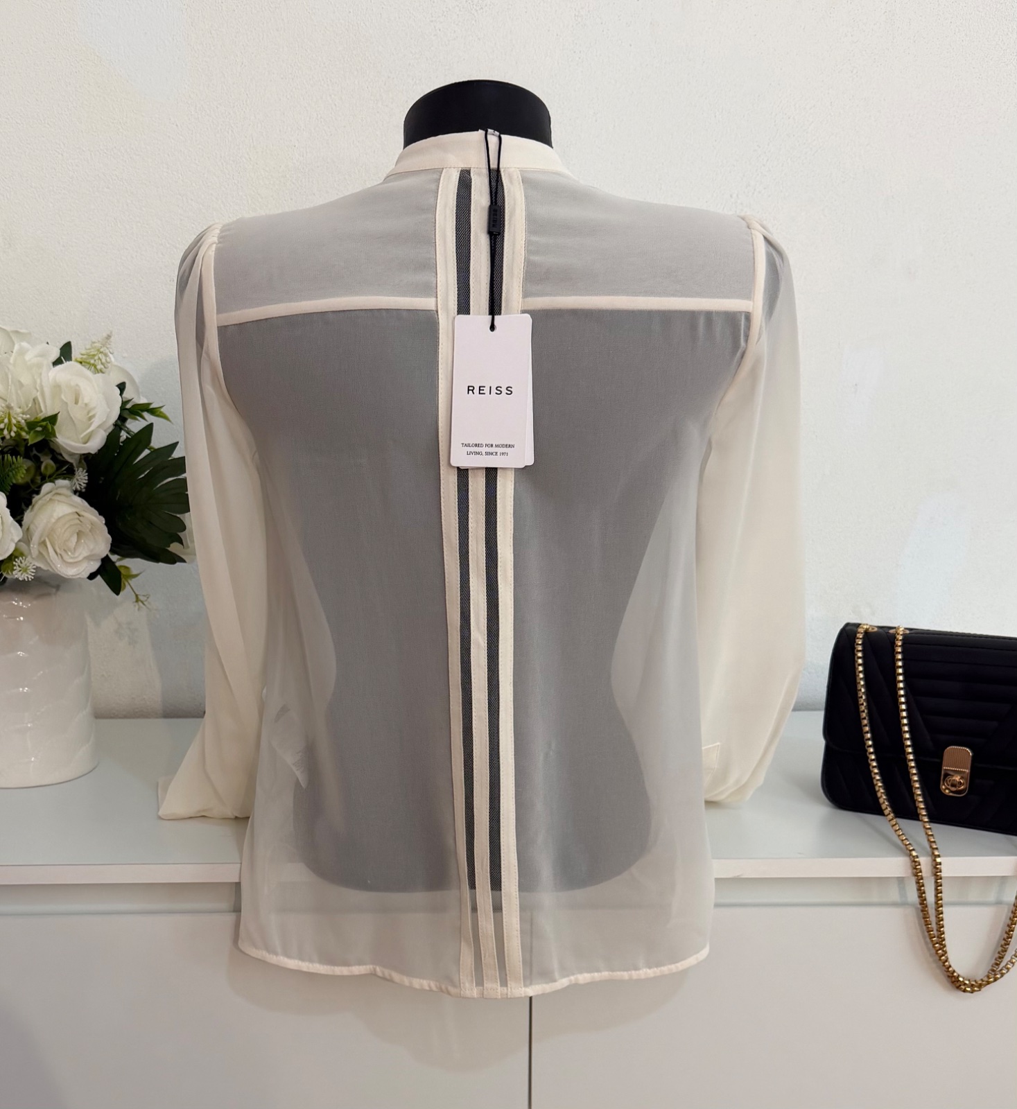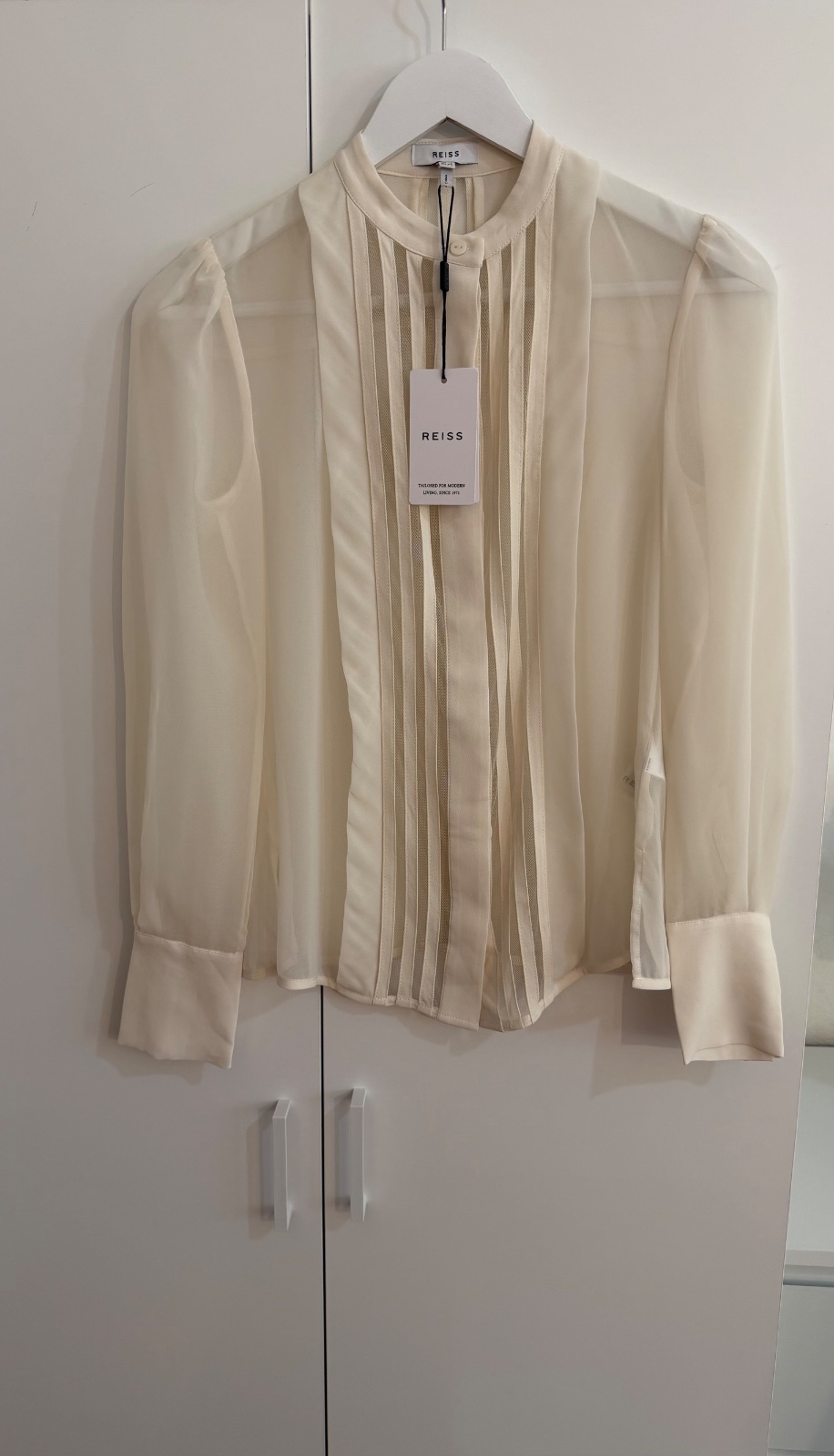 Táto nádherná blúzka značky REISS je stelesnením jemného luxusu a ženskosti. V elegantnom krémovom odtieni s precíznymi transparentnými panelmi a vertikálnymi detailmi, ktoré krásne predlžujú siluetu.