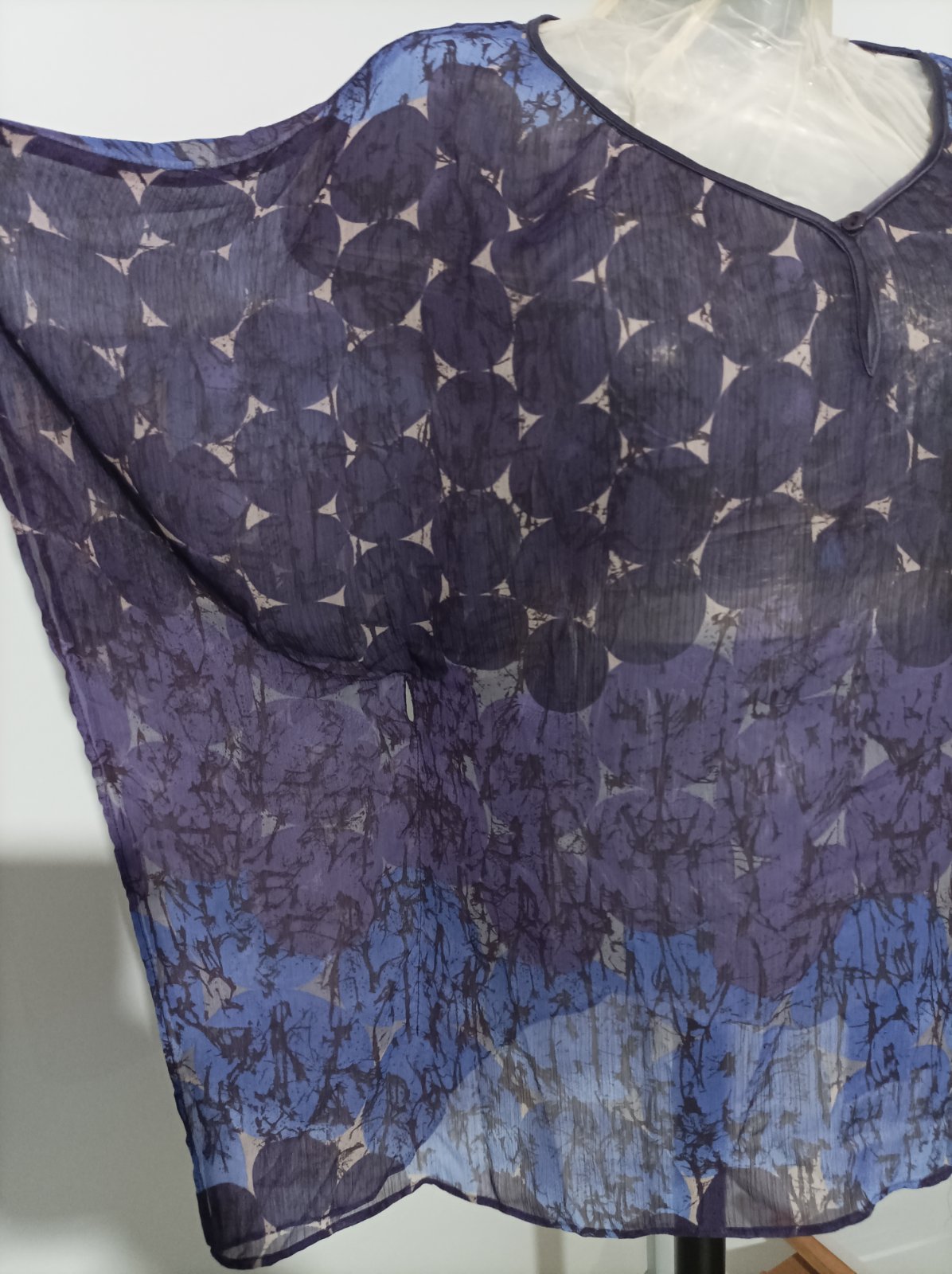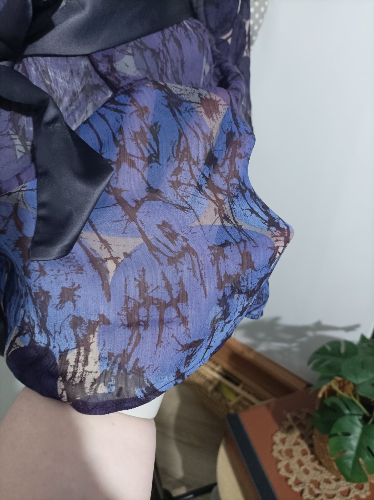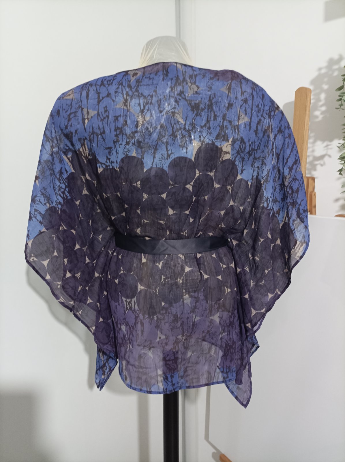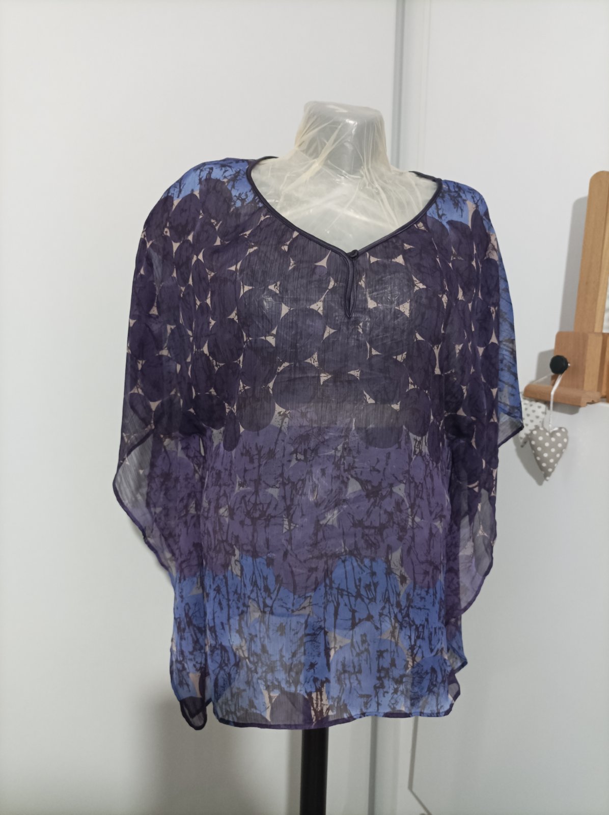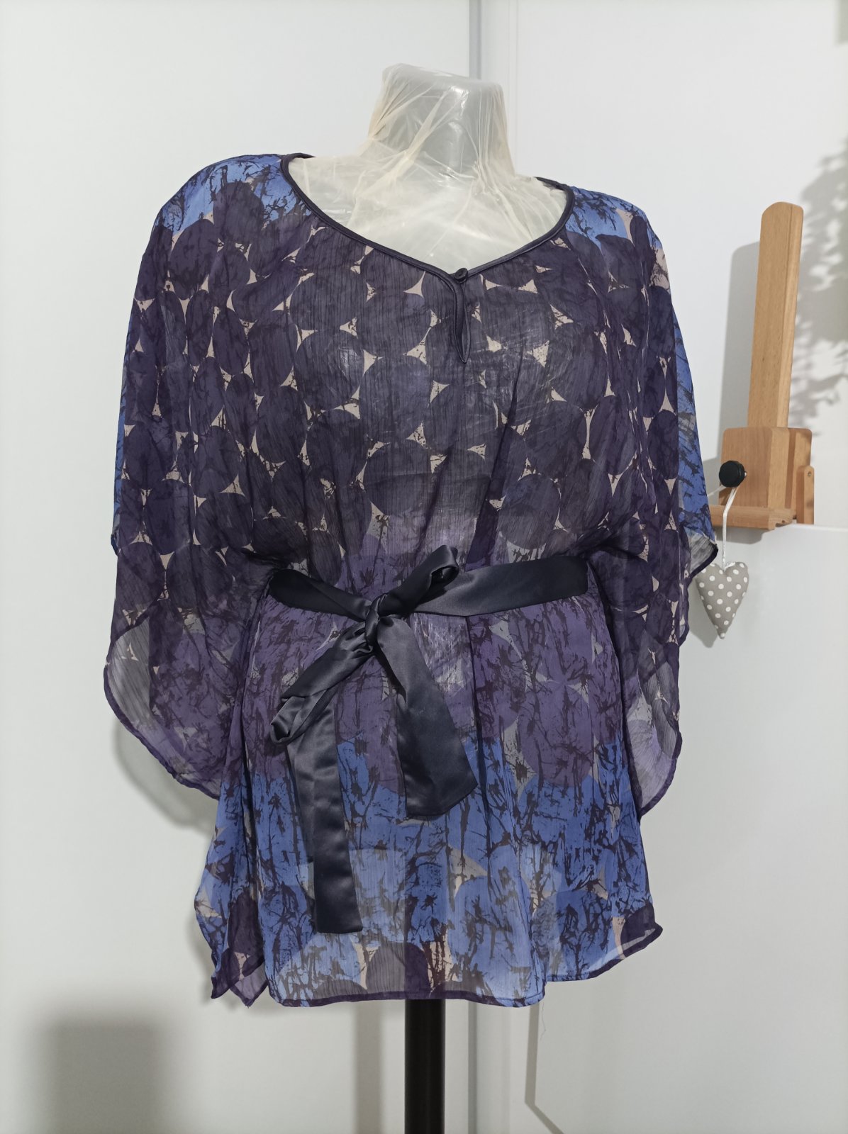 Priesvitná halenka vo fialovych odtieňoch. Nosí sa pod to tielko, odporúčam s tenkými ramienkami, krajšie vynikne. Rukávy má netopiere, dĺžka po lakte. Viazanka je saténová, robí peknú postavu, viaže sa na úrovni pásu. Je to voľné, vzdušné, naozaj pekný kúsok. Noseny máličko, top stav. Veľkosť udana L, aby to malo pekný voľný efekt odporúčam M/L, väčšie nie, nieje to elastické.