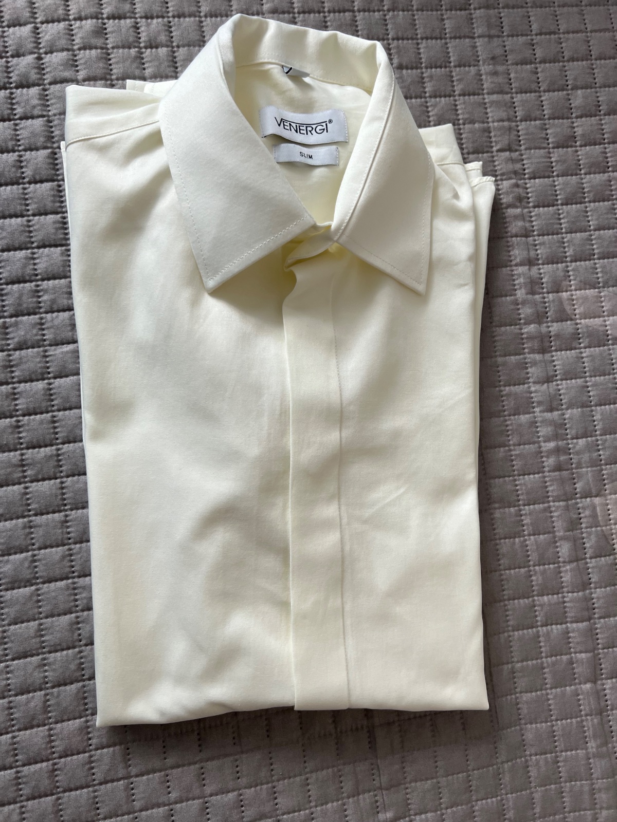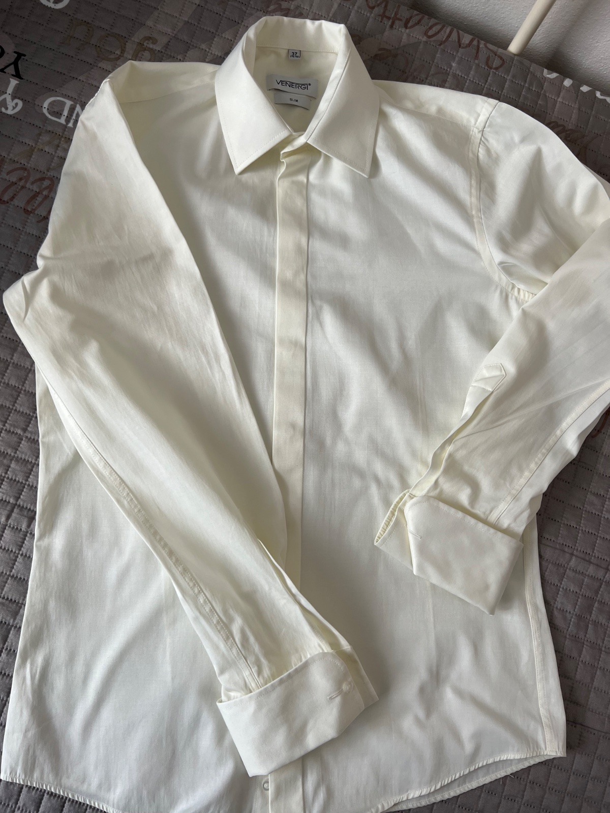 Elegantná košeľa oblečená 2x, veľmi dobrý stav. Jemnej krémovej farby, gombíky skryté pod légou, dvojitá manžeta, slim strih.