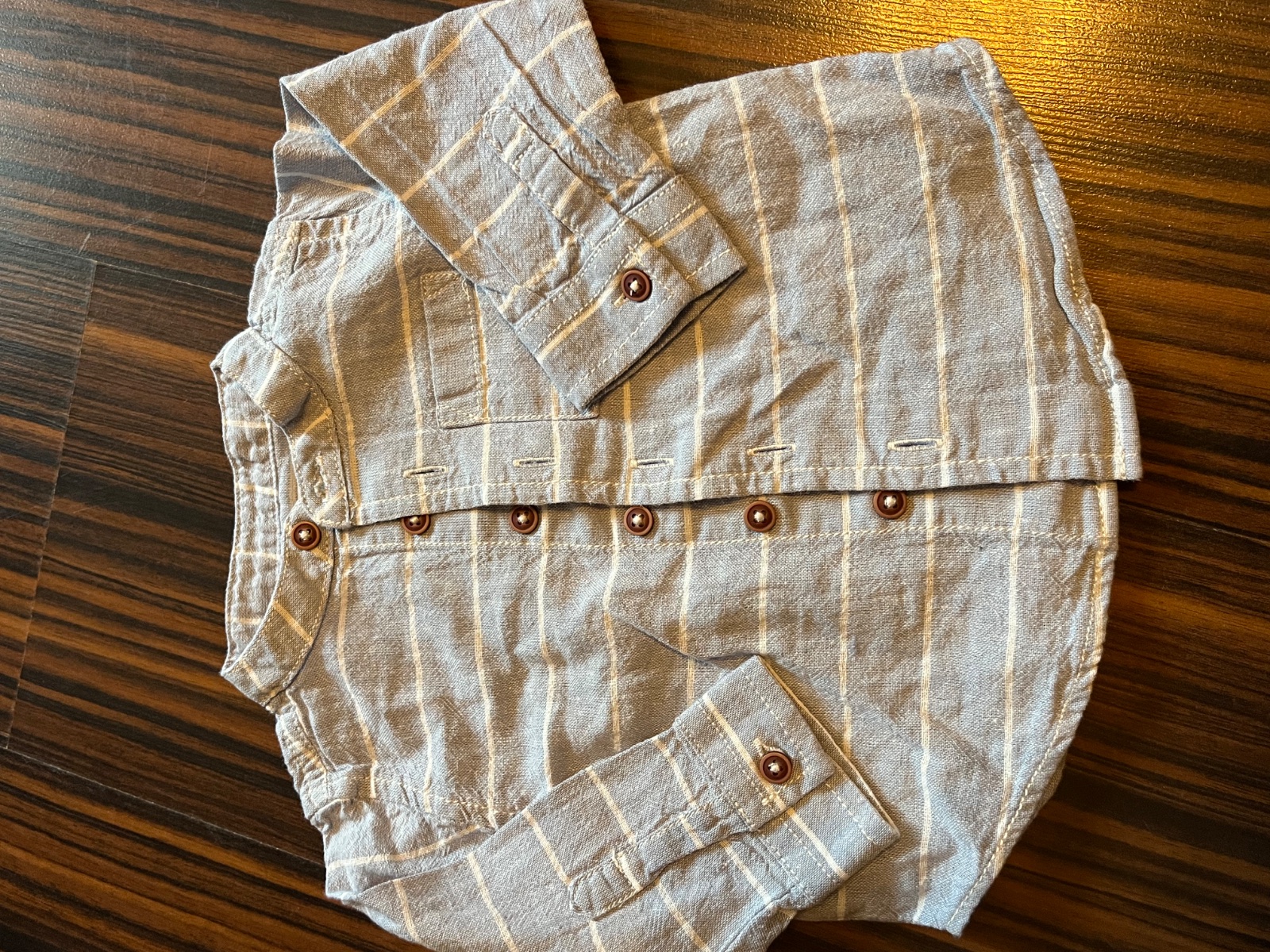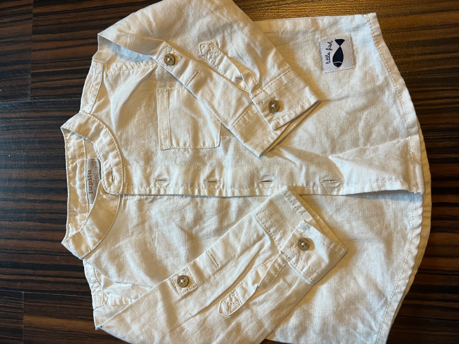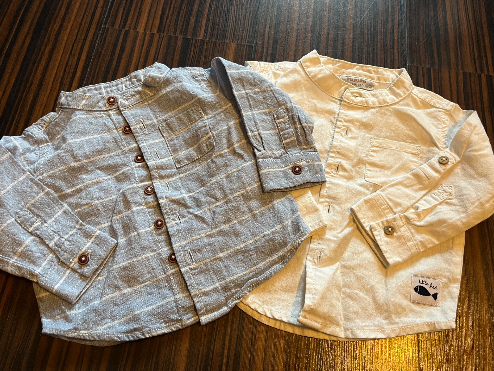 Ľanove košele 2 ks. Modrá - veľkosť uvedená 56, 1-2 mesiace, biela - veľkosť uvedená 62, 2-4 mesiacov. Obe nosene minimálne, top stav.