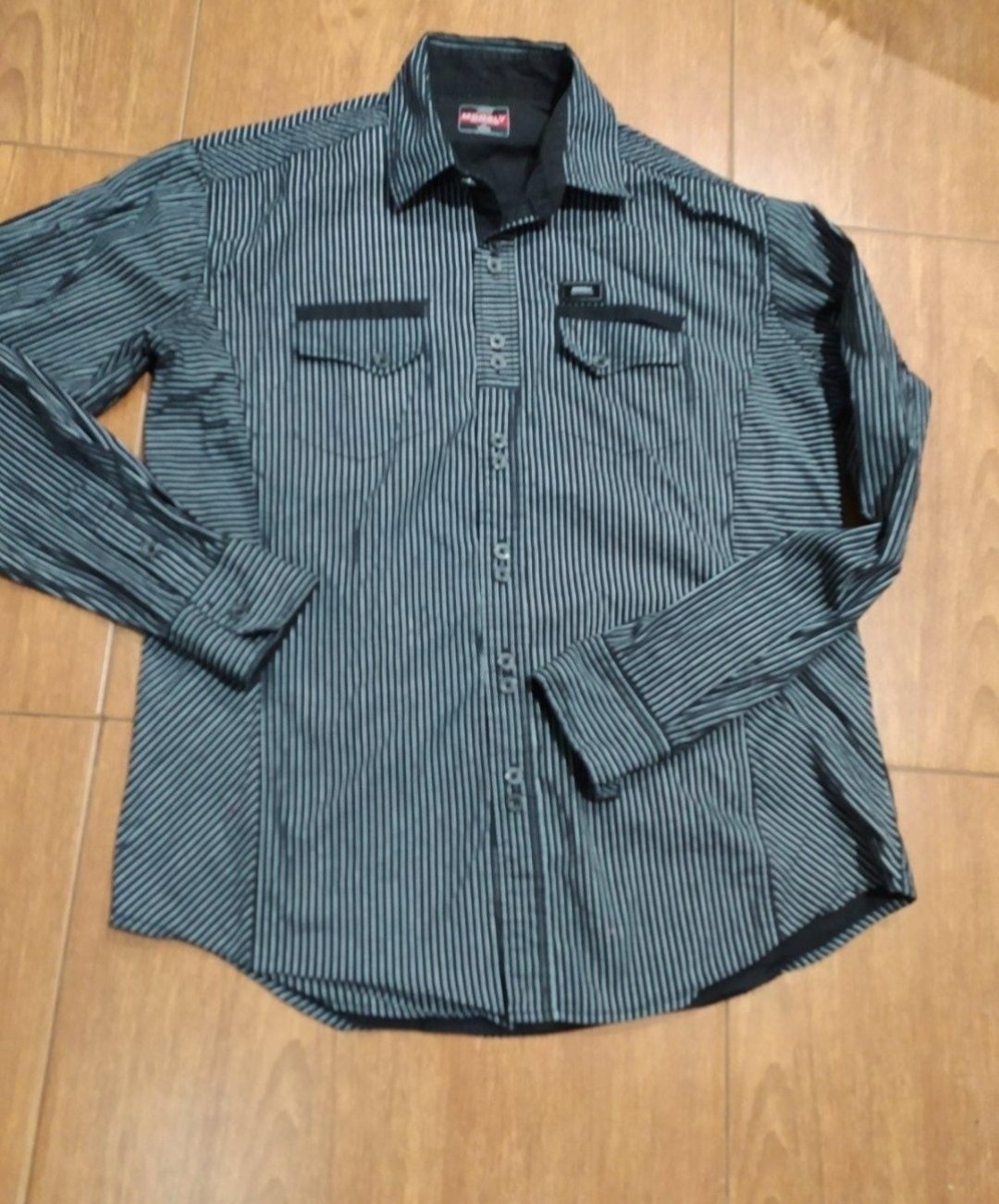Čierna pánska košeľa. Nosená v dobrom stave. Rozmery- šírka v podpazuší: 52,5cmx2, rukáv od goliera- 82,5cm, zadná dĺžka- 76cm Poštovné- Obyčajne 1,60€ alebo doporučene 2,50€.-